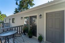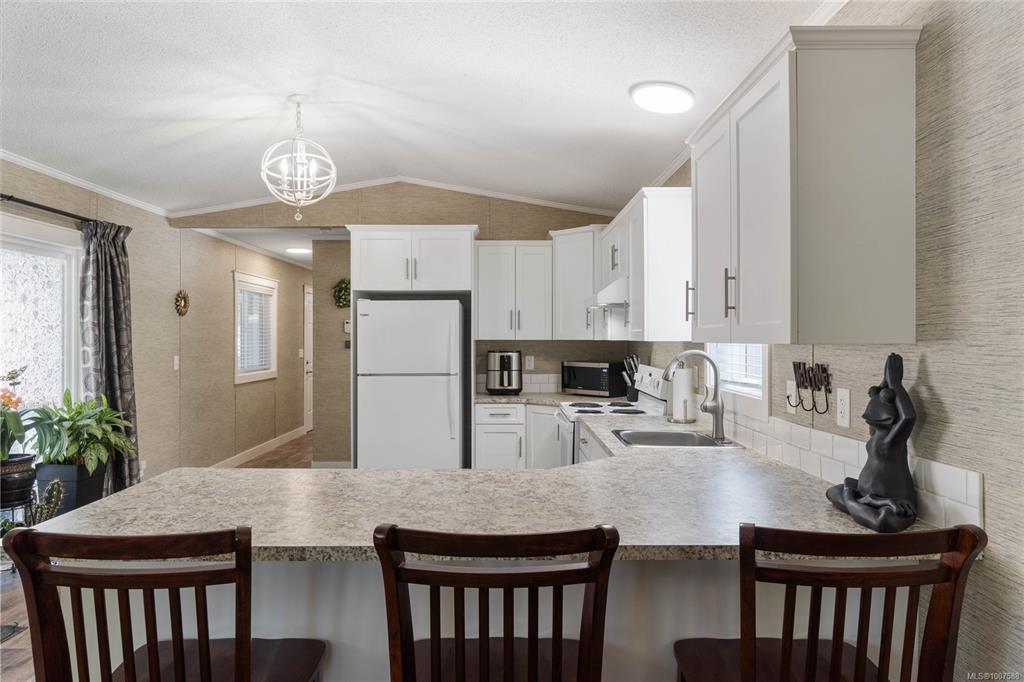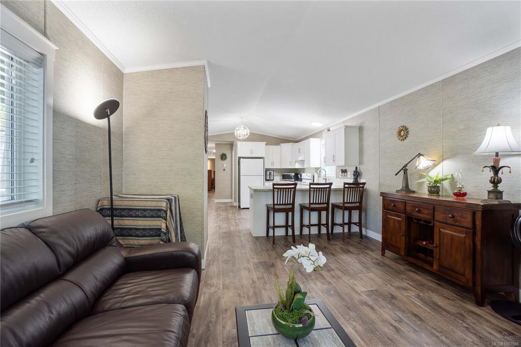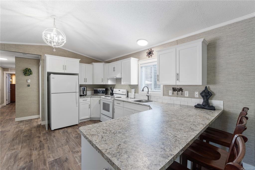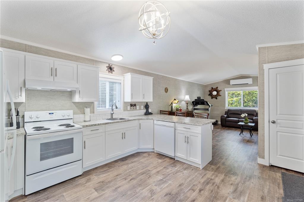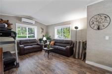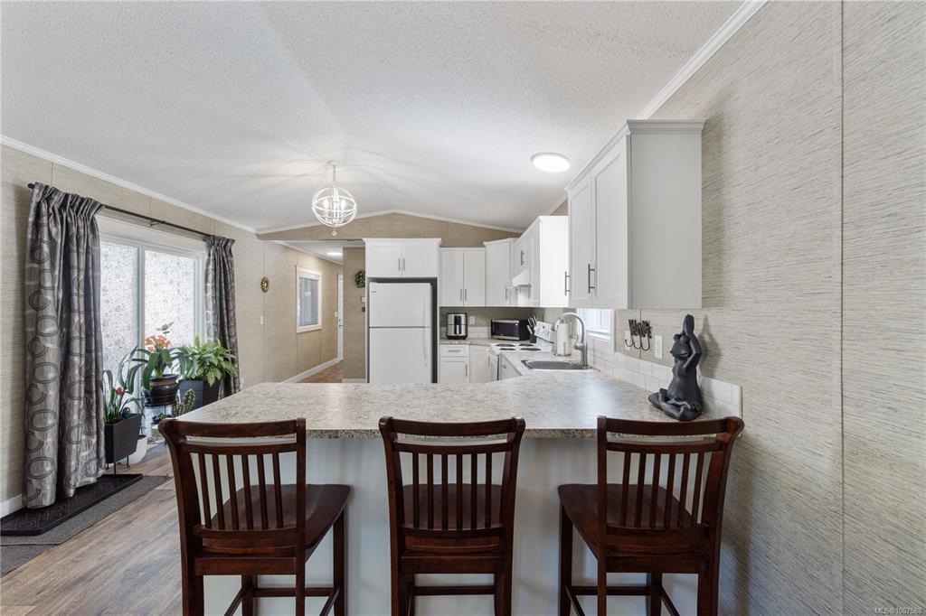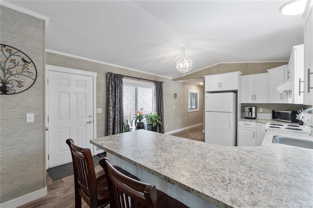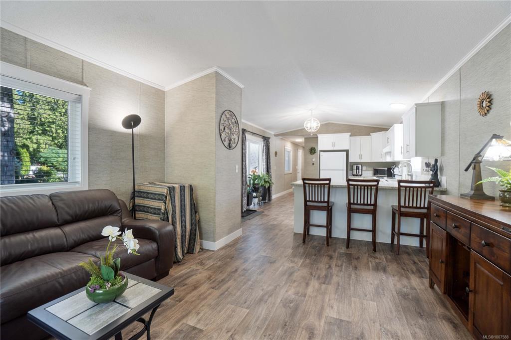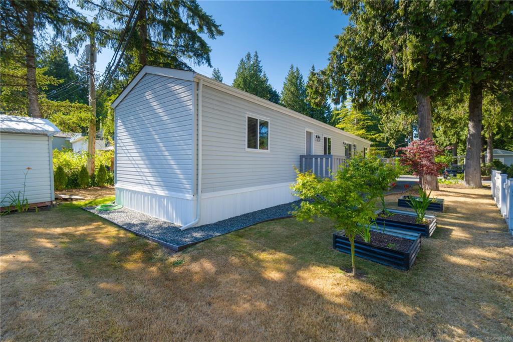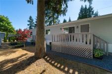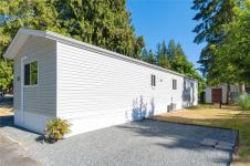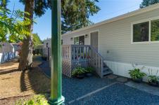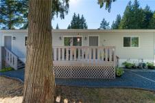 Nestled in the quiet and serene Seabreeze MHP sits this meticulously maintained 2019 built home. Upon entering the home you will immediately notice the open, airy feeling and ample amounts of daylight provided by the vaulted ceilings and numerous windows throughout the main living space. The kitchen is complete with modern finishings and bar seating, perfect for entertaining or casual dining. The primary bedroom features a huge closet for all your wardrobe needs, and the same beautiful textured wallpaper and modern flooring which run throughout the rest of the home. A second bedroom, bathroom, and laundry complete the space. Outside you will find a large deck, sizeable storage shed, beautifully tended to garden beds, and plenty of room for you to enjoy your quiet outdoor oasis. Although set amongst nature, you are only minutes from shopping, restaurants, ferries and the airport. Featuring a heat pump, gutter guards, and two off-street parking spots, this home truly has it all!