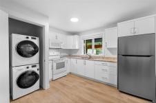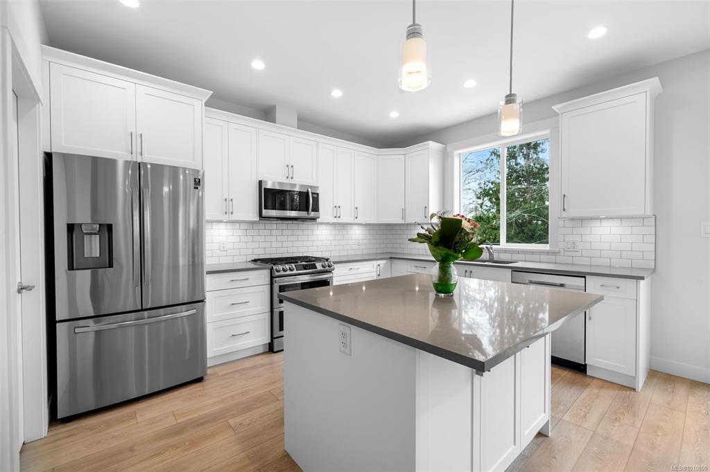 This beautifully crafted home unites style, comfort & function! Nestled beside greenspace & DeMamiel Creek, enjoy trail access from your own fenced yard—complete with a firepit for evenings under the stars. A spacious deck expands your living area, while a double garage & ample storage below offer space for all your essentials. Inside, the sunlit kitchen showcases white shaker cabinetry, quartz counters, a gas range, under-cabinet lighting & a walk-in pantry. The warm living space includes a gas fireplace—ideal for relaxing or hosting. A striking entry with an oversized door hints at the home’s smart design. The primary suite is your sanctuary with a walk-in closet & spa-inspired ensuite with soaker tub, dual sinks & separate shower. The large laundry room includes a handy sink! Plus, a legal one-bedroom suite with its own laundry adds income potential or room for guests. Don’t miss out on this gorgeous home offering nature, privacy & stylish modern living!