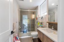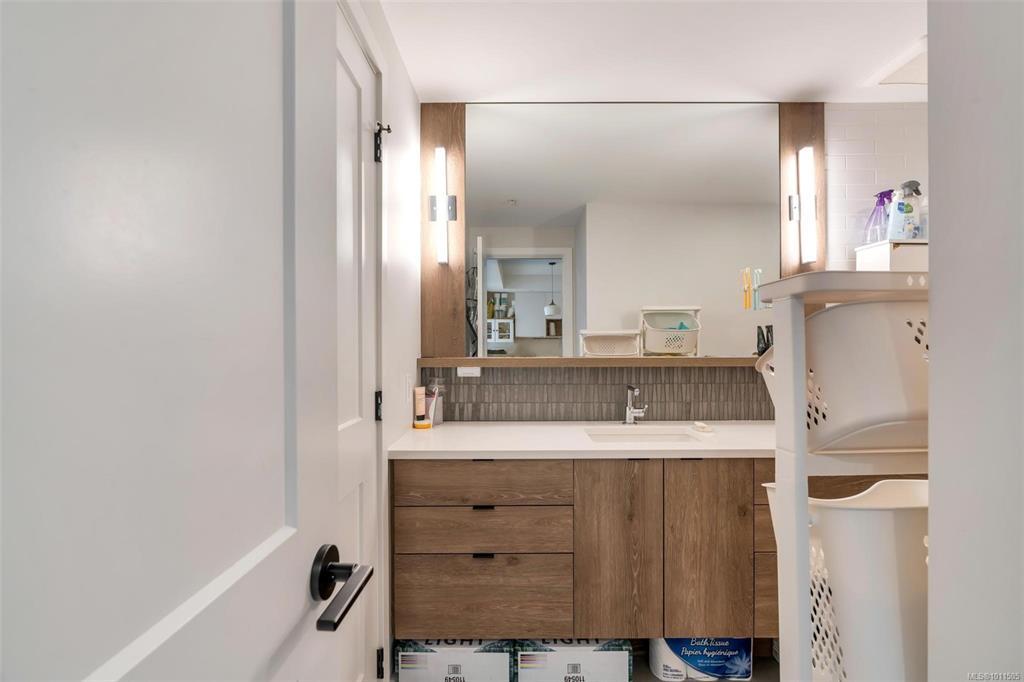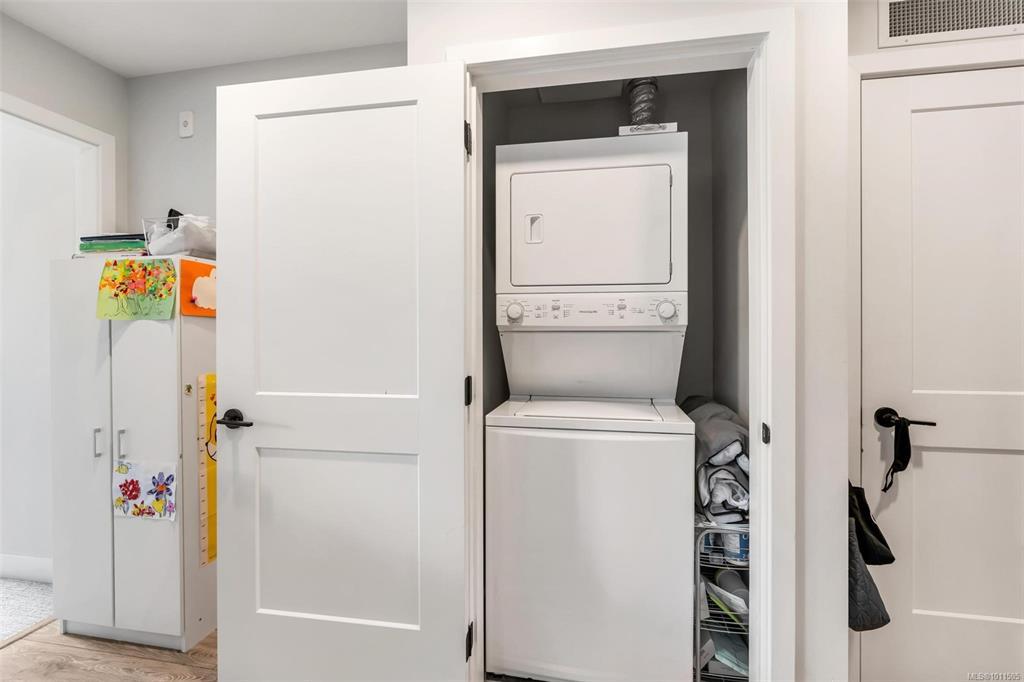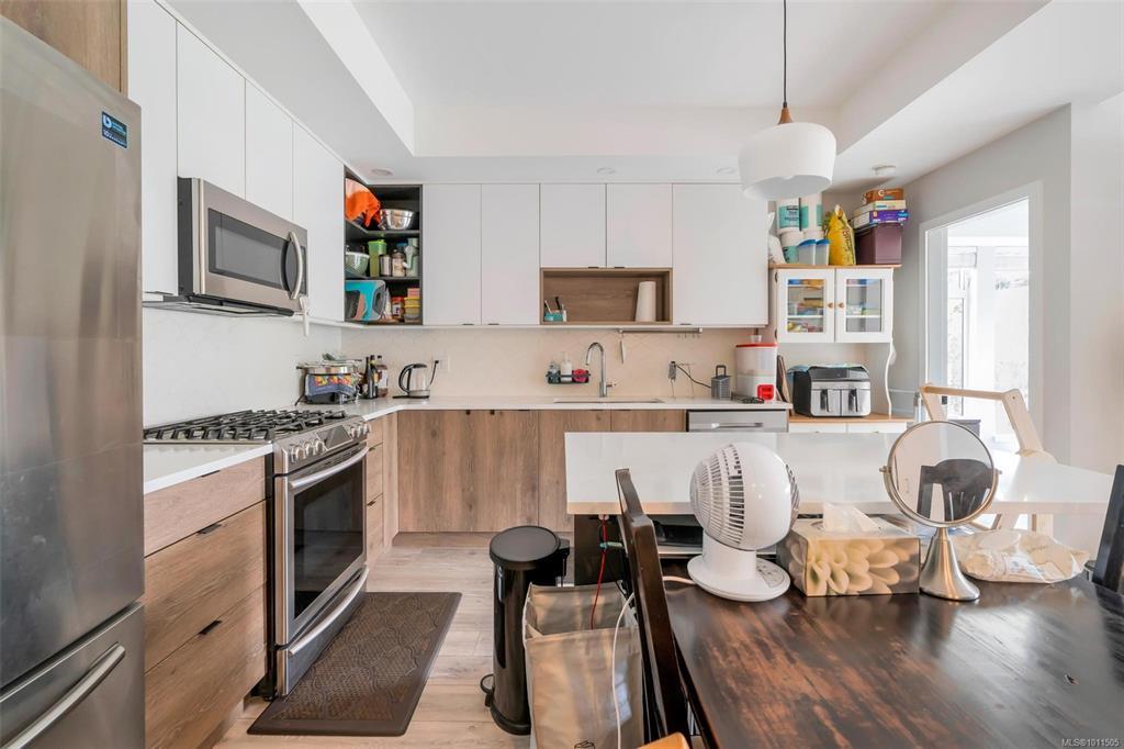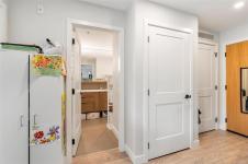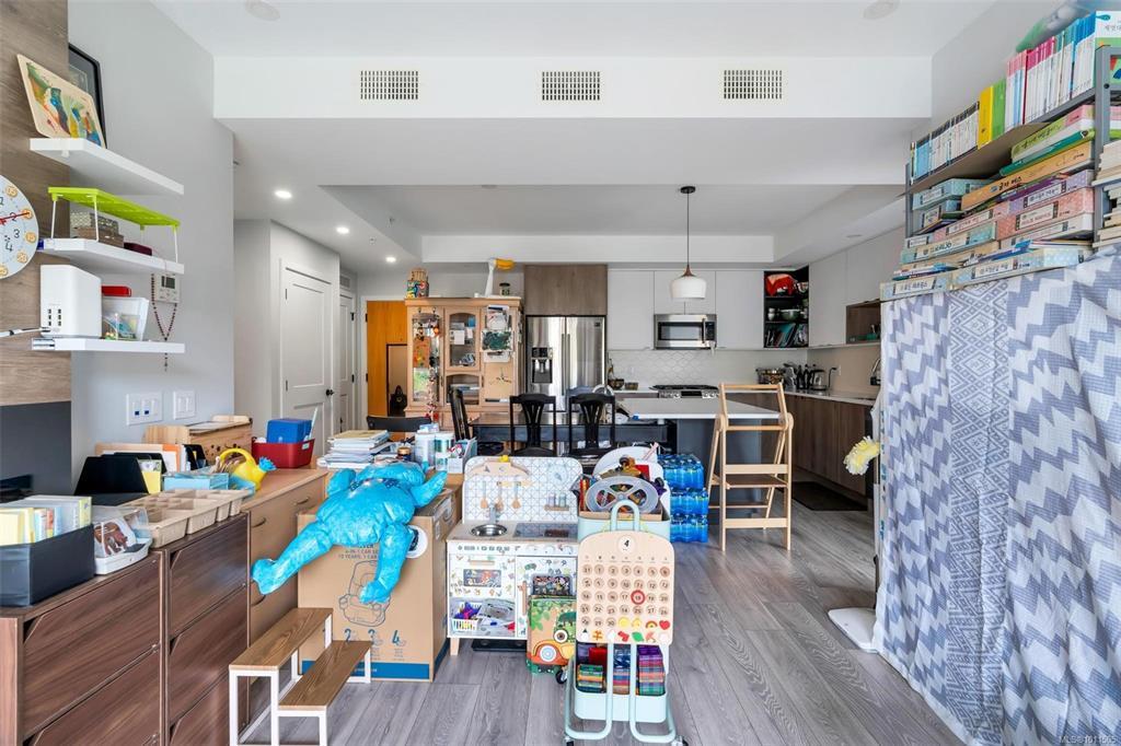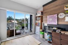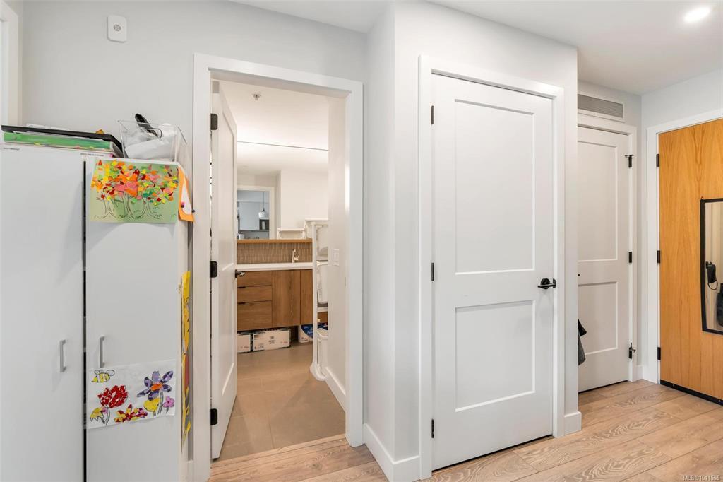 Bright and welcoming, this corner unit on the 3rd floor is a pristine two-bed, two-bath condo that feels new. The modern kitchen features premium stainless steel appliances, including a gas range, quartz countertops, and a large island with seating space. The living room includes a VRF heating and cooling system. Both bedrooms are spacious and ideal for families or those working from home. Enjoy your evenings on the spacious balcony, with secure access to one parking space and a storage locker. Located within walking distance to all amenities such as shopping, dining, and Costco, this pet-friendly unit provides access to a private gym.