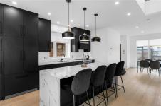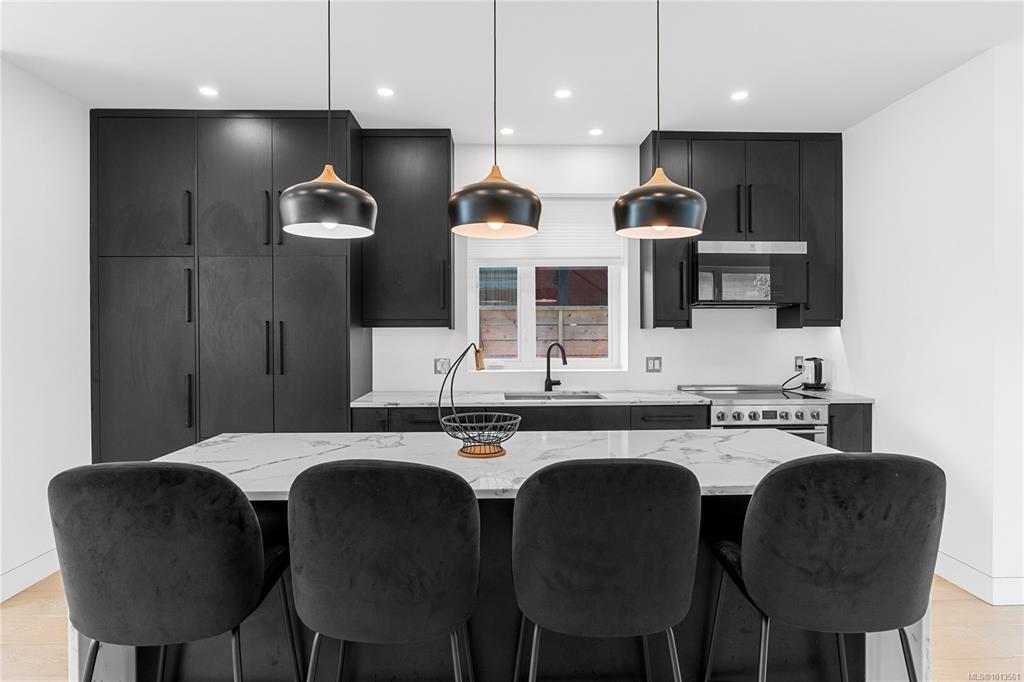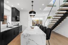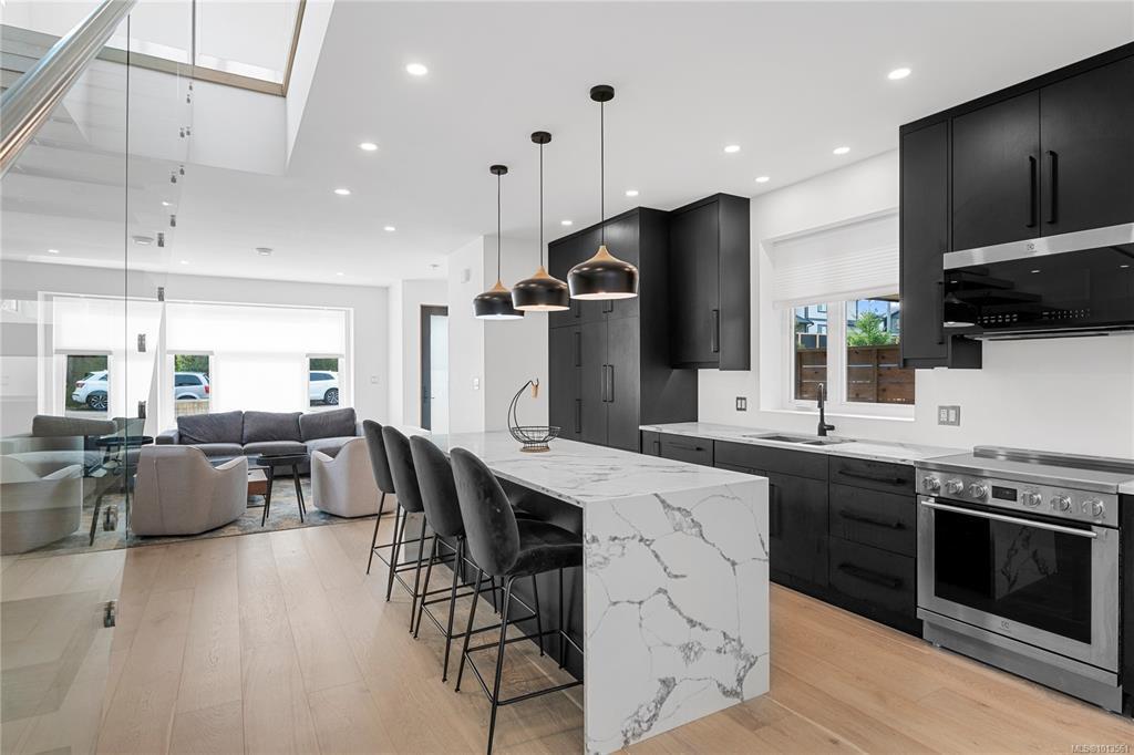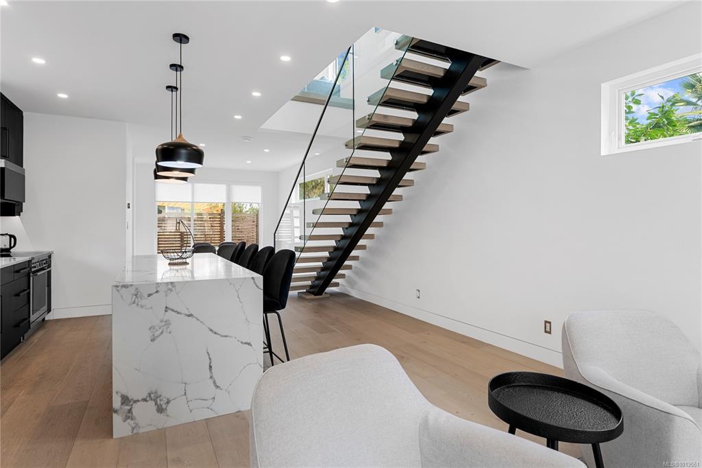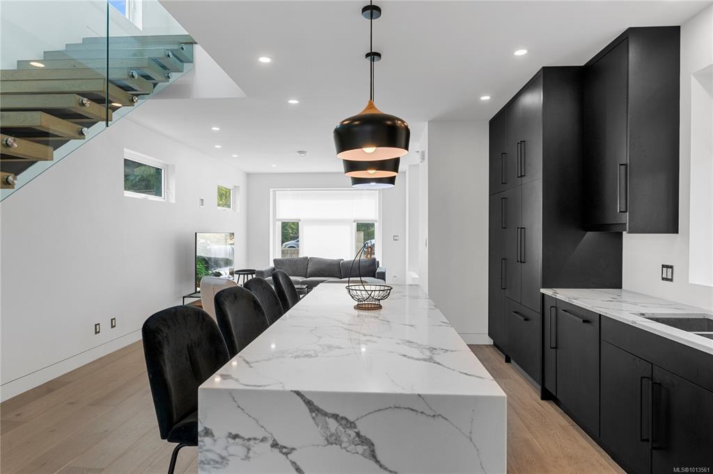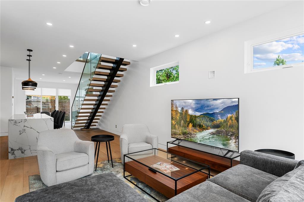 Contemporary 2-storey home in Duncan’s sought-after Berkey’s Corner, close to schools, shopping, and sports fields. Offering 1,774 sq. ft. on a 0.09-acre lot, this residence features an open-concept main floor with a chef-inspired kitchen: Fisher & Paykel panel-ready fridge & dishwasher, Electrolux induction range & microwave, custom soft-close cabinetry, and a waterfall marble island. The dining area opens to the patio, while the living room offers a bright, comfortable space. A sleek Duravit wall-mounted commode elevates the powder room. A striking floating staircase leads to 3 bedrooms and a family room with access to a private deck. The vaulted primary suite includes a spa-like ensuite with dual sinks, waterfall faucets, backlit mirror, and a fully tiled Steam Suite shower. Radiant in-floor heat, heat pump, and detached garage/workshop with plumbing for a shower plus outdoor kitchen amenities complete this stylish, low-maintenance home.