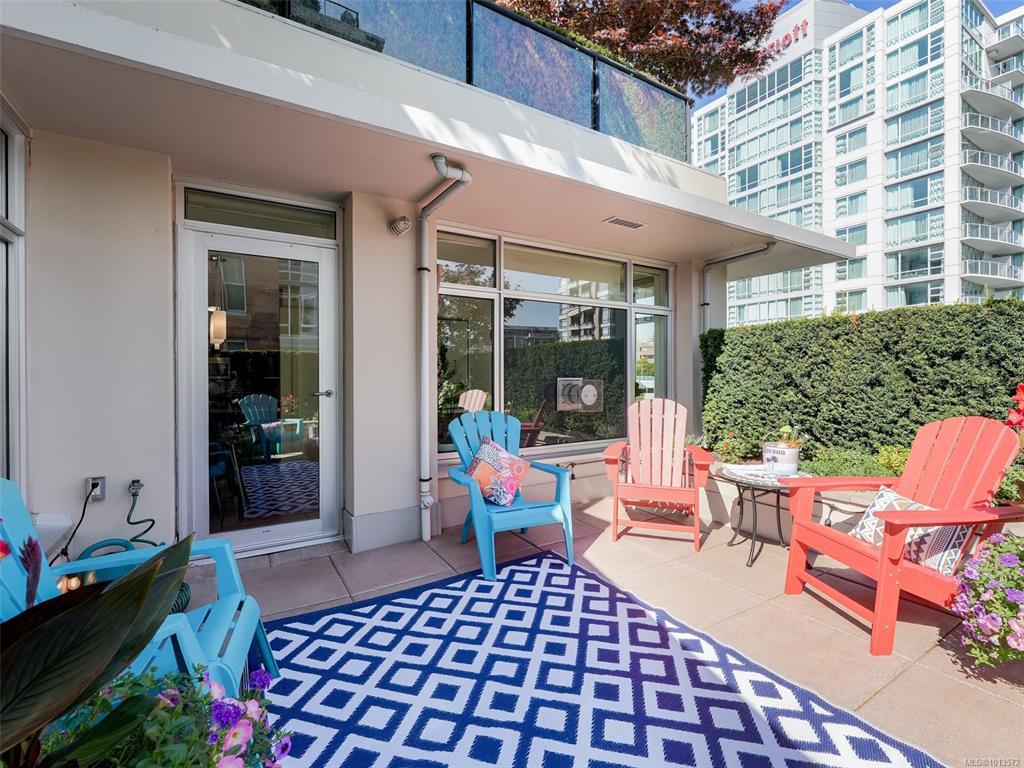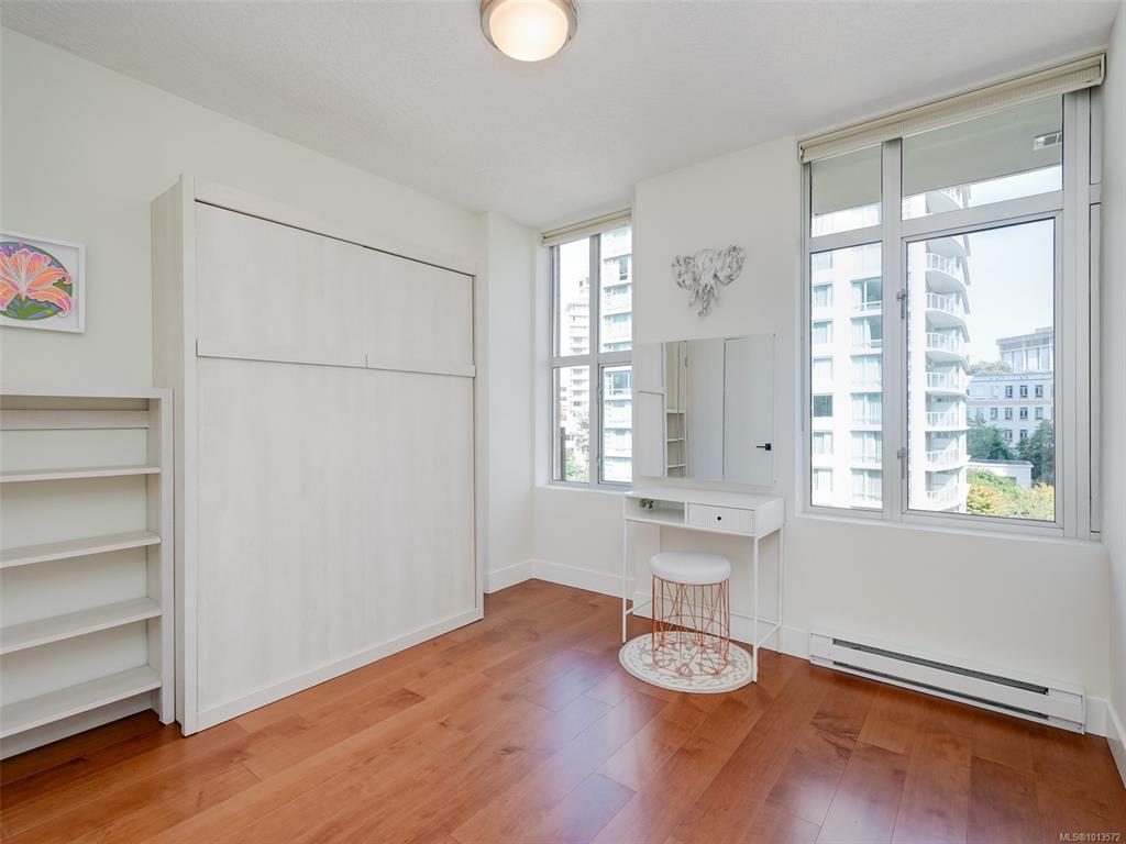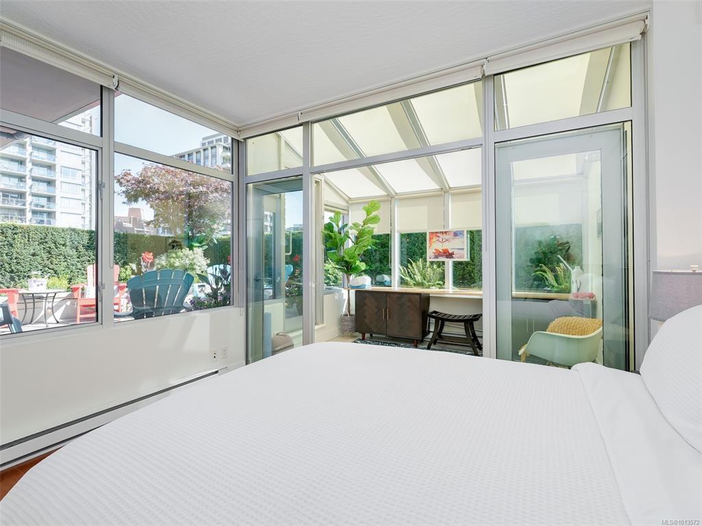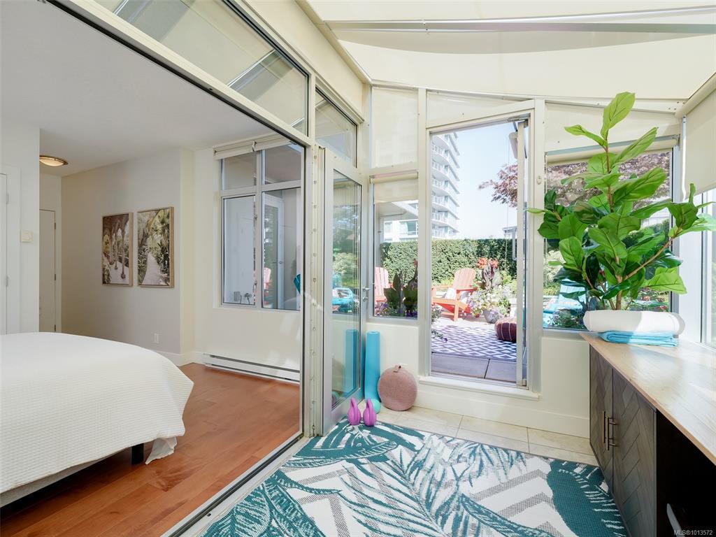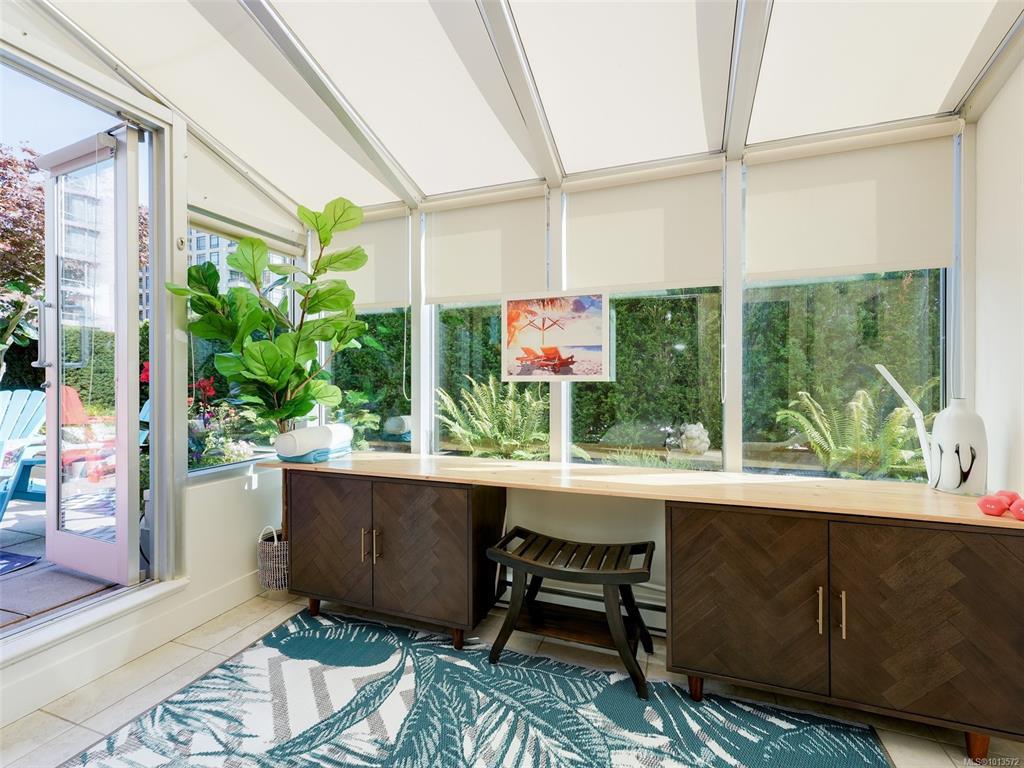 Discover refined living at Aria, one of Victoria’s most coveted addresses in the Humboldt Valley. This bright two-bedroom, two-bath corner suite is filled with natural light and features a versatile glass-enclosed sunroom—perfect as a dedicated home office, yoga space, or creative studio. A completely private 226 sq. ft. garden terrace extends the living space outdoors, offering a serene urban retreat. The thoughtful floor plan separates the bedrooms, with the second enhanced by a custom Murphy bed for added flexibility. Move-in ready and tastefully appointed, this home is ideal for those seeking a balance of work and lifestyle. Residents enjoy a strong community, with concierge service, fitness centre with sauna, lounge, workshop, secure parking, and vibrant social clubs including book, walking, and craft groups. Pet-friendly with no size restrictions, Aria blends sophistication, convenience, and connection in the heart of downtown Victoria. Truly a wonderful place to call home!