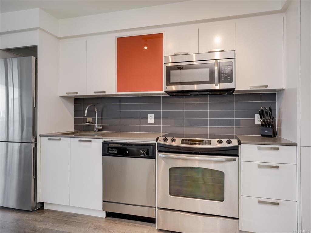 BEST VALUE IN THE BUILDING - LARGE BALCONY WITH MOUNTAIN VIEWS AND CHINA TOWN - UNDERGROUND PARKING - SEPARATE STORAGE. Situated in the heart of Chinatown this property is steps away from all amenities such as gyms, shopping, coffee shops, restaurants, the inner harbour and so much more. Boasting a modern aesthetic this condo includes an upscale kitchen with stainless steel appliances, quartz countertops, laminate flooring, floor to ceiling windows, New in-suite washer and dryer, ample storage space, 1 underground parking stall, exterior storage, and a generous private patio that looks over Chinatown. You don't want to miss taking a tour of this open concept living home.