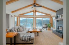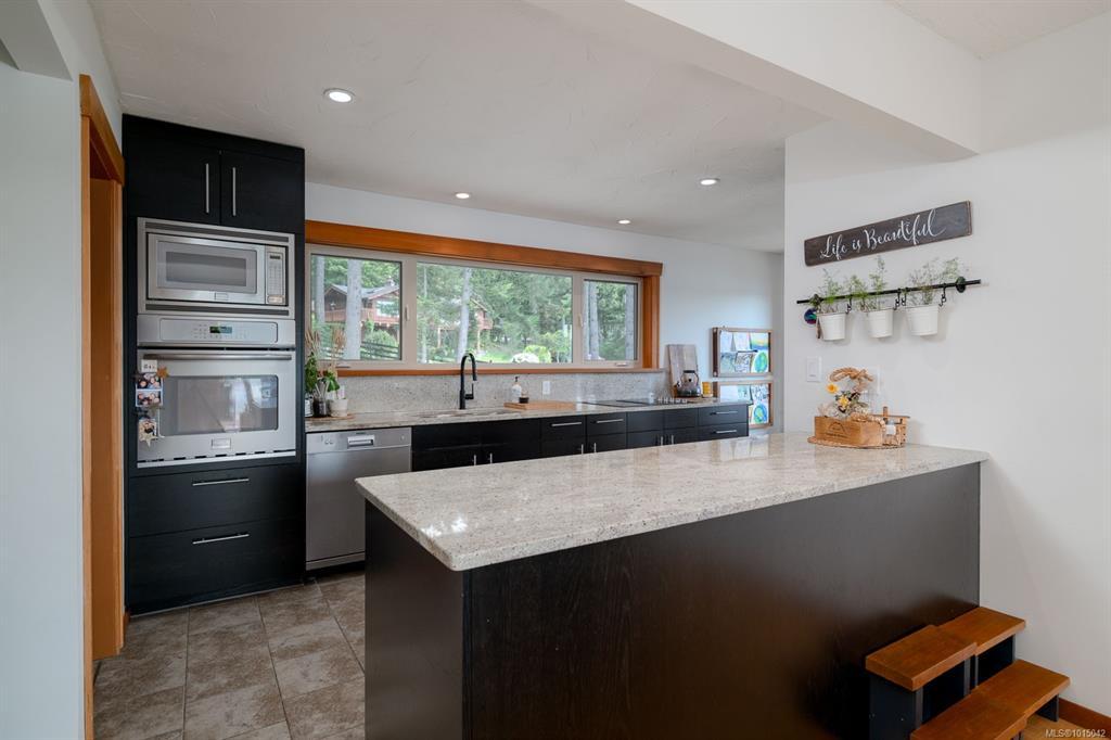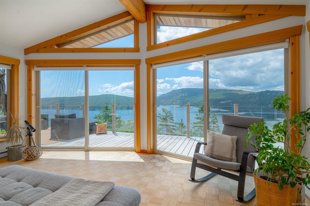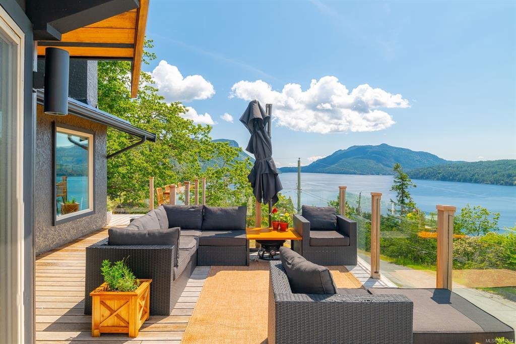 Arguably the most breathtaking oceanview home in Maple Bay, this 1,737 sq. ft. rancher rests on a natural rock outcrop with southern exposure, delivering panoramic views from sunrise to sunset. Inside, vaulted beamed ceilings and floor-to-ceiling windows highlight the stunning scenery. The kitchen boasts granite counters, complemented by a formal dining room ideal for entertaining. The living room features a cozy wood heater, while wood and tile floors add warmth throughout. The master suite on the west side includes a unique ensuite bathroom and spectacular views. Set on a .8-acre gated lot, beautifully landscaped with gardens, lawns, Fir and Arbutus trees, this peaceful retreat also offers a spacious 2-car garage and an expansive 900+ sq. ft. wrap-around deck with a hot tub overlooking Maple Bay, Birdseye Cove marinas, and Burgoyne Bay on Salt Spring Island. This home perfectly captures the essence of coastal living.