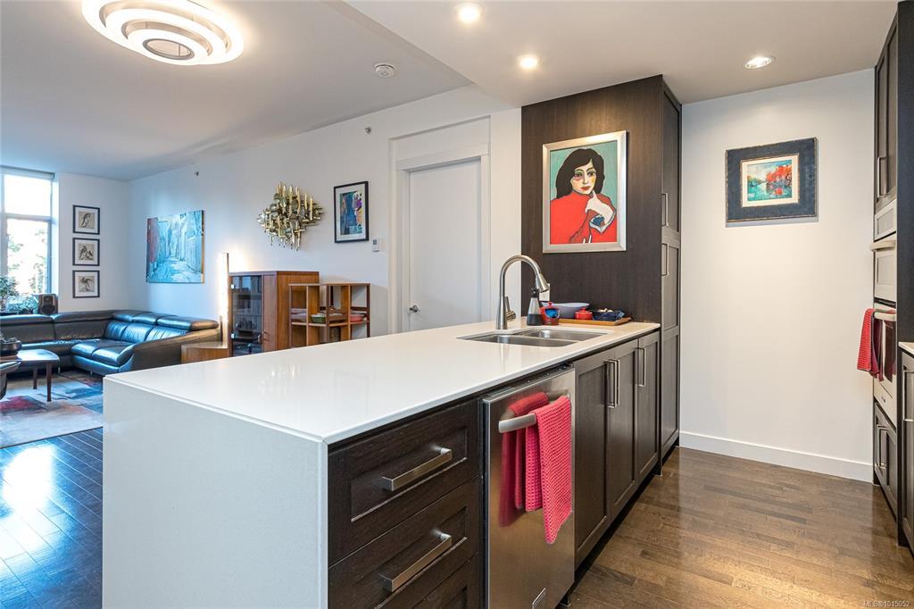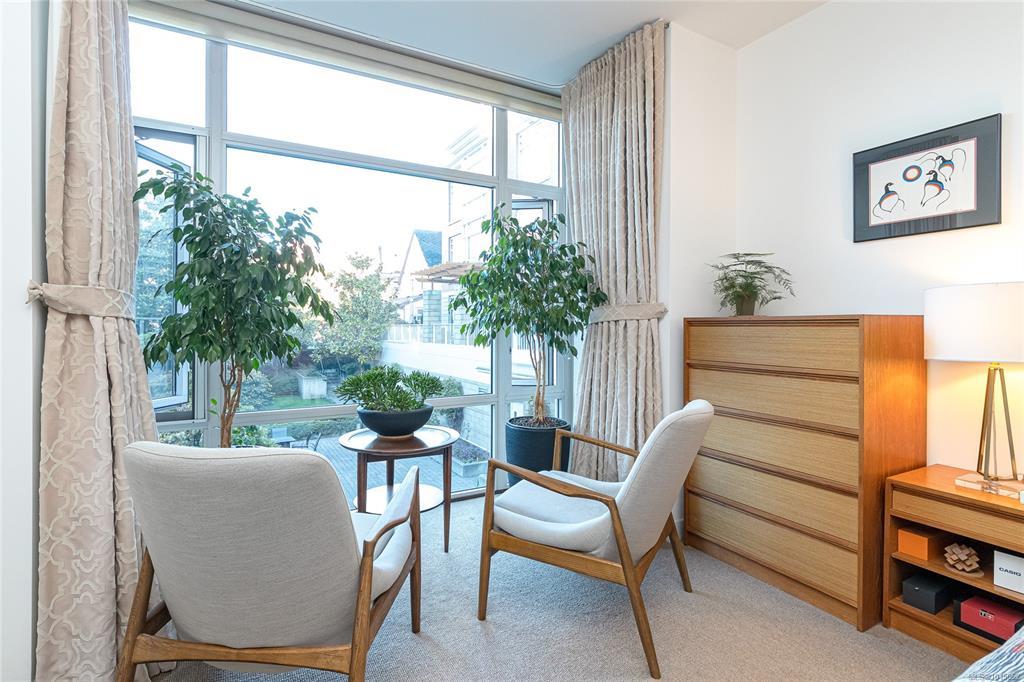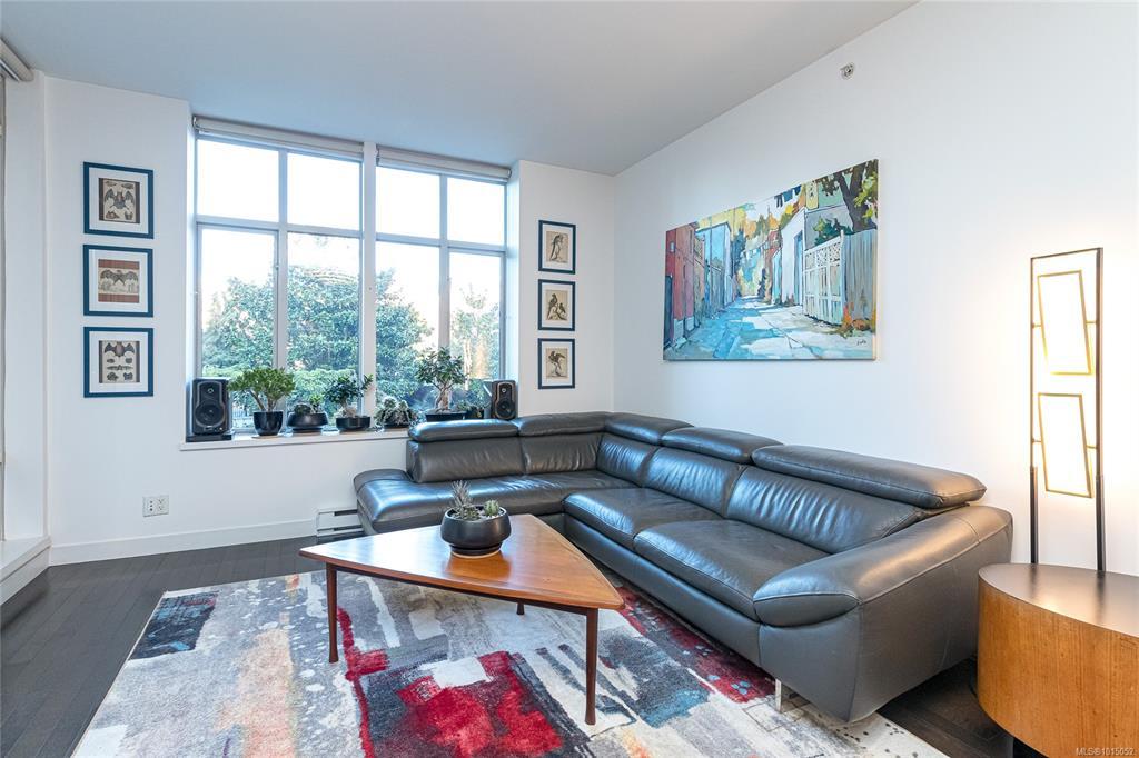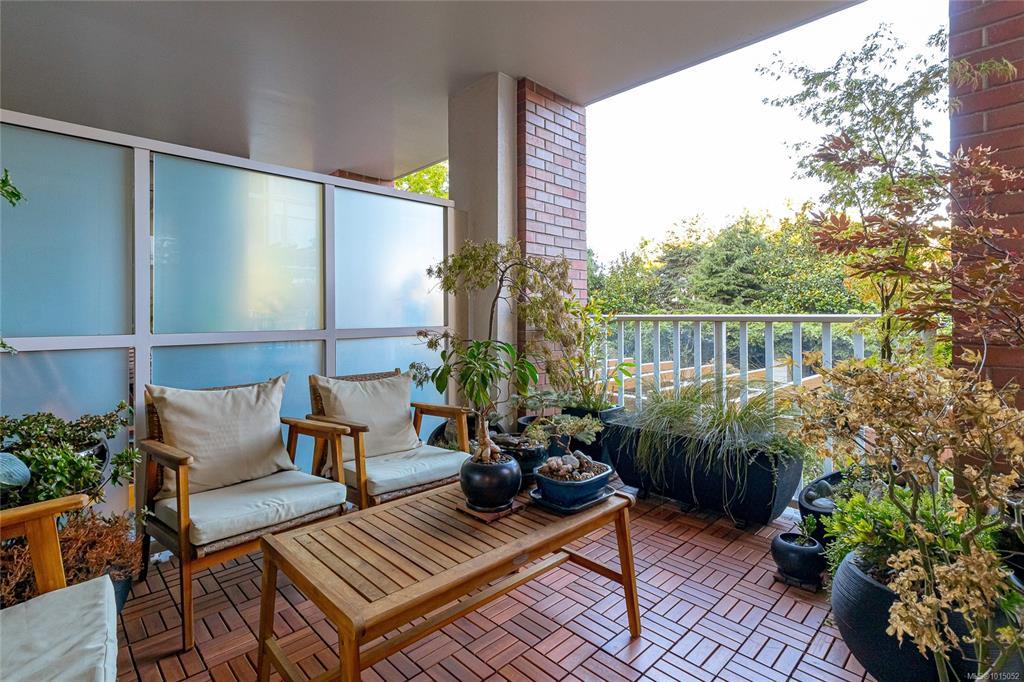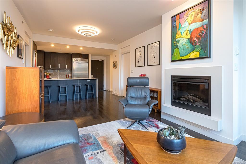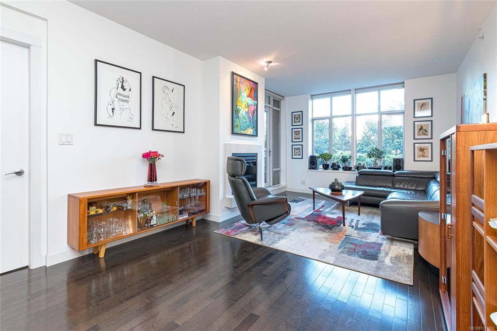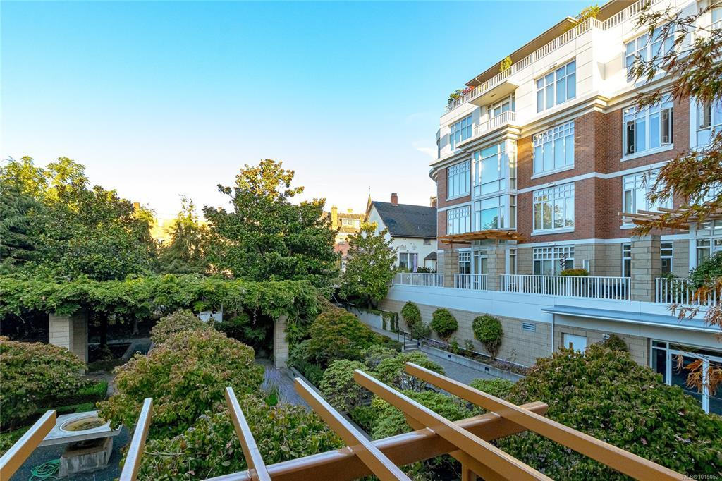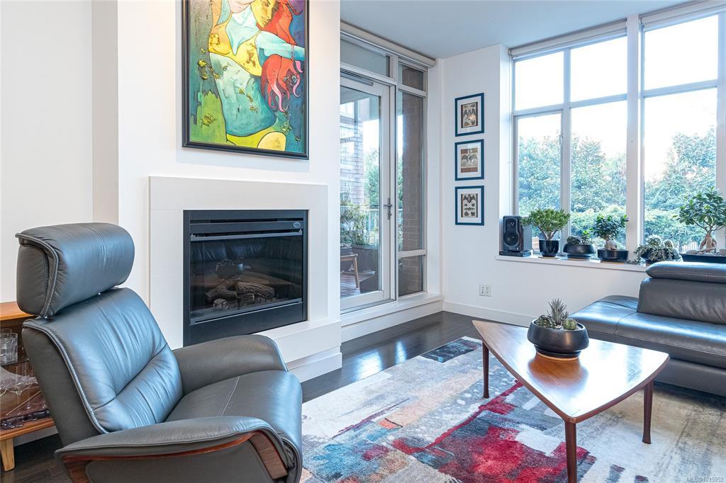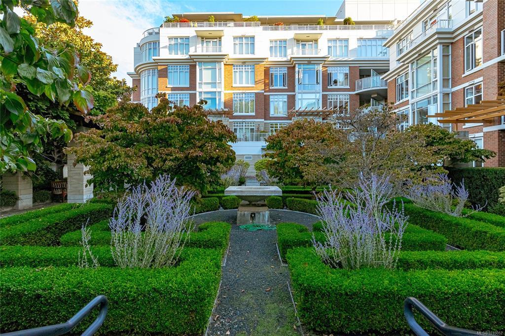 This unit is on the quiet side of the building overlooking the well-maintained courtyard gardens. Concrete & steel construction! A city OASIS, with 2 generous sized bdrms separated by an open-living plan, and~9ft ceilings. The kitchen has quartz countertops, KitchenAid SS appliances, lots of cabinet/counter space, & a newer garburator. Other features include classy engineered hardwood floors, 2 underground secure parking spots (EV-Ready), storage locker, covered deck with wooden tiles, new washer/dryer, electric fireplace, & floor-to-ceiling thermal windows. The well-run Chelsea building also offers a private gym, lounge, & caretaker. Superb location- just a stroll/cycle to Downtown, Cook Street Village, Beacon Hill, Inner Harbour, & Dallas Rd Waterfront. 2 pets OK & rentals permitted. A rare find and outstanding value in today’s market. Must be seen to really appreciate.