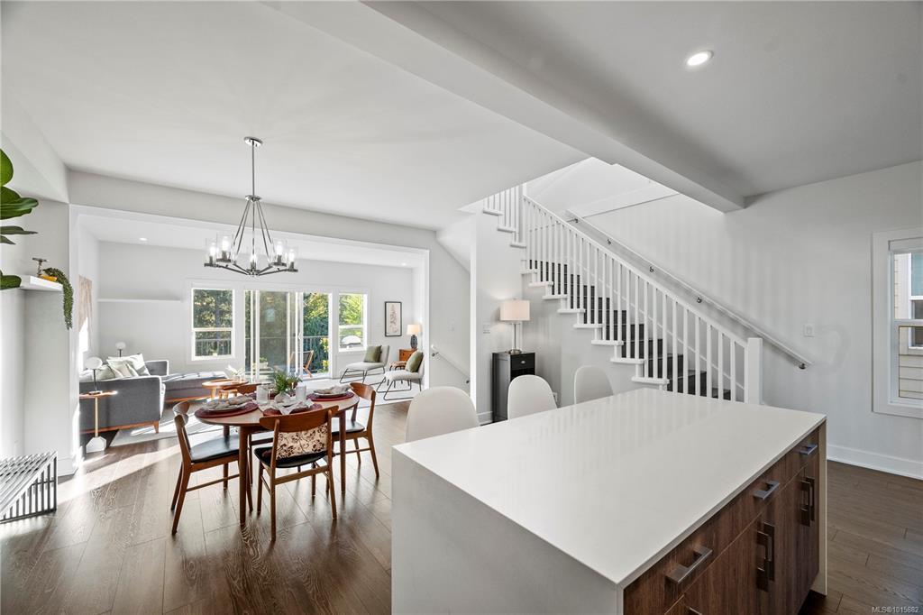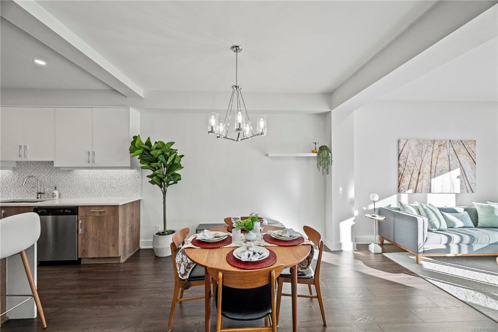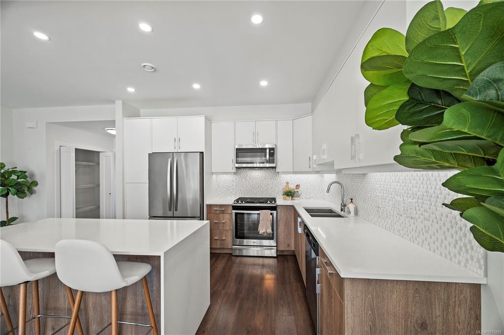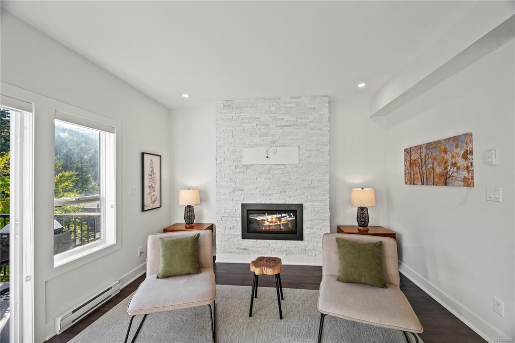 *Open House Sat 2-4* South facing 4 bed, 3 bath corner townhome set on a quiet no-through street surrounded by nature. Upgraded with: premium tile & wood flooring throughout (no carpet), quartz waterfall island, gas stove & fireplace, pantry, stainless steel appliances. This layout has an incredible flow: entry level with a family/media room that opens to a covered patio & beautifully landscaped, fully fenced backyard. Main level with: 4th bdrm, powder rm, open-concept kitchen/dining/living rooms leading out to a deck with unobstructed views of Mt. Wells. The upper level has an oversized primary with walk-in closet & luxurious ensuite. Hot water on demand, single garage + driveway parking. Ideal location: steps to trails, Rhino Coffee & Jordie Lunn Bike Park,YMCA, Langford Lake, bowling, bus service, shopping & quick highway access to Victoria, Sooke & up-Island. Walk to beautiful new schools: Pexsisen Elem, Mt.Lellum Middle & Belmont Sec. Don’t miss this one. Reach out today to view!