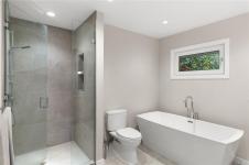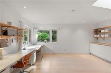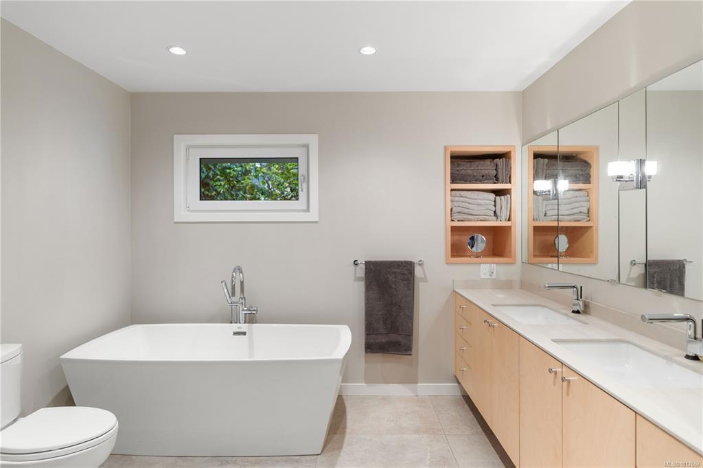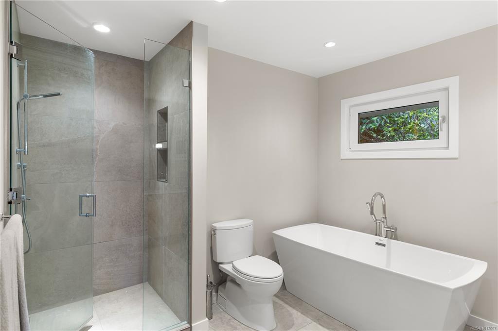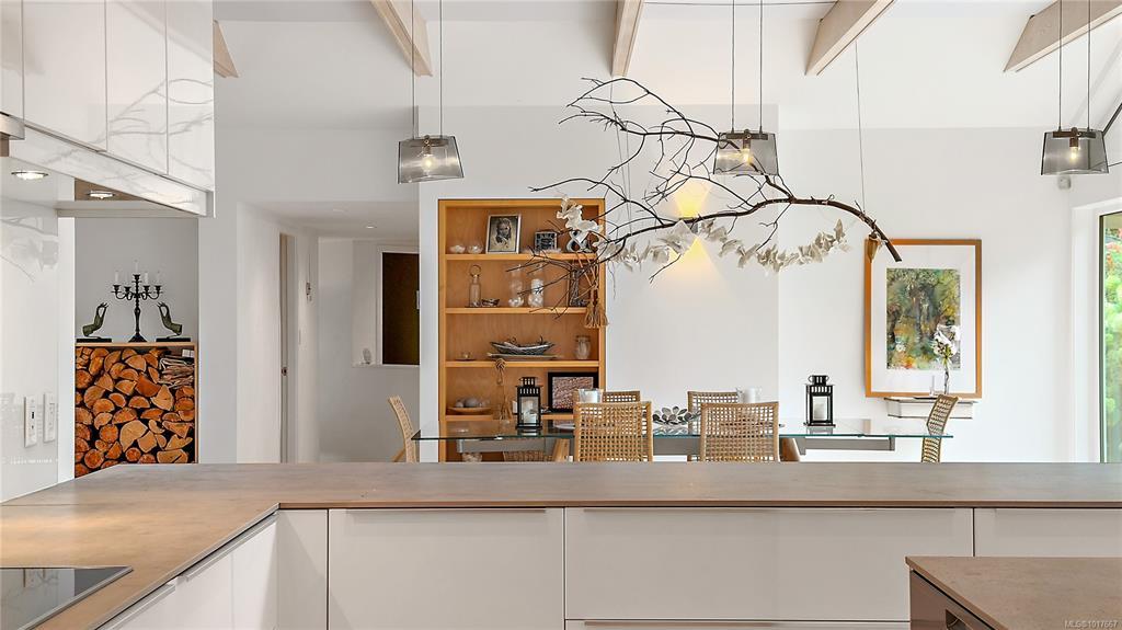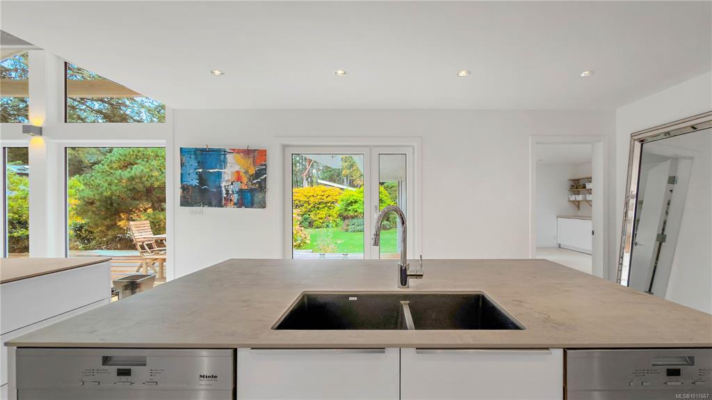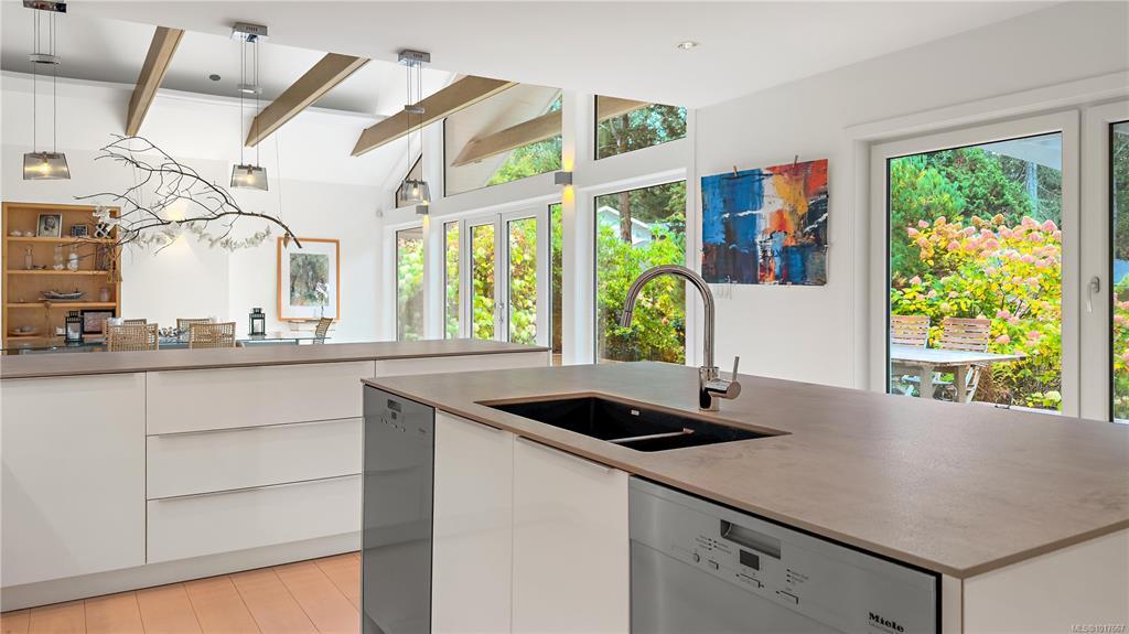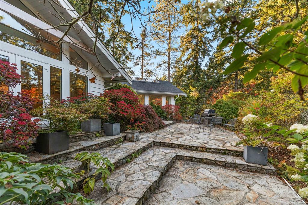 A hidden Queenswood sanctuary on 1.8 fenced acres, reimagined in 2015 by Canadian/Danish architect Chris Foyd for a serene Scandinavian, resort-style life. On a street locals call the 'Uplands for introverts,' this essentially one-level home is bright and airy, anchored by a skylit primary bedroom where you can fall asleep under the stars. The chef’s kitchen showcases Spanish Neolith counters & Miele appliances, including a steam oven, two dishwashers, plus generous storage. Year-round comfort comes from a heat pump/AC, added insulation, Euroline tilt-turn windows, a gas fireplace, and a Jøtul wood stove. Outdoors, white-slate terraces & cedar decks flow into a forest garden with hundreds of rhododendrons & Japanese maples framed by Douglas fir, arbutus, and Garry oak. An insulated/heated 10×10m garage & guest house add flexibility. Steps to the ocean, a stroll to Pepper’s Foods, and close to UVic and top schools. Exceptional privacy and additional suite potential.