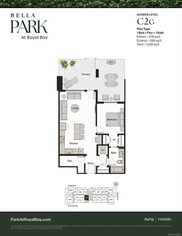 Step into the heart of Royal Bay’s vibrant seaside community at Bella Park, crafted by award-winning PATH Developments. This thoughtfully designed 1-bedroom + flex, garden-level home blends style, comfort, and functionality. The versatile flex room is perfect for extra storage, a dreamy walk-in closet, or a cozy reading retreat. Enjoy over-height ceilings and a large walk-out terrace offering a private entrance—ideal for pet owners. The modern kitchen features quartz countertops, stainless steel appliances, an induction cooktop, and ample storage. Residents enjoy resort-style amenities, including a Clubhouse with a full kitchen and social lounge, fitness centre, yoga studio, co-working space, wellness spa with an outdoor hot tub, sauna, cold plunge, and shower, kayak storage and 2 guest suites. Set within 2+ acres of green space with walking paths and community gardens, just steps to the beach, walking trails, and all of your everyday amenities at the Commons. Price + GST.