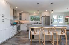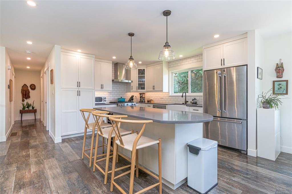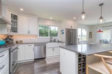 Fabulous family home in a prime location where rural charm meets urban convenience. This fully renovated, open-concept home features a stylish farmhouse kitchen with shaker cabinets, subway tile backsplash, stainless steel appliances, a Kitchenaid gas range, and a large island perfect for gathering. The bright living room with wood-burning F/P. 3 bdrms on the main, including a spacious primary with 2pc ensuite and an updated 4pc main bath. Downstairs offers excellent flexibility with a family room, 4th bdrm, 3pc bath, plus a 5th bdrm or home office, laundry area and mudroom. Enjoy afternoon sun on the S/W-facing upper deck or relax on the lower patio. The fully fenced, beautifully landscaped private backyard features raised garden beds, fruit trees, herbs, and drip irrigation. Additional features include newer vinyl windows, updated lighting, heat pump, gas furnace, and a bonus garage. Walkable to country roads and trails, yet close to shops, restaurants, and easy highway access.