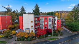 Open House Sun 1-3pm | Bright 2Be/2Ba condo in one of Saanich’s most sought-after areas. Ideal layout features rooms on opposite sides of the living room, each w/its own bathroom. Perfect for privacy when hosting, roommates, or home office. Relaxing open&inviting space w/8'10" ceilings, new laminate flooring&an abundance of natural light. Modern kitchen w/stunning Macassar Ebony cabinetry, quartz countertops, BOSCH appliances&large island w/ample storage. Living room has an electric FP for cozy atmosphere&opens to large patio, perfect for unwinding or BBQs. Spacious primary bed w/generous walk-through closet leads to a full ensuite. 2nd bed is well-sized&next to the main bath w/ deep tub/shower combo. PLUS in-suite laundry, a large EV-ready parking spot, a designated bike rack&storage locker. The Brix is a well-managed, pet&family friendly building (2dogs or 1cat&1 dog). Steps to Saanich Centre, Lochside Trail, UVic, major bus routes&essential amenities. Quick possession available!