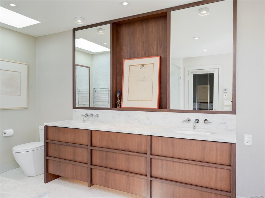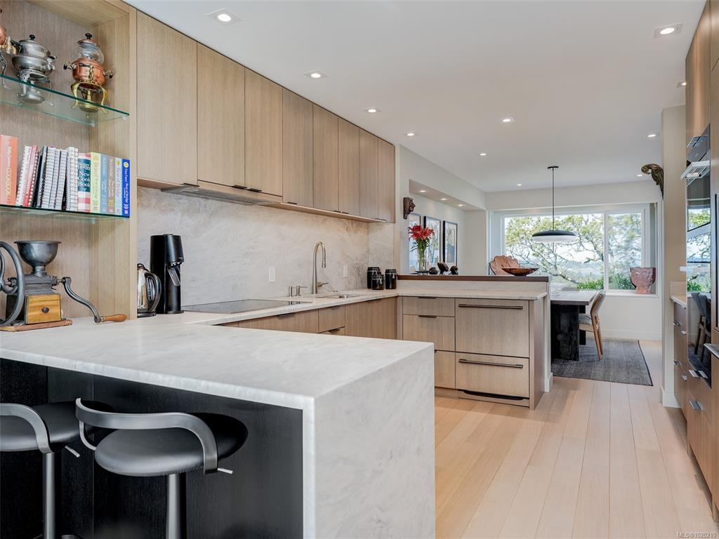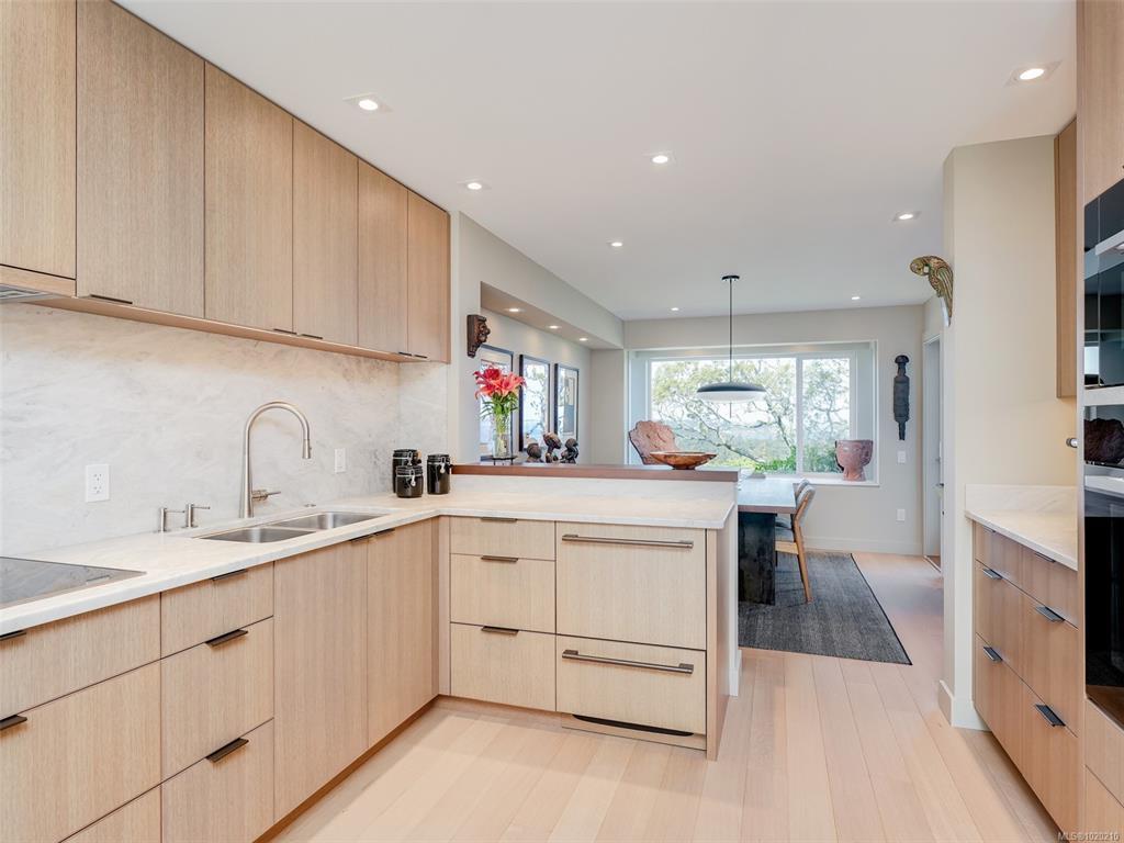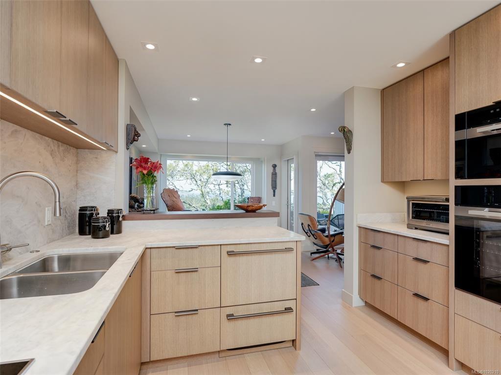 WINNER OF A 2025 SILVER CARE AWARD - JUST ONE LOOK & YOU KNOW THIS HOME IS TRULY SPECIAL! A stunning transformation that was completely redesigned & reimagined! Taken back to the studs & elevated to the highest standards w/ careful attention & commitment to craftsmanship. Just a few of the many features include European white oak flooring, pot lights throughout, custom white oak solid wood cabinets, natural Italian stone countertops, fireplace w/ white oak mantle & stone facing, custom built-in shelving & built ins with closets. 3 bedrooms plus den-3 bath, approx. 2200 sq. ft., with ocean & Mt. Doug. views. Located in prestigious Wedgewood Estates, a desirable gated community set on 16 private acres that includes a clubhouse, indoor pool, hot tub, sauna, tennis court & separate RV parking. A stroll to nearby Cadboro Bay Village, Gyro Beach & Telegraph Cove. This is a once in a lifetime opportunity to own a special home w/ exceptional livability & design.