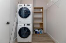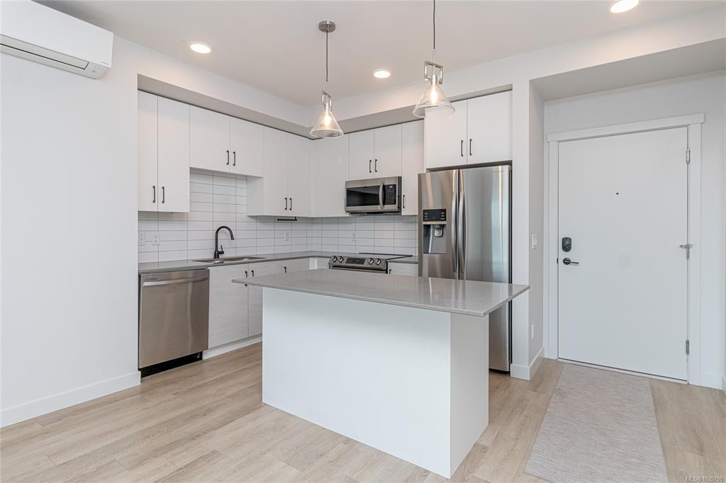 The kitchen features energy-efficient appliances, quartz countertops, and sleek contemporary finishes, while LED lighting throughout the unit boosts both ambience and efficiency. Enjoy the convenience of two dedicated parking stalls, ample in-suite and secure bike storage, plus on-site EV charging.