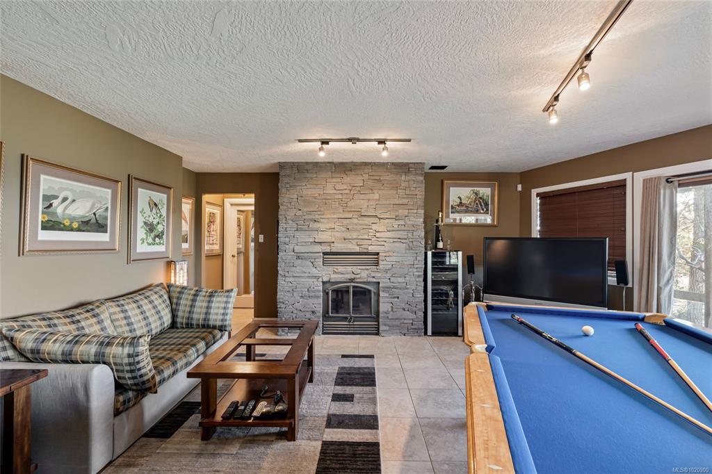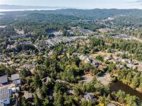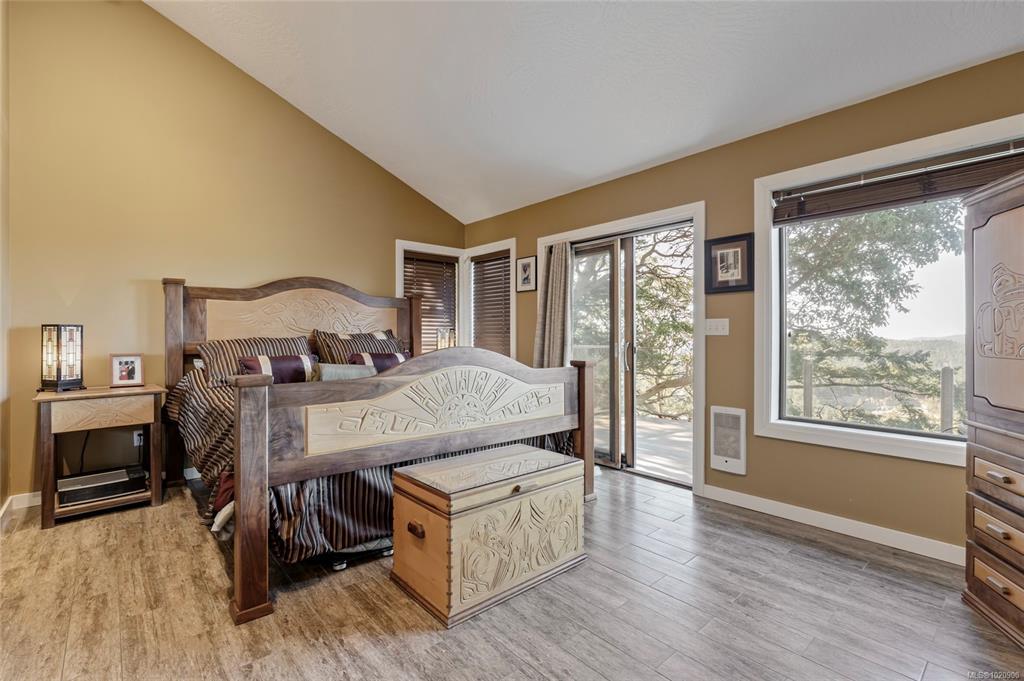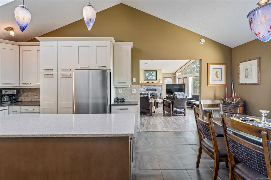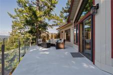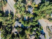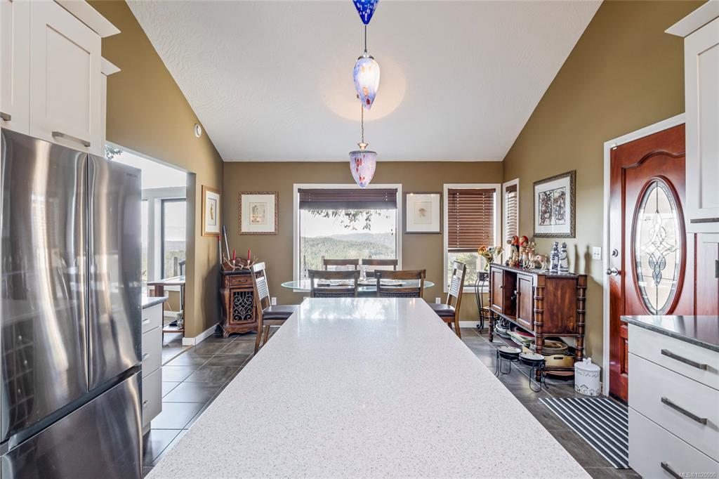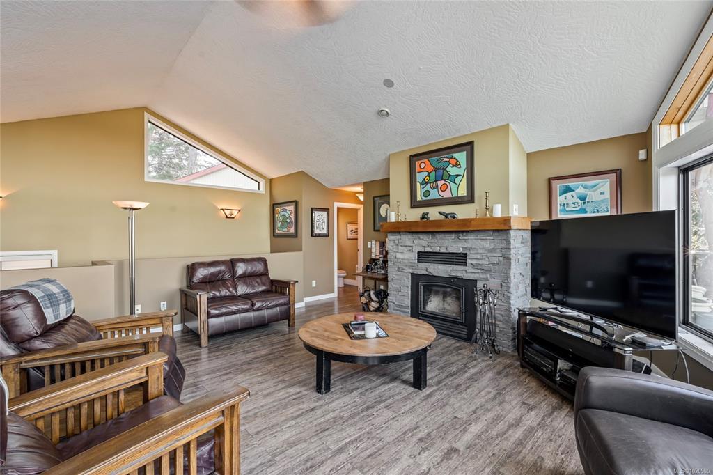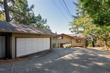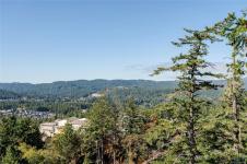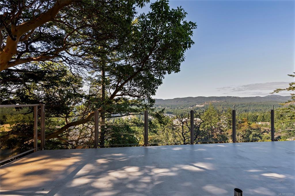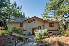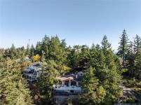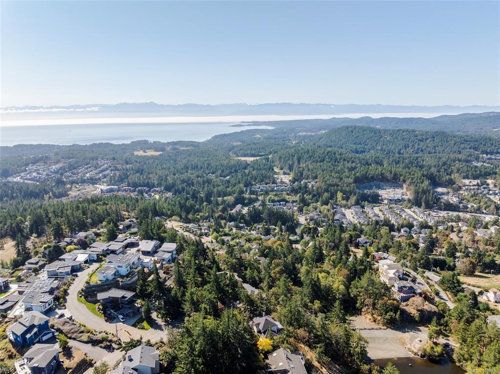 Perched atop Triangle Mountain on a quiet cul-de-sac, this updated 3 bed / 3 bath home offers 2,206 sqft of living space on a rare 25,000+ sqft lot w/ sweeping ocean & Olympic Mountain views. Soaring vaulted ceilings, oversized Pella windows & skylights flood the main level w/ natural light. Step onto the expansive 1,000 sqft fiberglass deck w/ seamless glass railings—perfect for year-round sunsets & panoramic vistas. The main floor features a spacious primary suite, walk-in closet & ensuite, plus a renovated Urbana kitchen w/ SS appliances (including beverage fridge), oversized island & abundant cabinetry. Downstairs, two guest bedrooms, a full bath, versatile family/media room & a storage room (convertible to a 4th bedroom) provide excellent flexibility. Highlights include a large detached garage, wood-burning fireplaces on both levels, in-floor heating in most rooms, a lower deck plumbed for a hot tub & access to Colwood-owned land below with trails & stairs for outdoor exploration.