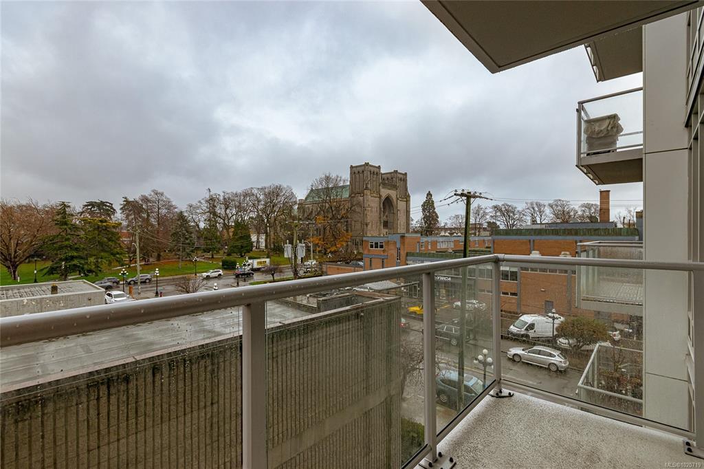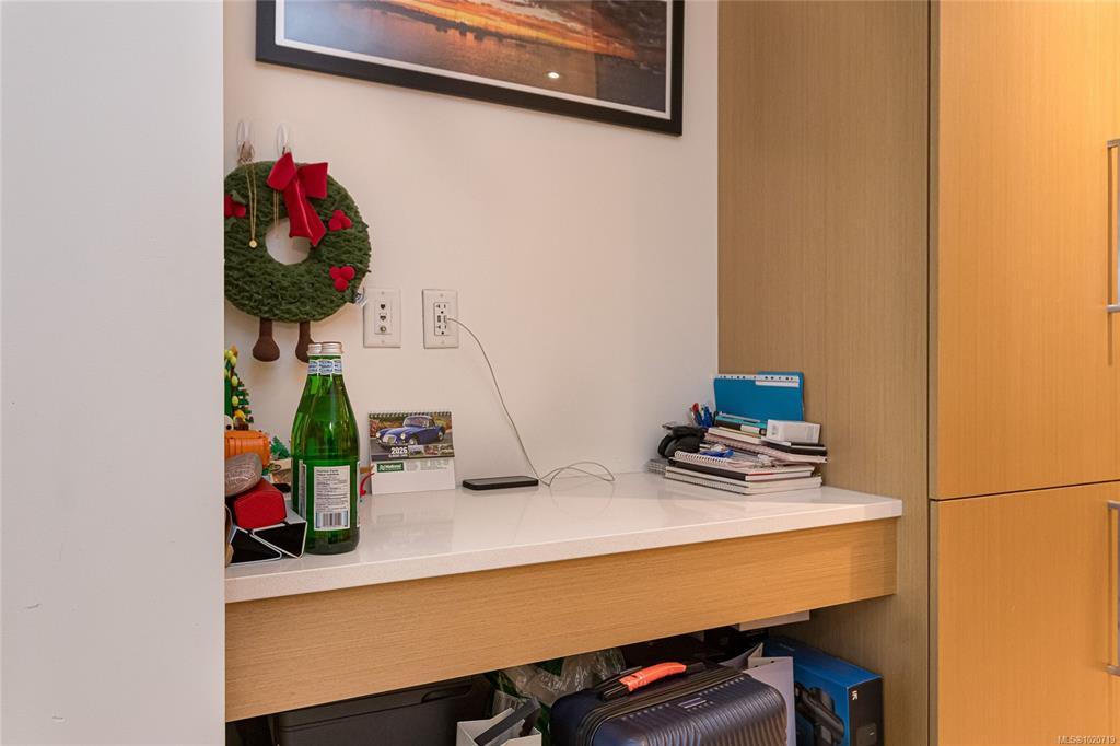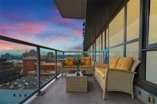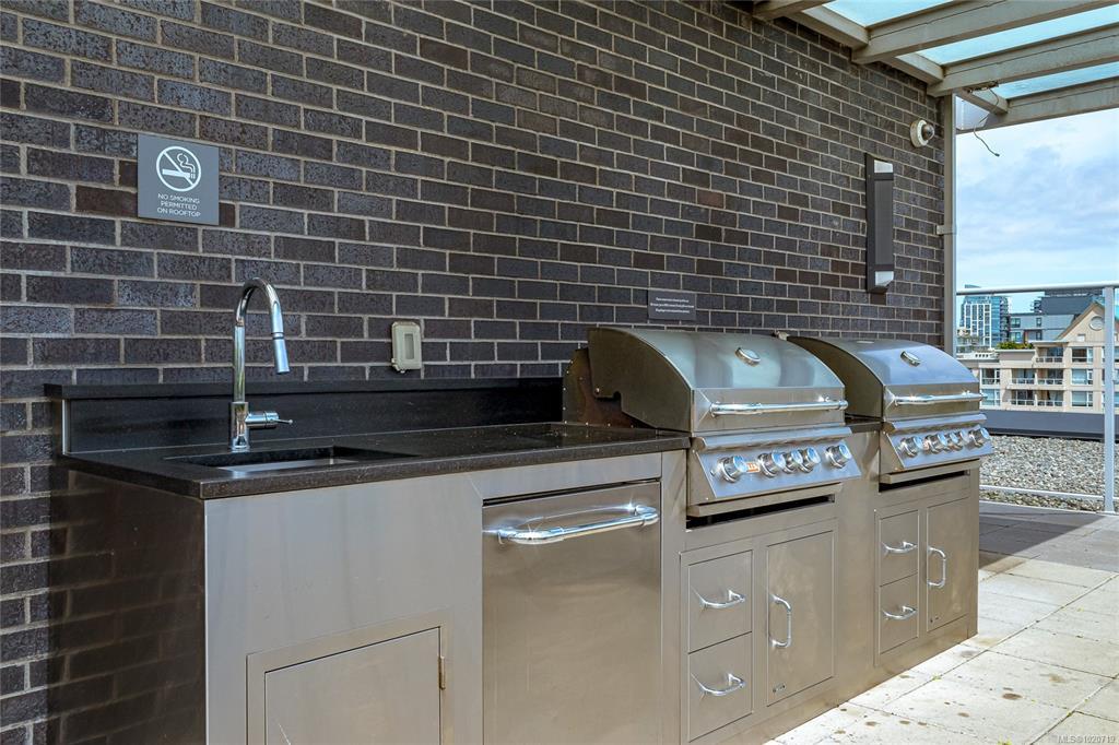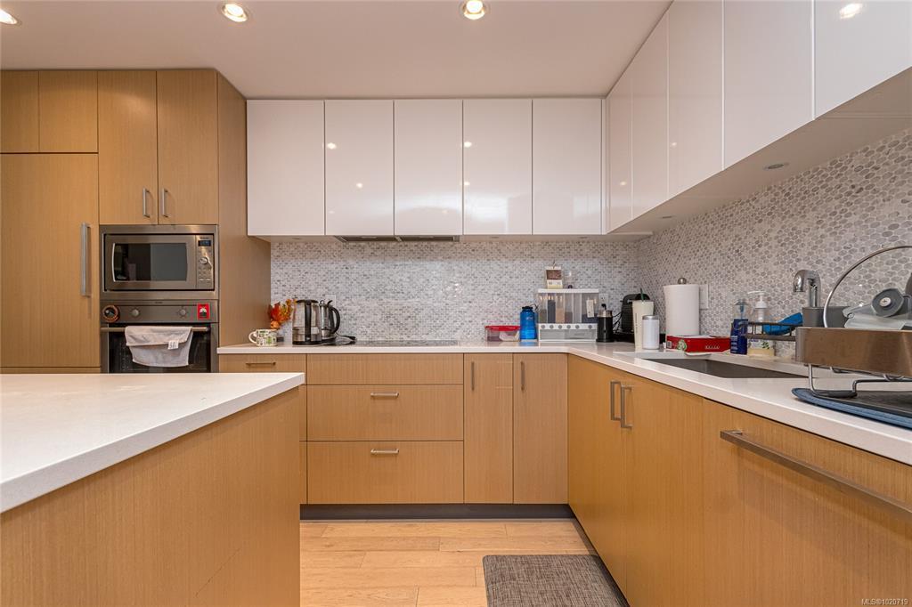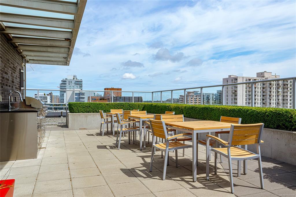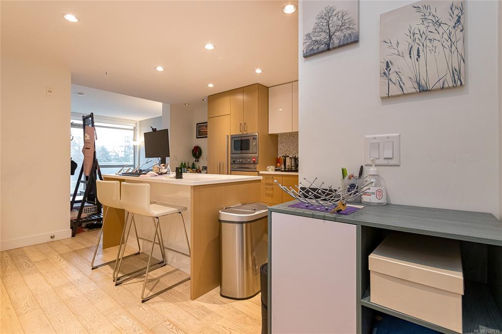 Welcome to the Escher, a modern and stylish steel and concrete building in the heart of vibrant Victoria. This is a thoughtfully laid-out 1-bed/1-bath suite, featuring an open kitchen with a rare expansive island & bar seating, a walk-in closet & a heated bathroom floor. This boutique building is impeccably maintained with a full-time caretaker & offers a welcoming sense of community. Amenities include 1 secure underground parking spot, a stunning rooftop deck with BBQs & 360° views of the city, ocean, mountains and the iconic Anglican Cathedral, a generous ground-floor meeting room ideal for working from home, in-suite laundry, a pet wash, bike repair station & storage. Rentals & pets allowed. Steps to transit, parks, Modo, YMCA, restaurants & shopping—an outstanding opportunity to live in a first-class building & location!