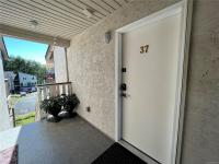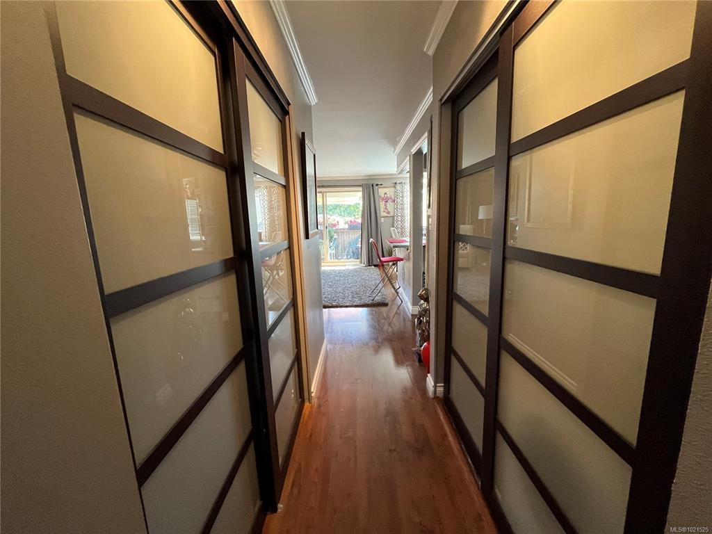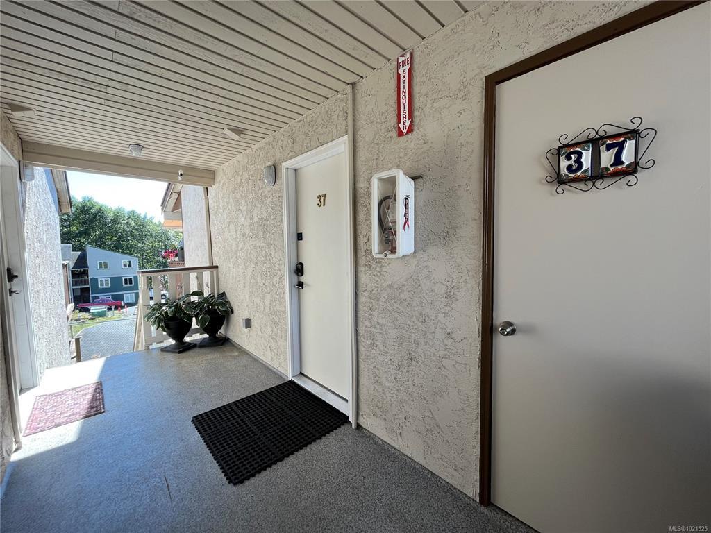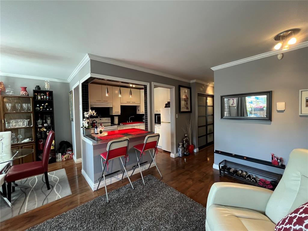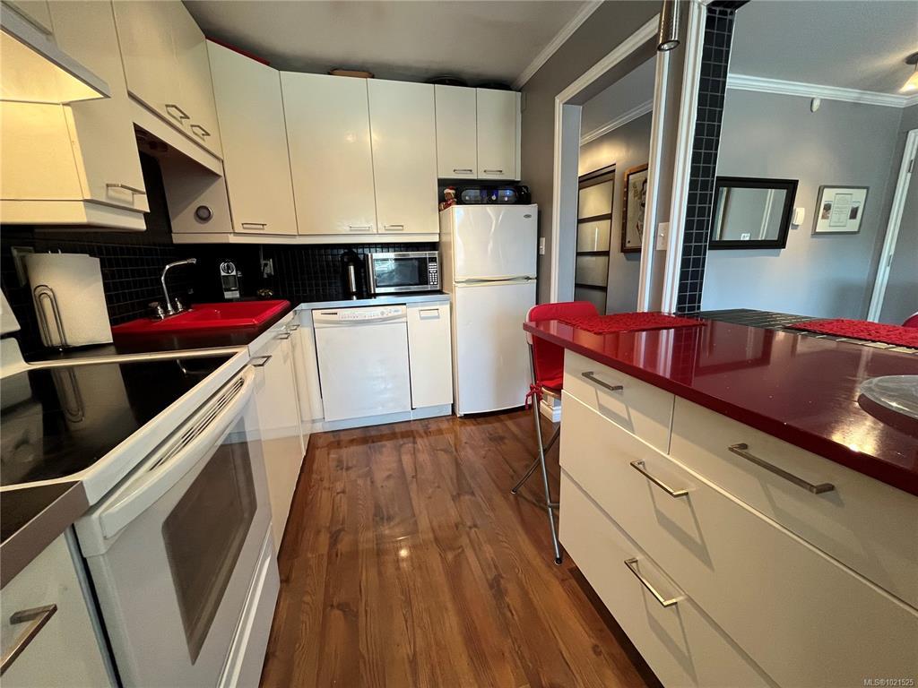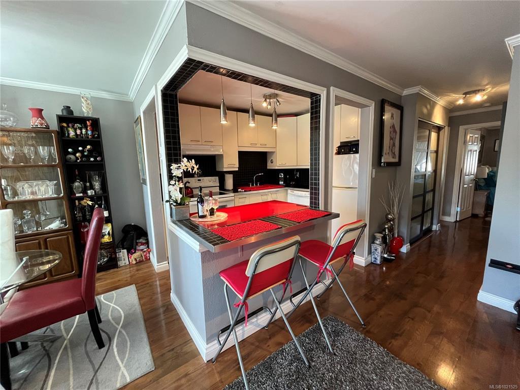 This 2 Bedroom, 1 Bath, Upper level Condo in Woodgrove Gardens is a must see! Enter the unit through the spacious, clean breezeway into a welcoming open concept living space. Natural light beams through the oversized patio door and dining windows. Great outdoor Covered balcony that protects from the afternoon sun or the fall rain. Modern Kitchen with white cabinets, an island with space for 3-4 stools, ceiling height cabinetry and a pop of color and sparkle in the red quartz counter and kitchen sink! Down the hall, glass panel sliding doors are hiding the updated Stackable laundry and huge walk-in closet or pantry with built ins! Updated bathroom with tiled tub surround, and the 2 good size bedrooms finish off this 800 sqft space. Added lights in both bedrooms, recently painted walls, added crown moulding, and matching laminate throughout makes this a perfect place to call home!