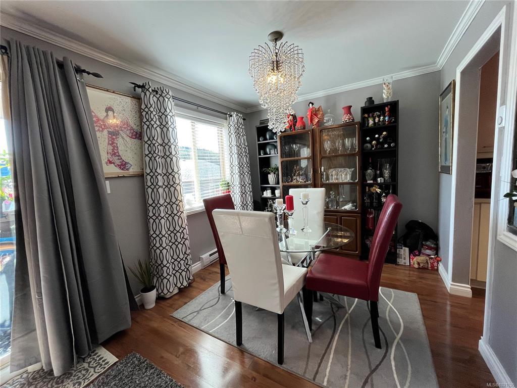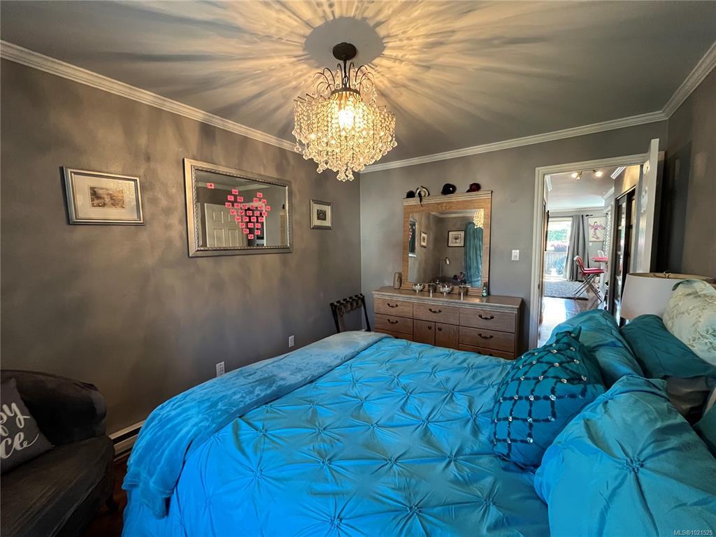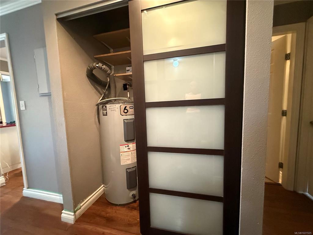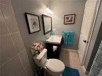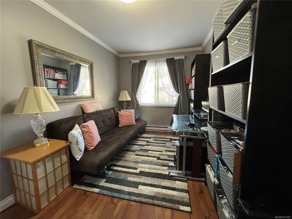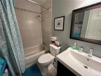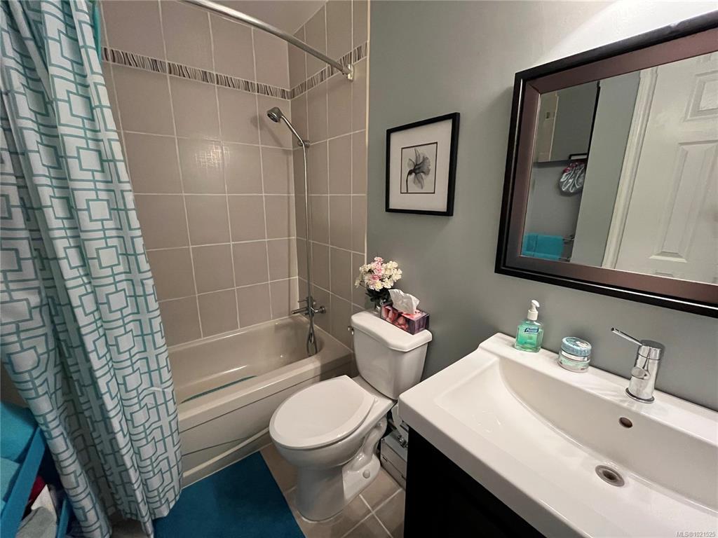 This 2 Bedroom, 1 Bath, Upper level Condo in Woodgrove Gardens is a must see! Enter the unit through the spacious, clean breezeway into a welcoming open concept living space. Natural light beams through the oversized patio door and dining windows. Great outdoor Covered balcony that protects from the afternoon sun or the fall rain. Modern Kitchen with white cabinets, an island with space for 3-4 stools, ceiling height cabinetry and a pop of color and sparkle in the red quartz counter and kitchen sink! Down the hall, glass panel sliding doors are hiding the updated Stackable laundry and huge walk-in closet or pantry with built ins! Updated bathroom with tiled tub surround, and the 2 good size bedrooms finish off this 800 sqft space. Added lights in both bedrooms, recently painted walls, added crown moulding, and matching laminate throughout makes this a perfect place to call home!
