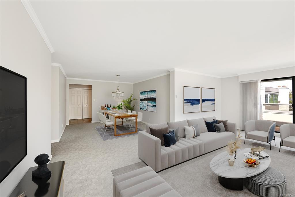 OAK BAY CONDO JUST STEPS TO THE WATERFRONT. The Dorchester is a sought after steel and concrete building across from the Oak Bay Marina and just a brief stroll from Oak Bay Village. This top floor corner unit has more than 1,400 sqft of living space with many modern updates. Updated kitchen with newer appliances, custom cabinetry and countertops. Large primary bedroom with an updated ensuite. Two balconies, one facing east and the other facing west ready for indoor and outdoor entertaining. This home includes two secure underground parking stalls, and a separate storage unit situated close to the elevator for your convenience. This meticulously maintained building is under professional management, with a workshop and car wash. This suite offers the ultimate Oak Bay living experience, just steps away from many amenities including beaches, parks, and Victoria Golf Club.