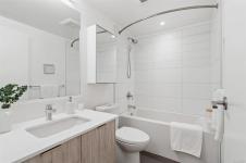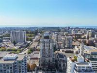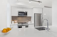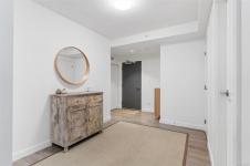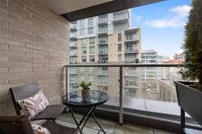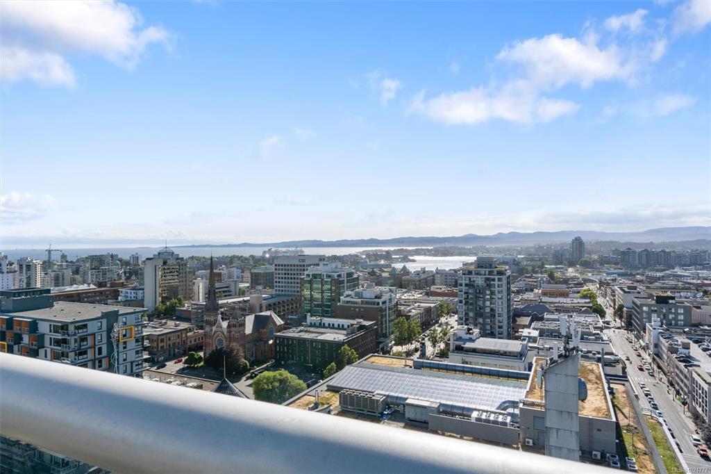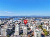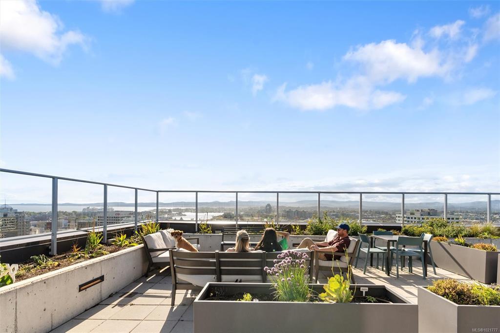 Spacious 6th floor 2 Bed, 2 Bath corner suite with south facing garden views, tucked away from street, in the heart of downtown Victoria. Primary bedroom features ensuite with soaker tub and walk in closet; second bedroom offers two large closets and nearby full bath. Smart layout separates bedrooms with open living space and ample storage. Bright kitchen with quartz counters, modern cabinetry, honeycomb backsplash, stainless appliances, long eating bar, and dining area. Large entry doubles as flexible space for office, workout, or extra storage. Big windows bring in natural light and city views, with roller shades throughout. Covered deck fits BBQ, dining, and plants—perfect for enjoying the sunny exposure. Balance of 2/5/10 warranty, pets allowed, no AHOP/BC Housing approval required. Rooftop patio with incredible views, BBQs, seating, dog run, and garden plots. Secure underground parking with EV charging, full height storage locker, and bike storage. A must-see, act quick!