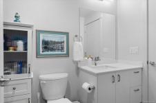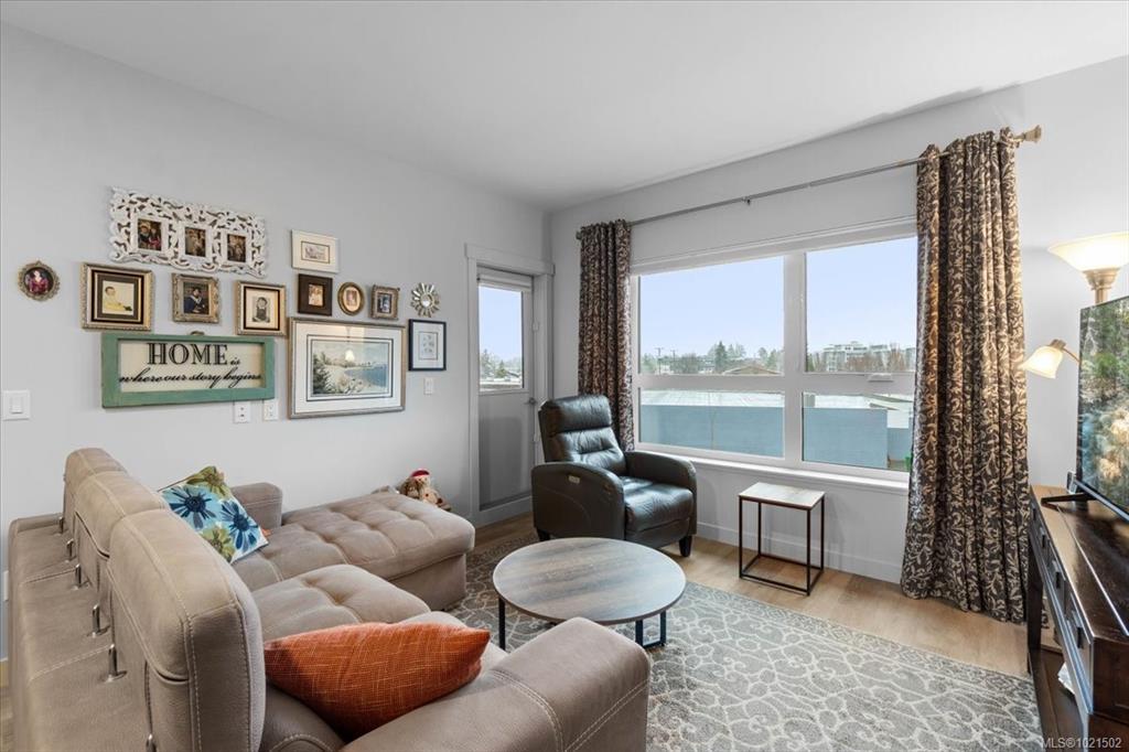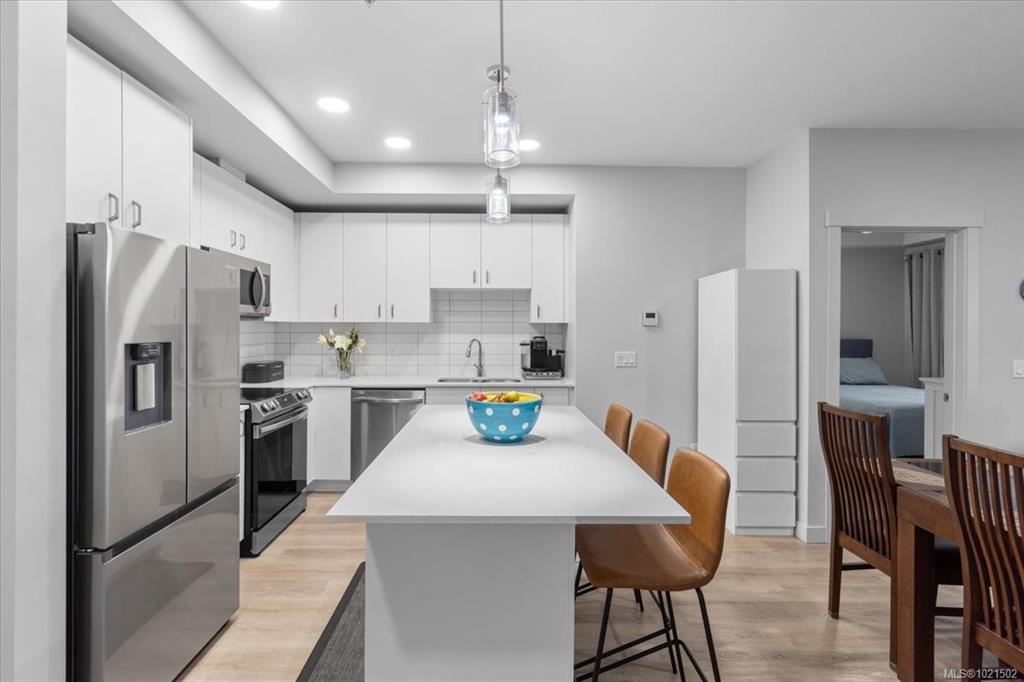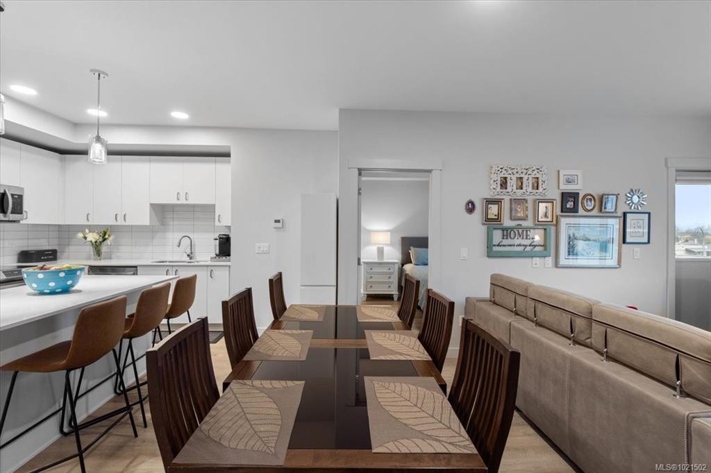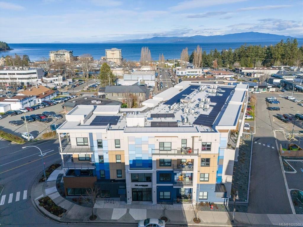 Bright and modern 2 bed, 2 bath condo in a 2024-built community hub. Enjoy an open floor plan with luxury vinyl plank flooring, quartz countertops, tile backsplash and soft-close cabinetry. Triple-pane windows, a built-in heat pump and ceiling fans provide year-round comfort. The primary suite offers a walk-in closet and 3-pc ensuite with a stand-up shower, while the second bedroom connects to a Jack-and-Jill 4-pc bath. A convenient laundry/electrical room adds storage. Relax on your balcony with a peek-a-boo ocean view. Pet friendly with secure underground parking. Steps to amenities, and right in the building you’ll find a dental office, chiropractor, fitness centre and soon a coffee shop. Walk to the park, summer music festivals, library, banks, restaurants, pub and the beach. A chance to live the coveted Vancouver Island Lifestyle!