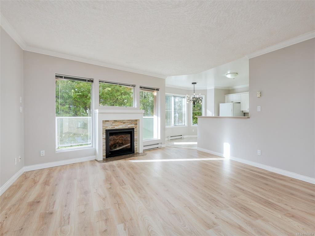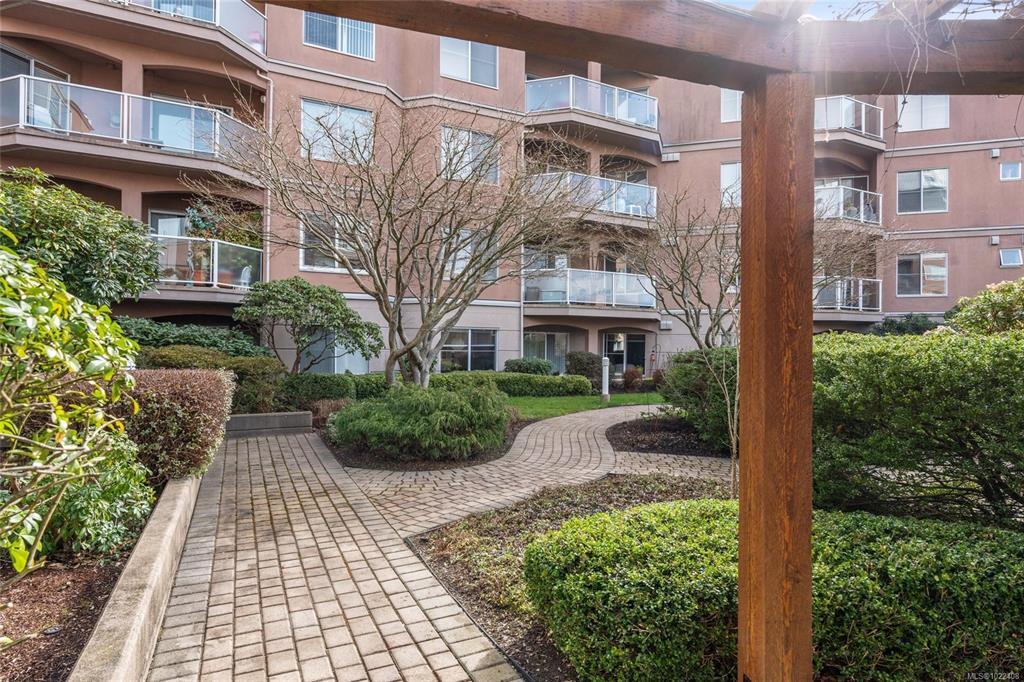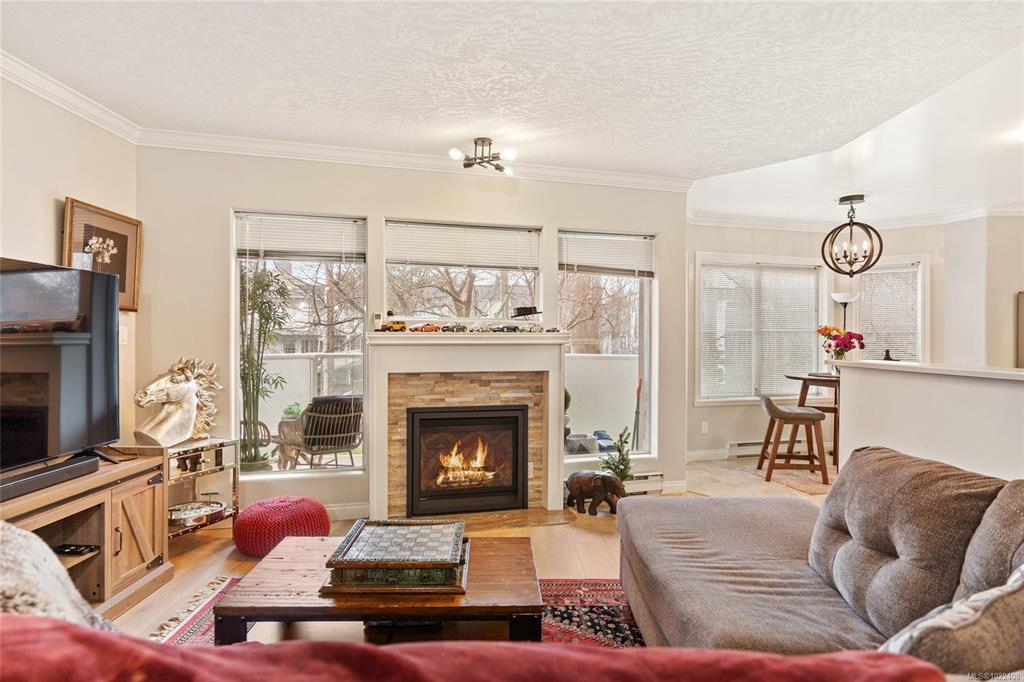 Vibrant James Bay! Bright and spacious 1,180 sq.ft. southwest-facing 2 bed/2 bath condo in the popular Polo Pacific, overlooking beautifully landscaped courtyard gardens. This well-designed layout features newer flooring and excellent use of space throughout. The kitchen offers newer appliances, an eating area, and access to a sunny balcony. The open living/dining area features a cozy gas fireplace. The generous primary suite includes a large walk-in closet, ensuite, and a versatile lounge area ideal for a home office. Upgrades include the newer appliances, flooring, toilets, and more. Amenities include in-suite laundry, secure underground parking, two guest suites, games room, EV charging, on-site caretaker, and additional parking to rent.