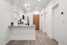 Step into comfort and contemporary living in this thoughtfully designed condo, where every detail has been curated for ease and enjoyment. The modern kitchen is both stylish and functional, showcasing Whirlpool appliances, a tiled backsplash, and a smart bar seating area that invites casual meals and conversations. Full-size stackable laundry, air conditioning, and window screens add everyday convenience, while blackout blinds in the bedroom create a peaceful retreat for restful nights. The bathroom features a tiled shower complemented by in-floor heating—perfect for slow mornings and relaxed evenings.
