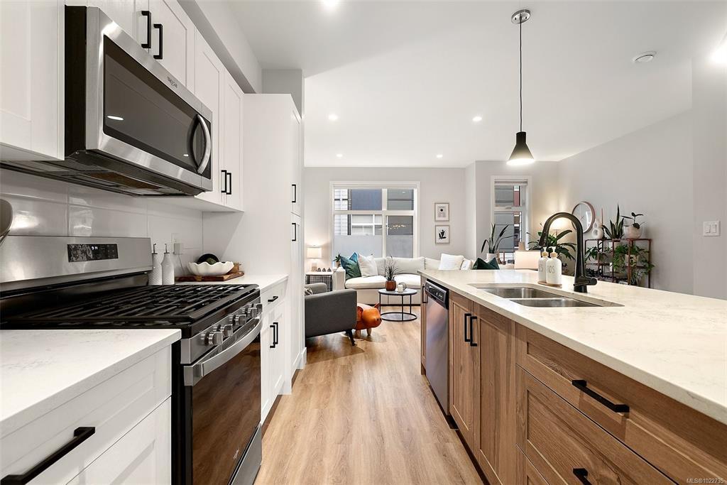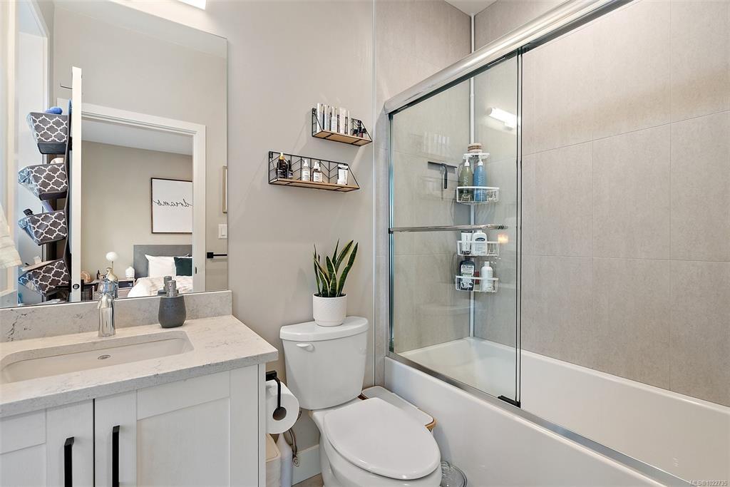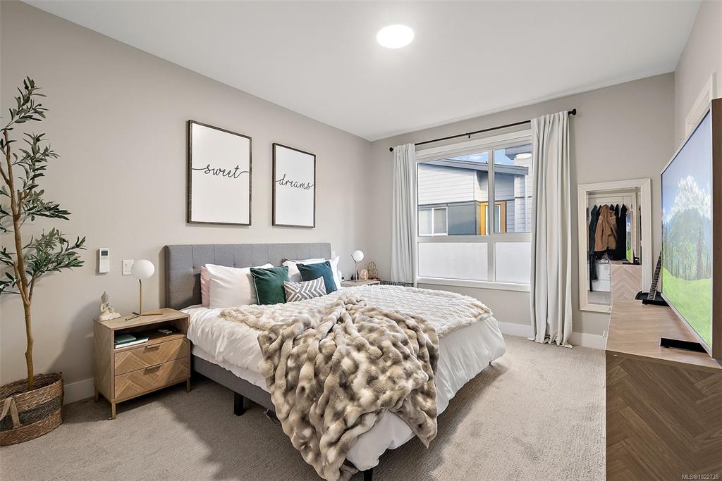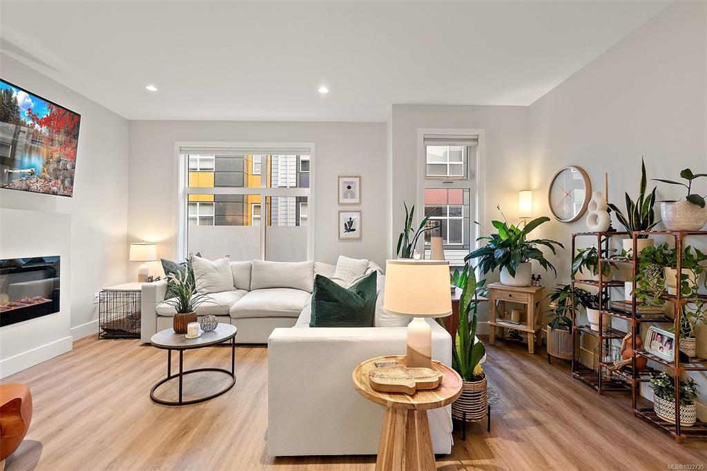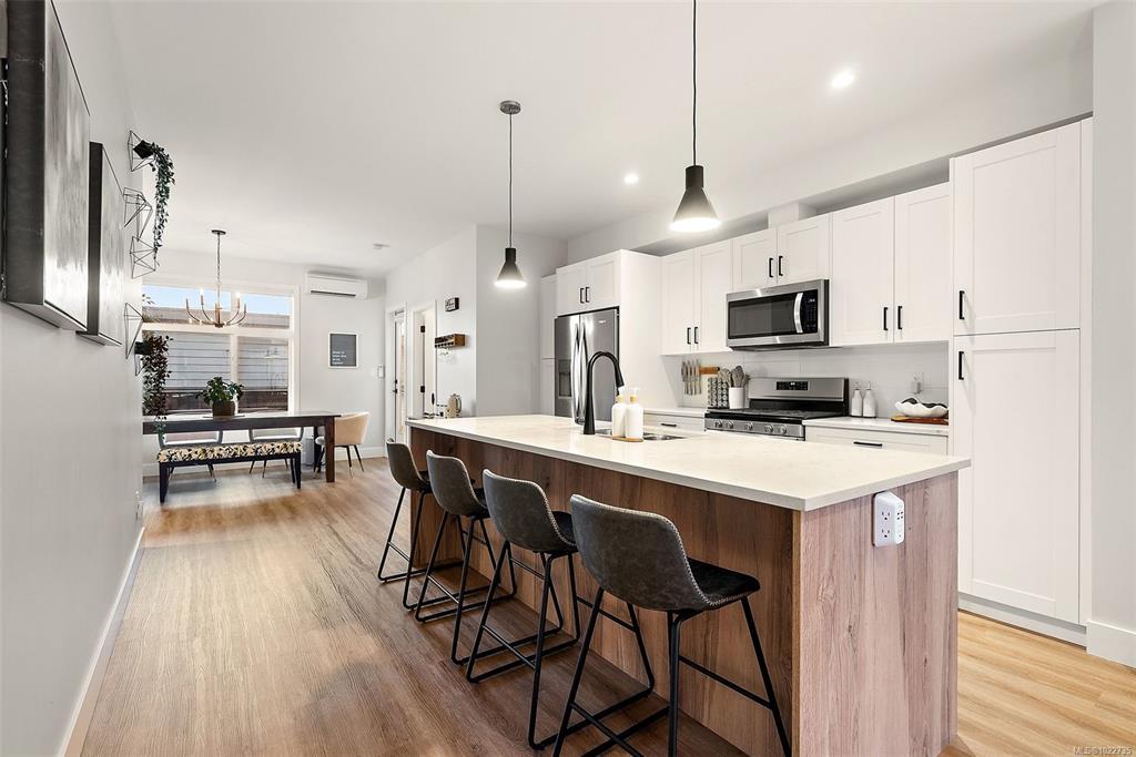 Welcome home to this bright, well-appointed 3-bedroom, 3-bathroom home offering 1,450 sq ft of comfortable living space plus an oversized 532 sq ft garage. The main level features an open layout with 9-ft ceilings, electric fireplace, and a chef-inspired kitchen complete with quartz countertops, stainless steel appliances with gas range, soft-close cabinetry, full-height pantry, tile backsplash, and a large island ideal for everyday living and entertaining. Added comforts include air conditioning, on-demand hot water, and cordless blinds throughout. Upstairs, the primary bedroom offers a walk-in closet and 4-piece ensuite, with two additional bedrooms nearby. Outside, enjoy a sunny south-facing deck and fully fenced yard—perfect for kids, pets, or hosting. Conveniently located near Red Barn Market, Olympic View Golf Course, and the Galloping Goose Trail. Rentals permitted, pets welcome with no weight restrictions, and remaining 2-5-10 home warranty.
