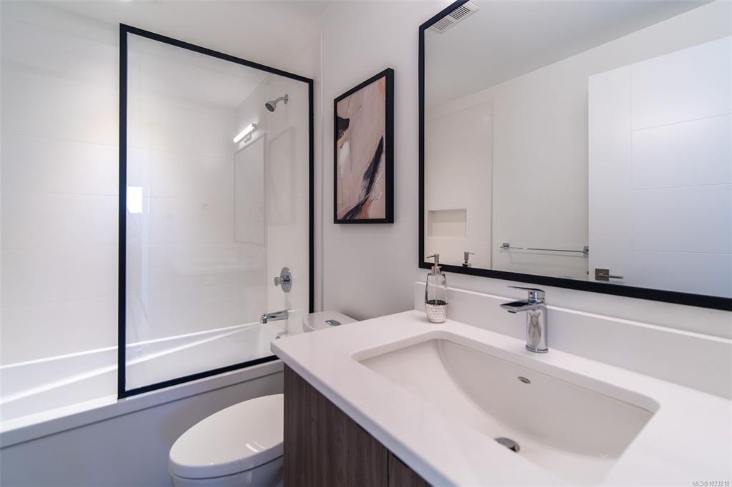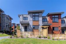 NEW LISTING! THE LAST END-UNIT AVAILABLE! Executive townhome at Paragon Parc, built by award-winning White Wolf Homes. Offering 2,386+ sq ft of refined living, this 3BD/4BA home blends luxury, space & privacy. Soaring rooflines, oversized windows & West Coast design set the tone. Main flr features: 9’ ceilings, gourmet kitchen w/ quartz counters, gas cooktop, wall oven, island, pantry, & deluxe KitchenAid appliances. Open-concept living/dining w/ fireplace, office nook, & powder rm. Stunning primary suite w/ walk-in closets, spa-like ensuite (heated tile, floating vanities, glass shower), + laundry & vaulted ceilings. Lower: media/rec rm, ideal for guests, gym or flex. Add'l features: radiant flrs, remote blinds, EV-ready garage, XL driveway, heat pump, fenced yard & patio backing greenspace. Community garden, kid’s park, trails, shops, airport & DT Victoria mins away. Full new home warranty. Move-in ready —your luxe lifestyle starts here.