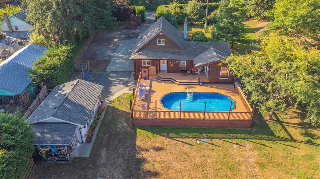 Welcome to this meticulously maintained country retreat, ideally located just minutes from the charming town of Chemainus. Set on 3.33 acres of beautifully landscaped and fully fenced grounds with cross-fencing, this 3-bedroom, 2-bathroom home offers privacy, functionality, and timeless appeal. Inside, you’ll find a warm, classic interior and a well-designed, functional floor plan. Outdoors, enjoy the swimming pool, covered hot tub area, tranquil pond, mature fruit trees, berry bushes, and established garden beds. A detached workshop/garage and multiple outbuildings provide exceptional versatility. The unfinished basement offers endless potential for your ideas, whether additional living space, a gym, or workshop. Ideal for hobby farming, animals, or those seeking space, privacy, and a peaceful rural lifestyle close to town. Measurements approximate; verify if important.