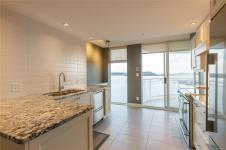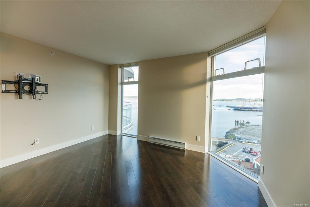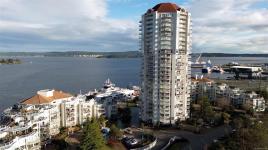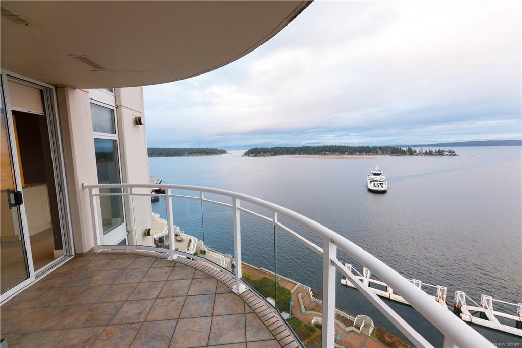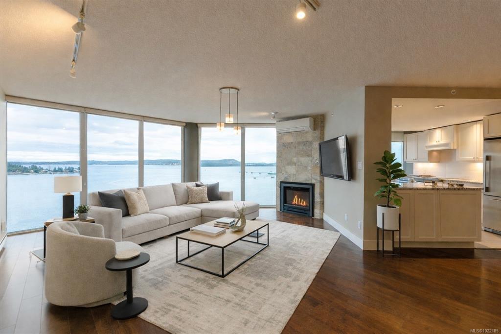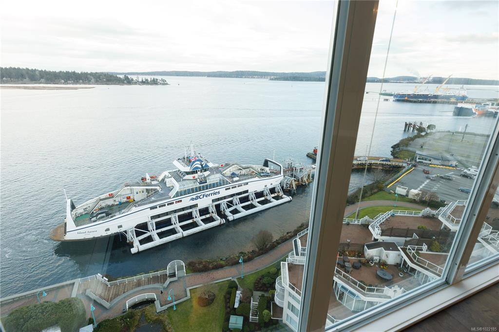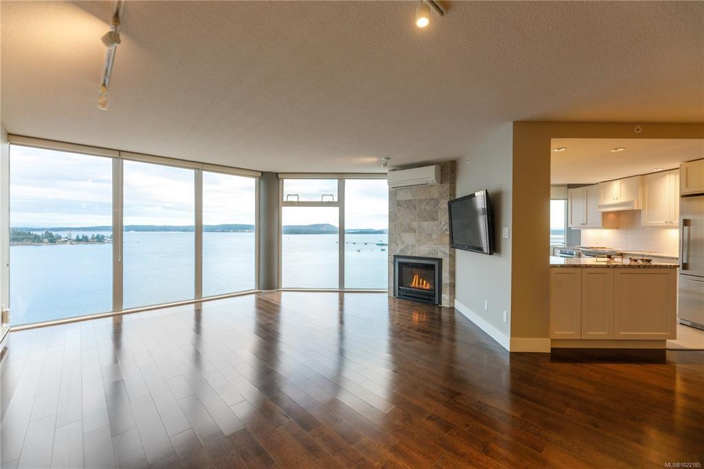 Welcome to 1501–154 Promenade Drive in the Beacon Building on Cameron Island. This approximately 2 bed 2 bath condo offers breathtaking 180-degree views of the Nanaimo waterfront, overlooking Protection, and Gabriola Islands. Renovated in 2014, the home features a modernized kitchen complete with heated tile flooring, quartz countertops, and an open-concept layout created by removing walls to enhance flow and natural light. Additional highlights include hardwood flooring, a ductless split heat pump, a gas fireplace, and exceptionally built-in closets in the primary bedroom. The unit offers ample in-suite storage, including an oversized pantry, as well as a separate storage locker. Floor-to-ceiling windows and views from every room truly showcase luxury waterfront living. The spacious primary ensuite features a four-piece bathroom, while the second bathroom is a three-piece. This unit also includes two parking stalls. (measurements approximate, verify if important)