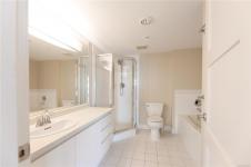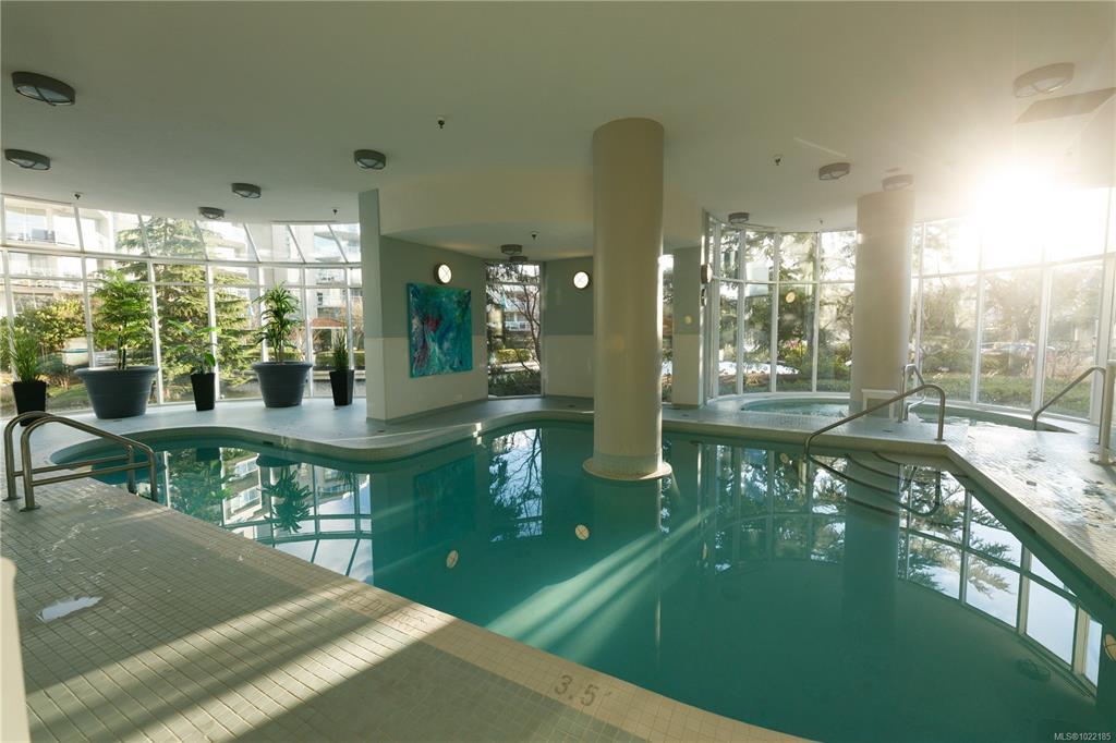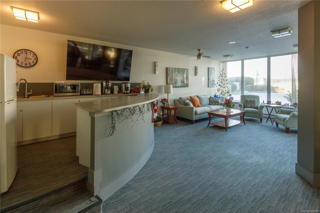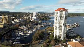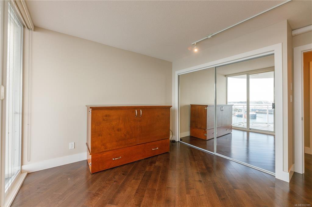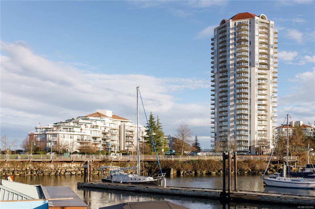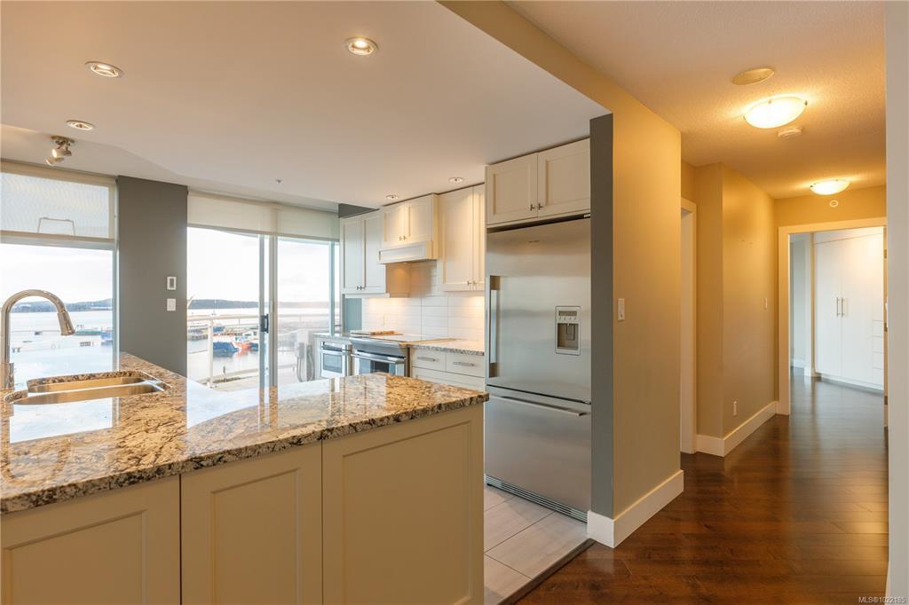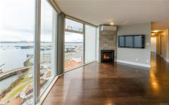 Welcome to 1501–154 Promenade Drive in the Beacon Building on Cameron Island. This approximately 2 bed 2 bath condo offers breathtaking 180-degree views of the Nanaimo waterfront, overlooking Protection, and Gabriola Islands. Renovated in 2014, the home features a modernized kitchen complete with heated tile flooring, quartz countertops, and an open-concept layout created by removing walls to enhance flow and natural light. Additional highlights include hardwood flooring, a ductless split heat pump, a gas fireplace, and exceptionally built-in closets in the primary bedroom. The unit offers ample in-suite storage, including an oversized pantry, as well as a separate storage locker. Floor-to-ceiling windows and views from every room truly showcase luxury waterfront living. The spacious primary ensuite features a four-piece bathroom, while the second bathroom is a three-piece. This unit also includes two parking stalls. (measurements approximate, verify if important)