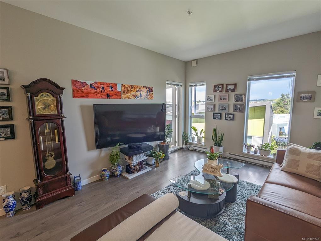 Enjoy urban living at its finest in this well-appointed & modern design 1 bedroom condo! Situated within the Railyards development, one of the most desirable waterfront communities in Victoria! This east (water) facing unit offers comfort, style, and convenience thanks to an open-concept floorplan maximizing space & natural light. Features include large windows, in-suite laundry, kitchen with stainless steel appliances, quartz countertops, eating island and sleek cabinetry. Private balcony with views of the surrounding area, providing a personal outdoor retreat, ideal for your BBQ. Secure underground parking, separate storage, bike room, kayak storage, and a roof top patio for entertaining. No rental restrictions, pets allowed and the remainder of the 2/5/10 warranty. Easy access to the waterfront for recreational activities like kayaking, paddleboarding, biking and walking along the waterway. Close to downtown Victoria and the Galloping Goose and E&N trails. Shopping & dining nearby!