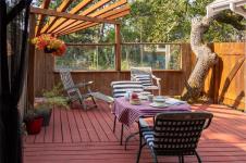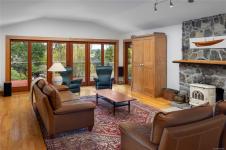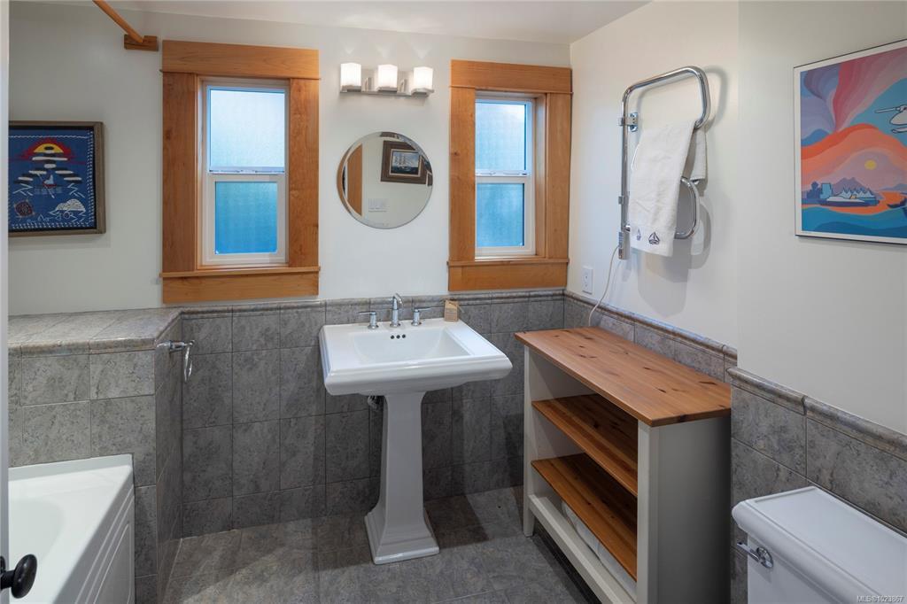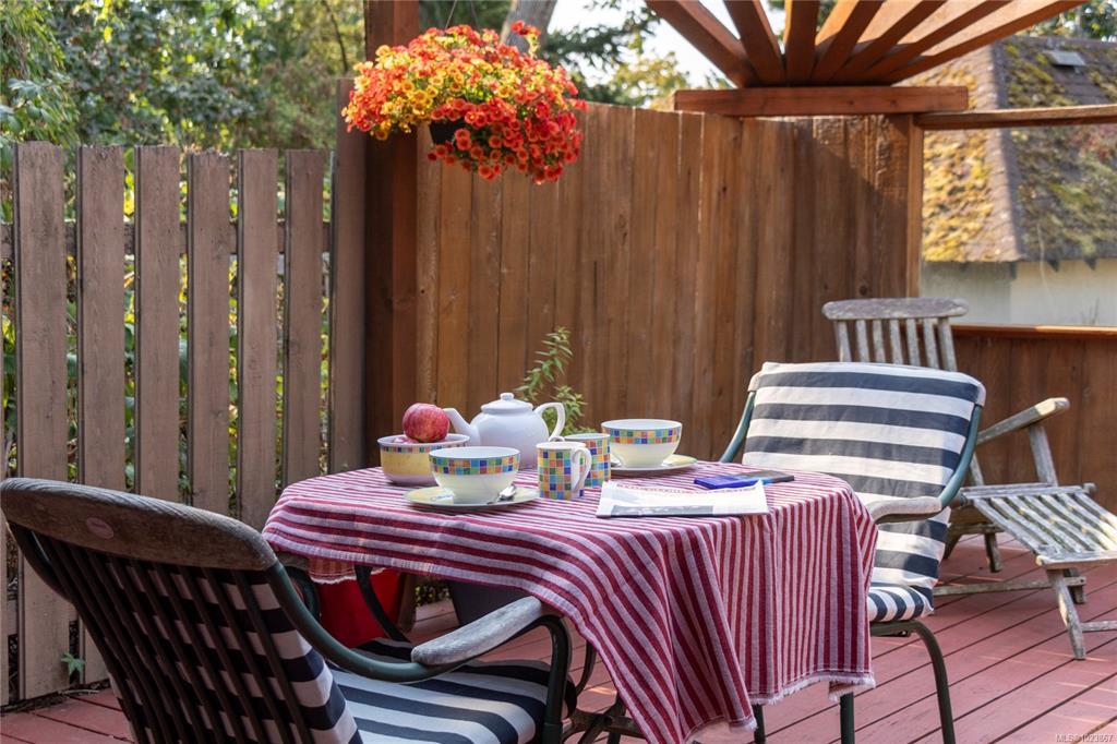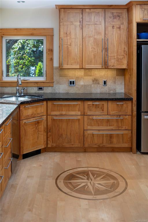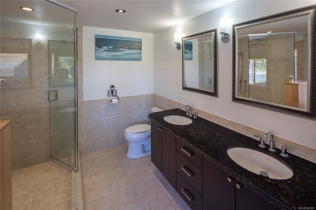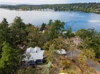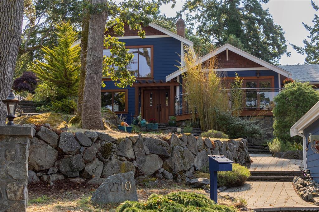Modern luxury in a stunning West Coast home with rich wood detailing throughout. Set on a quiet, beautifully landscaped 0.36-acre private lot, this hidden gem offers the best of indoor-outdoor living - enjoy ocean views and sunsets from the front deck and unwind on the secluded back patio. The open-concept layout features vaulted ceilings, hardwood floors, and a natural rock fireplace with wood stove. Oversized windows and custom wood/glass doors bathe the space in light. The Ribbon Maple gourmet kitchen includes chocolate granite counters, a 6-burner Viking stove, and double ovens - ideal for entertaining. Upstairs, the primary suite has tranquil Cadboro Bay views and an ensuite; a second bedroom also includes a 4-piece ensuite. The main level offers a media area, a third bedroom with 4-piece bath and a den/home office that could be an extra guest room. Extras: double garage, 3 side-by-side parking spots, detached studio with 2-piece bath, and mature trees.
