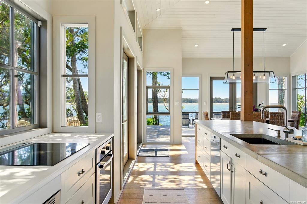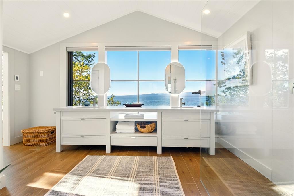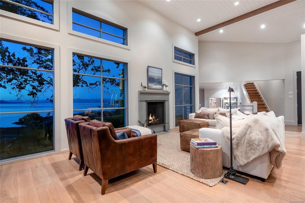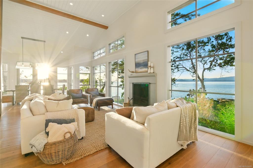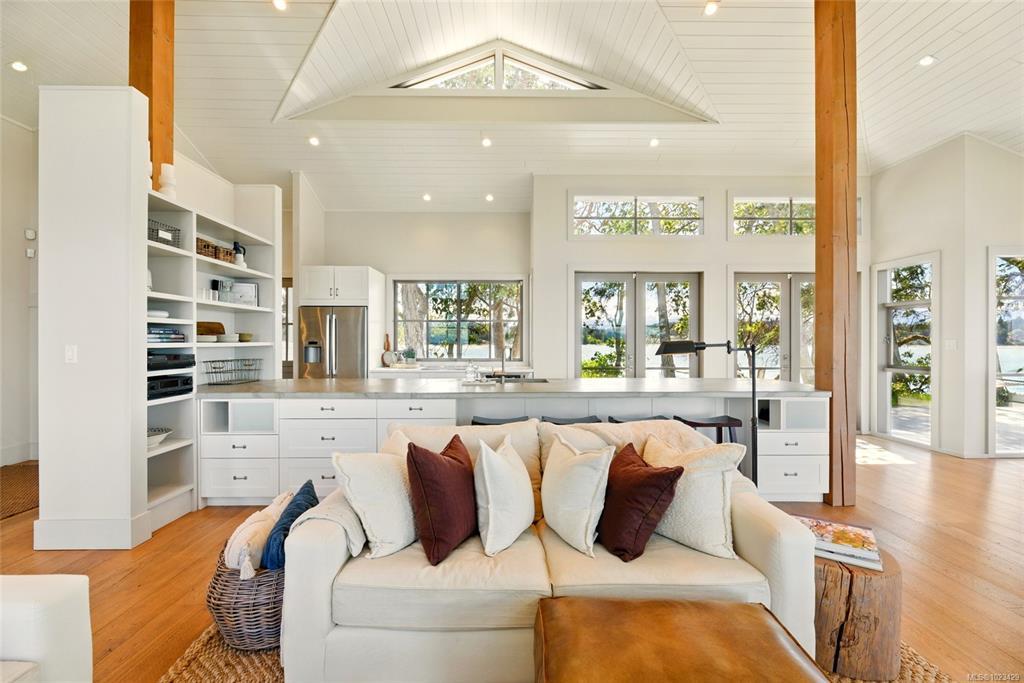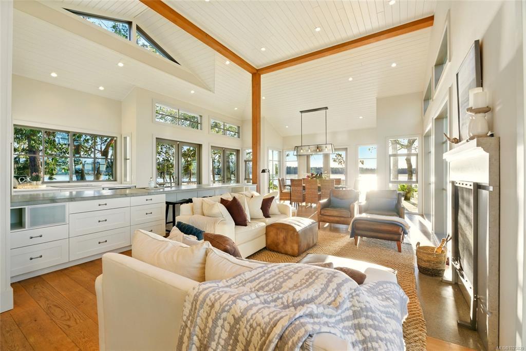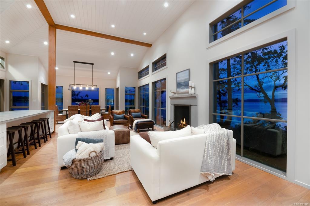 Located at the private tip of Madrona Point, this exceptional Nanoose Bay waterfront residence sits where parkland & the Pacific converge. Set on a tranquil 1/2 acre lot, the home blends classic Cape Cod influence with a refined coastal aesthetic, featuring soaring 14-foot pine ceilings, fir posts, beams & radiant in-floor heating. The open-concept main level is anchored by a striking 12-foot custom concrete island & floor-to-ceiling windows that frame uninterrupted ocean views. A wood-burning fireplace adds warmth to the expansive living area, while 2 generous primary bedrooms offer spa-inspired ensuites & flexible use of space. Outdoor living is defined by 270-degree vistas & terraced irrigated gardens leading to the shoreline, complete with a boat lift for up to a 20-foot vessel. A covered breezeway connects to a charming guest suite with loft accommodations. Just minutes from Qualicum Beach Airport with easy access to Helijet & BC ferries, this is the pinnacle of West Coast luxury.