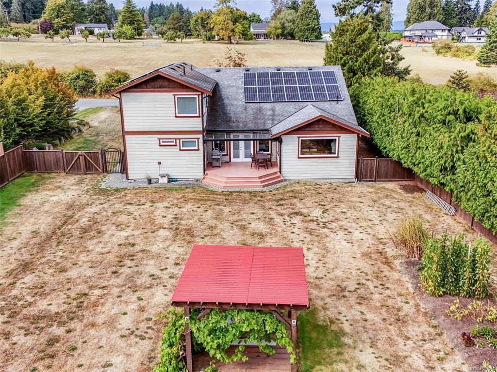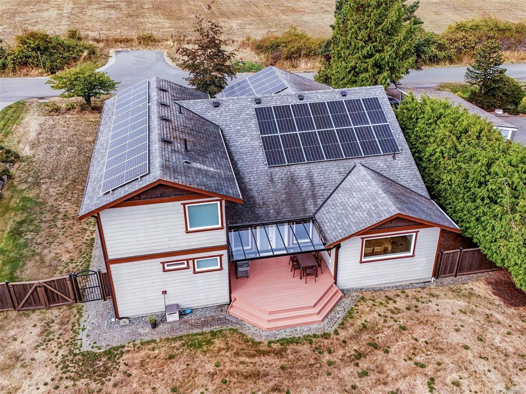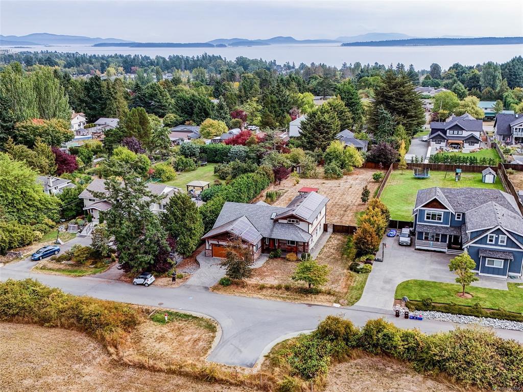 SPACIOUS, SOLAR POWERED LUXURY FAMILY HOME THAT FEELS LIKE IT’S IN THE COUNTRY & is just minutes to amenities! 35 Solar panels provide over 80% percent of power for the nearly new house. A bright, high-ceiling, open floor plan w/ 2 identical primary bedrooms – one on main floor & one on upper floor, both with walk-in closets & spacious 5 piece ensuites with separate soaker tubs, showers & twin sinks. Large, well-designed kitchen with lots of cupboards & hook-up for gas stove. 2 more bedrooms, 4 bathrooms, heated tile & wood floors. Great for multi-generational living. Entry level design ideal for wheelchairs too. On a quiet cul de sac, the enormous, fully-fenced, private, level back yard with fruit trees & a veggie garden is ideal for kids, pets & gardeners. Open farmland across the street makes it feel remote, yet it’s only 7 minutes to groceries in Sidney. Lots of room for toys in oversize double garage. Plenty of storage. This home has it all!