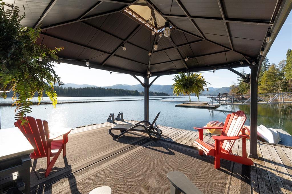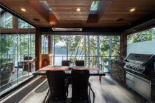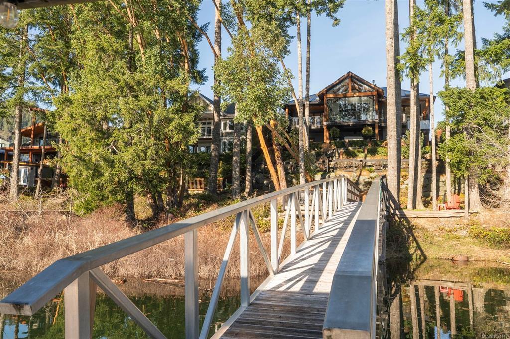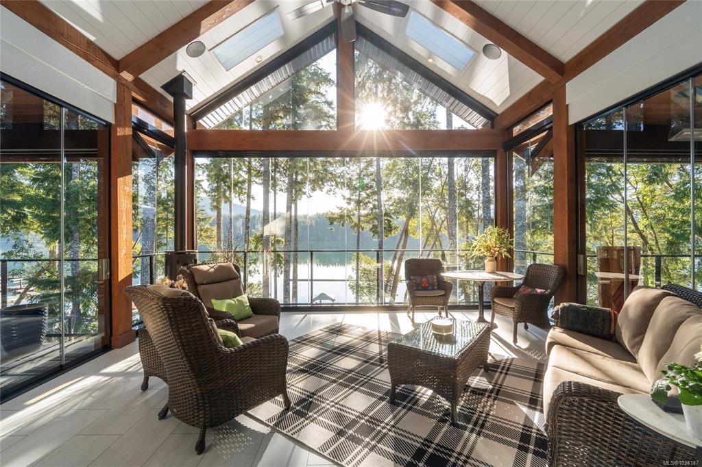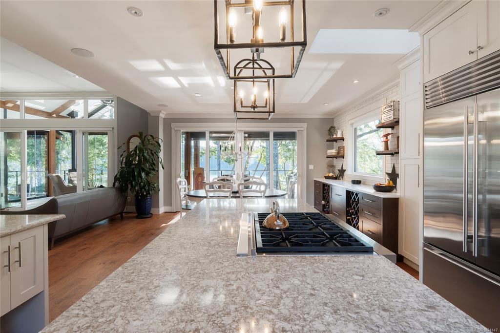 Walk-on waterfront, on approx ½ acre lot featuring 4+1 bedrms, 4 baths, main-floor primary bdrm. Residential elevator, regional water/sewer, 3-car garage w/ epoxy floors, EV, RV parking, dock w/ gazebo, 50’ gangway & 50’ walkway, beach w/ gradual walk-in access, log boom. Fully fenced, lower-level outdoor entertainment bar, infinity edge hot tub & outdoor shower, outdoor kitchen w/ granite counters, fridge & Napoleon gas BBQ. Deck w/ heaters, roller screens, metal roof, hickory hardwood floors, curved stairwell w/ iron railings, 2 stone fireplaces, 12 skylights, full wet bar, 110” projection screen. Kitchen w/ stone counters, loads of cabinets, oversized island, Sub-Zero refrigerator, full Wolf appliance package. Heat pump, HRV, central vac, irrigation, Sonos audio, HD security cameras, alarm, LED landscape lights, Control4 wiring. All-season sunroom w/ Jøtul 3-sided gas fireplace, Lumen retractable glass system, generator(All info/data believed to be accurate. Verify if fundamental)