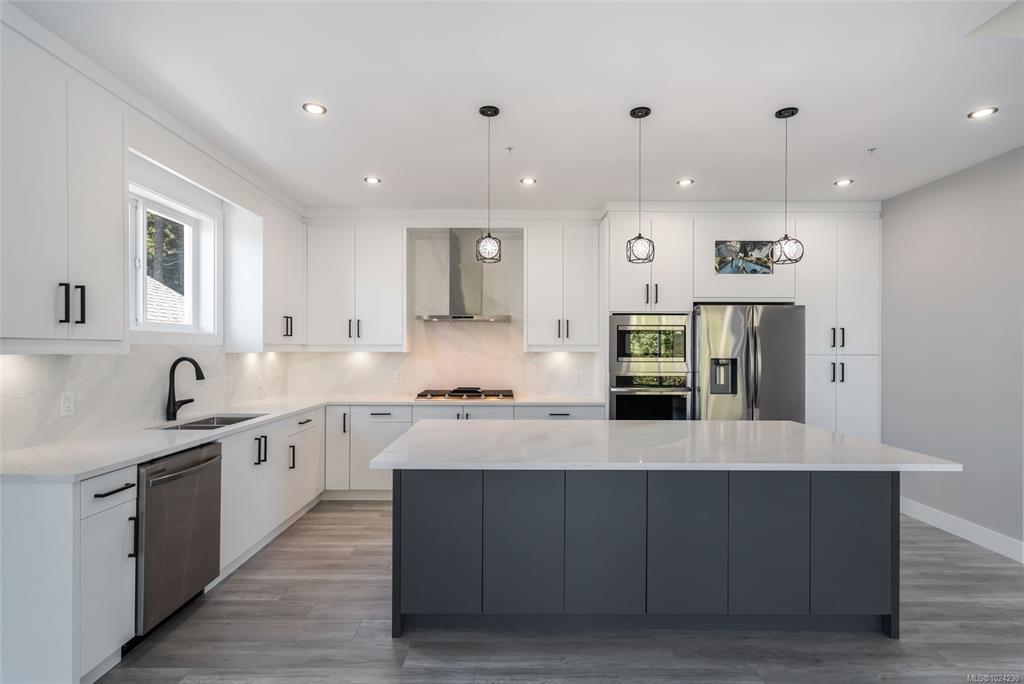 Coastal views and modern design come together in this impressive North Nanaimo residence. Featuring six bedrooms and four bathrooms, the home is designed for both functionality and style, highlighted by an expansive open-concept living space. The oversized kitchen is a standout with quartz countertops, stainless steel appliances, a gas range, and elevated designer finishes. Enjoy views of the Georgia Strait from the main living area or retreat to the primary bedroom’s private deck. The primary ensuite delivers a spa-like experience with double vanities, a glass shower, and a deep soaker tub. A legal two-bedroom suite on the lower level provides excellent flexibility for extended family or rental income. Additional features include a double garage, heat pump with air conditioning, gas furnace, hot water on demand, and an easy-care yard. Measurements are approximate, please verify if important.
