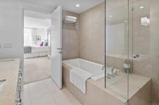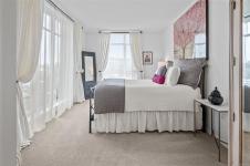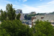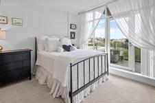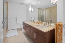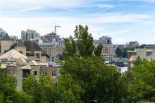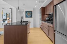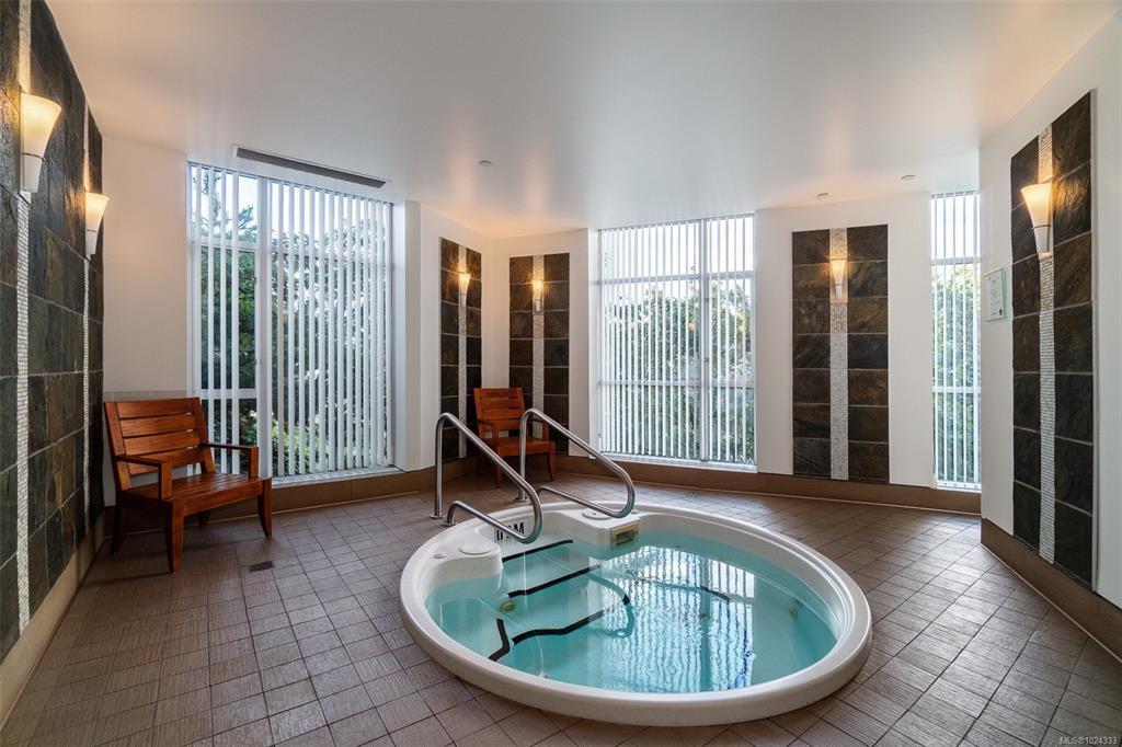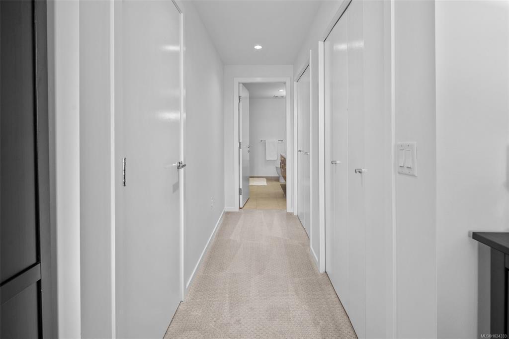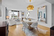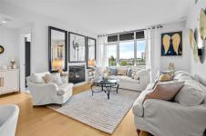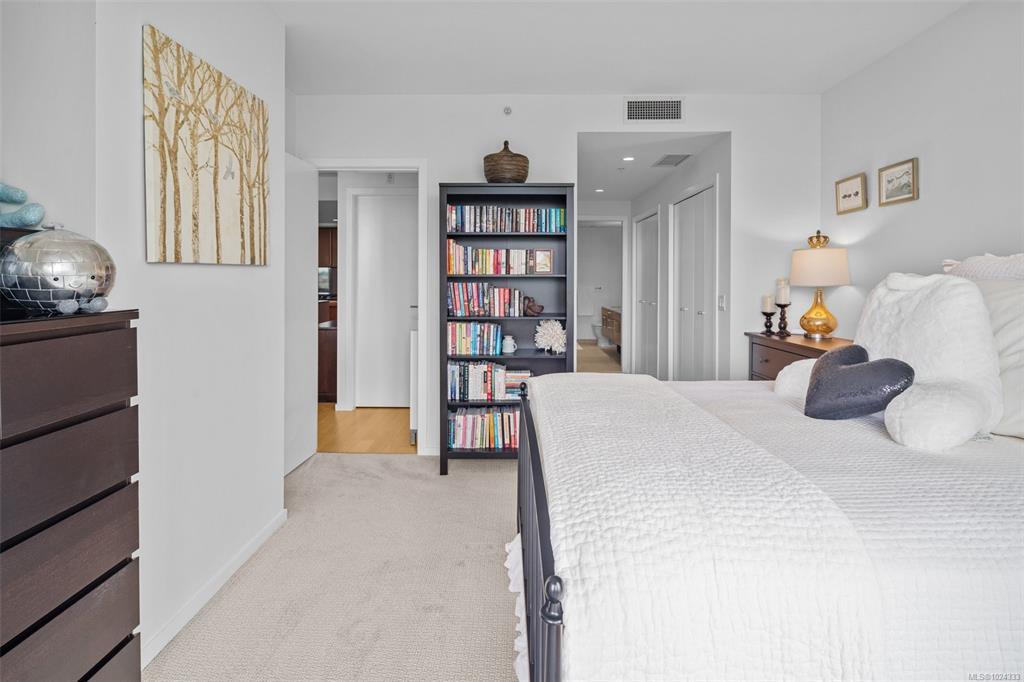 A refined, like-new residence offering an elevated expression of contemporary living. A thoughtfully tailored, light infused floor plan offers open-concept living with well separated bedrooms, each featuring a private ensuite, along with a dedicated laundry area and versatile flex room. The sleek, modern kitchen is appointed with custom-milled German cabinetry, precision-fitted JennAir appliances, a central island, all granite countertops with continuous full height backsplash. The expansive living and dining areas are enhanced by an integrated electric fireplace, creating a sophisticated space for entertaining. Triple access to the south-facing balcony from both primary and second bedrooms, and main living areas blends the inside space with outdoors. Daylight views toward Inner harbour capturing ocean glimpses along with backdrop of Olympics. As twilight settles, the Inner Harbour lights provide a luminous ambiance, an elegant setting for hosting, dining or quiet enjoyment.