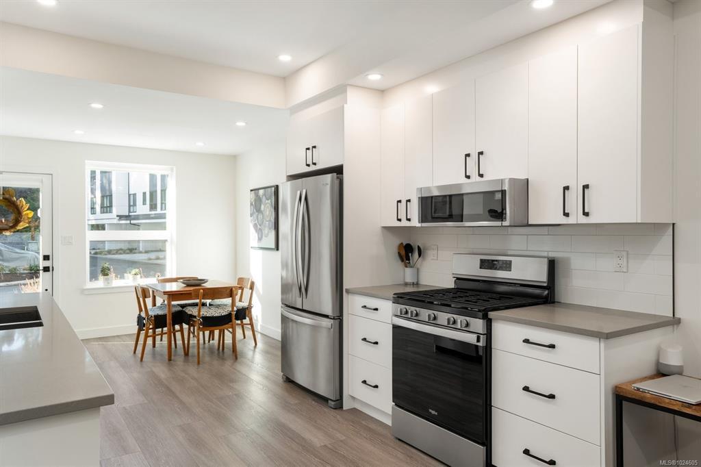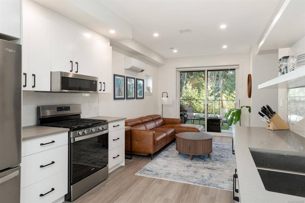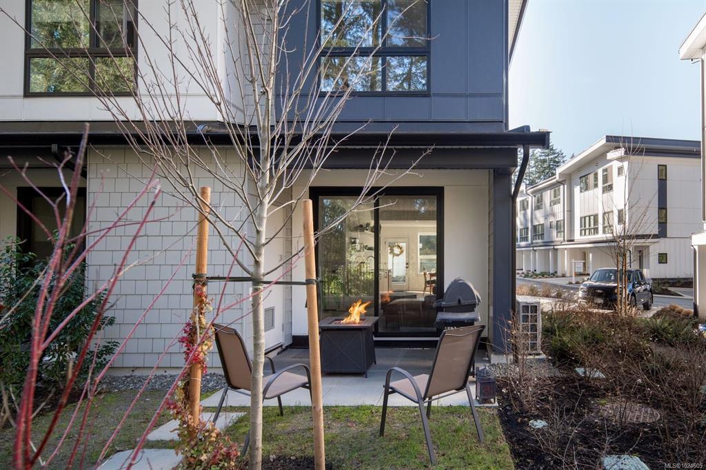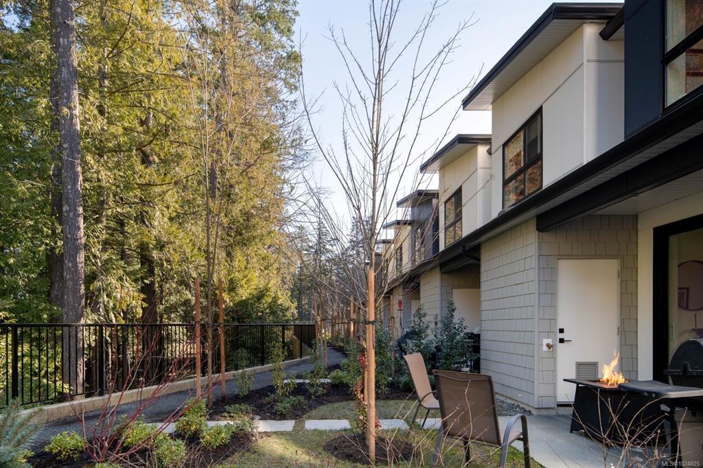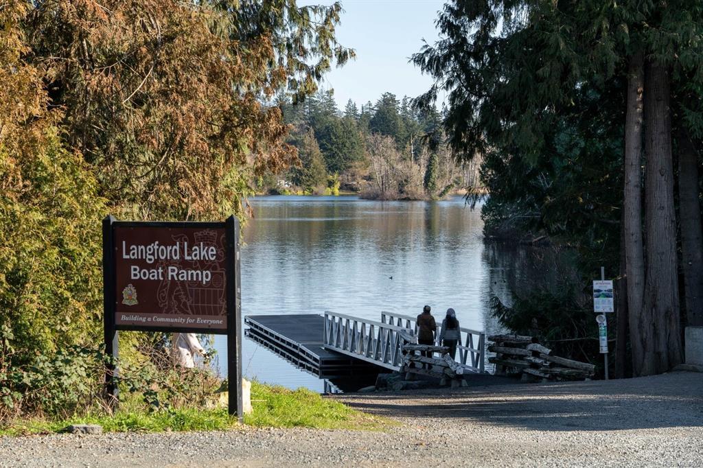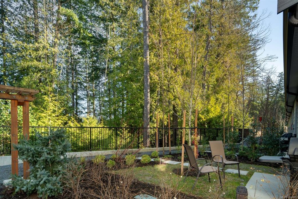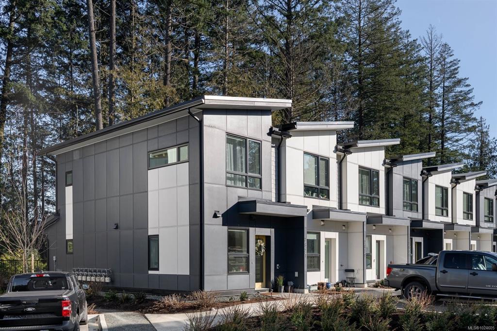 Tucked at the end of a quiet cul-de-sac, this 2024-built corner unit townhouse offers rare privacy, backing directly onto green space and Langford Lake. Extra windows flood the open-concept layout with natural light, creating a bright, welcoming space for everyday living and entertaining. The well-designed 2 bedroom, 2 bathroom plan is ideal for first-time buyers or those seeking a condo alternative without shared hallways or elevators. Step outside to a deep, private patio surrounded by nature—perfect for relaxing or entertaining. Two parking spaces, an attached storage shed for bikes and paddle boards, and trails and lake access at your doorstep support an active lifestyle. Remaining New Home Warranty, heat pumps, and on-demand hot water provide comfort and efficiency. Why buy a condo when you can own a townhouse immersed in nature?