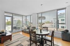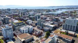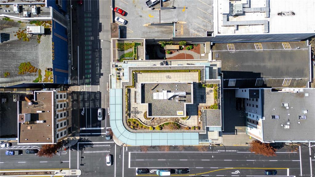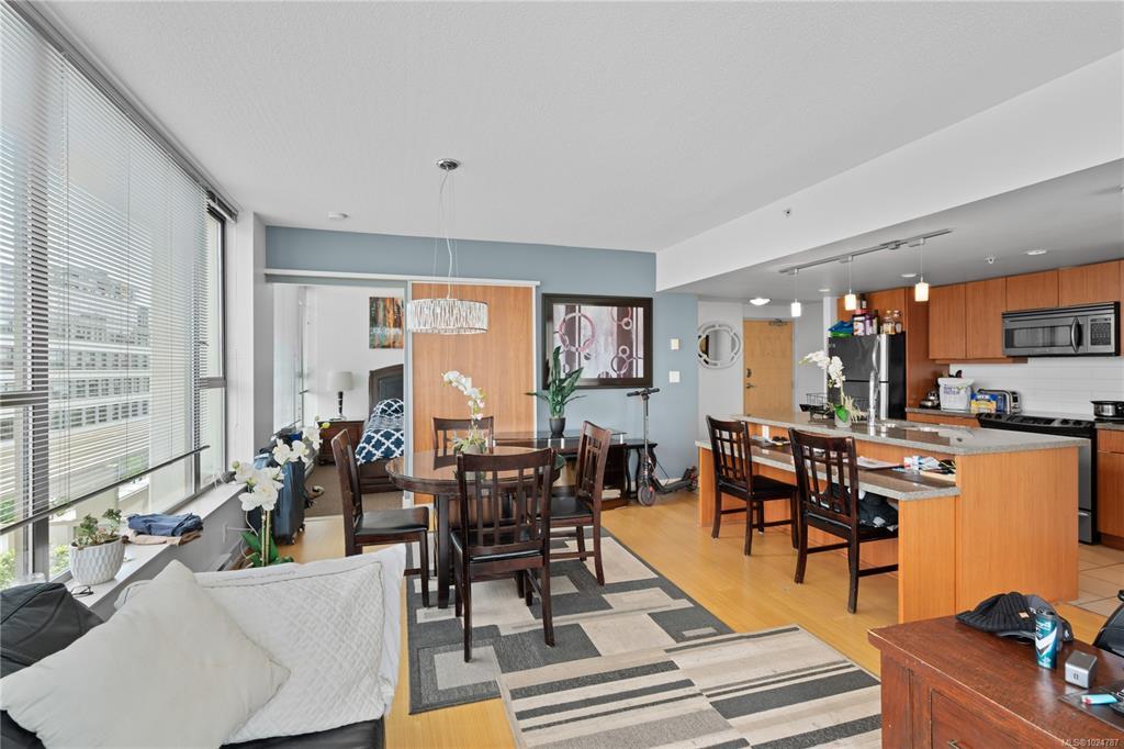 Welcome to a bright 2-bed, 1-bath condo in The Juliet, a sought-after steel and concrete building in the heart of Victoria. The floor-to-ceiling windows offer sweeping views of the city, which fill the space with natural light. The modern kitchen features ss appliances, quartz counters, a bi-level island with breakfast bar, and sleek bamboo flooring throughout. The primary bedroom includes its own access to the 4-piece bathroom. Step out onto your covered balcony, perfect for enjoying your morning coffee. This unit also features in-suite laundry, 1 secure parking stall, & bike storage. This building includes an expansive rooftop terrace, complete with a zen garden and bbq area, that wraps around the entire building showcasing 360° views of Victoria. Located steps from cafes, restaurants, shops, and everything downtown Victoria has to offer. Including an onsite caretaker and pet-friendly policies, this condo blends modern comfort with an unbeatable location.