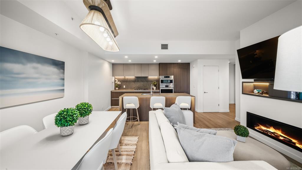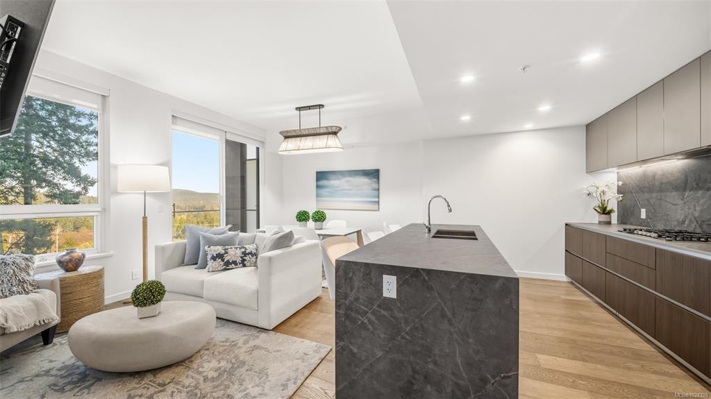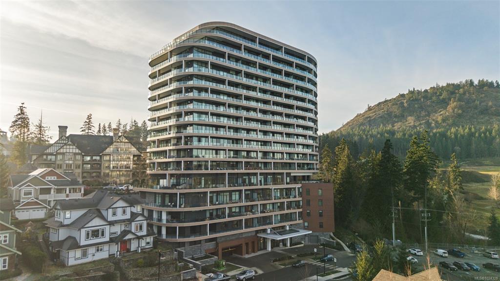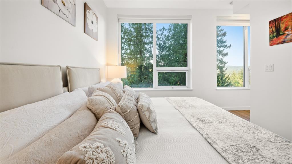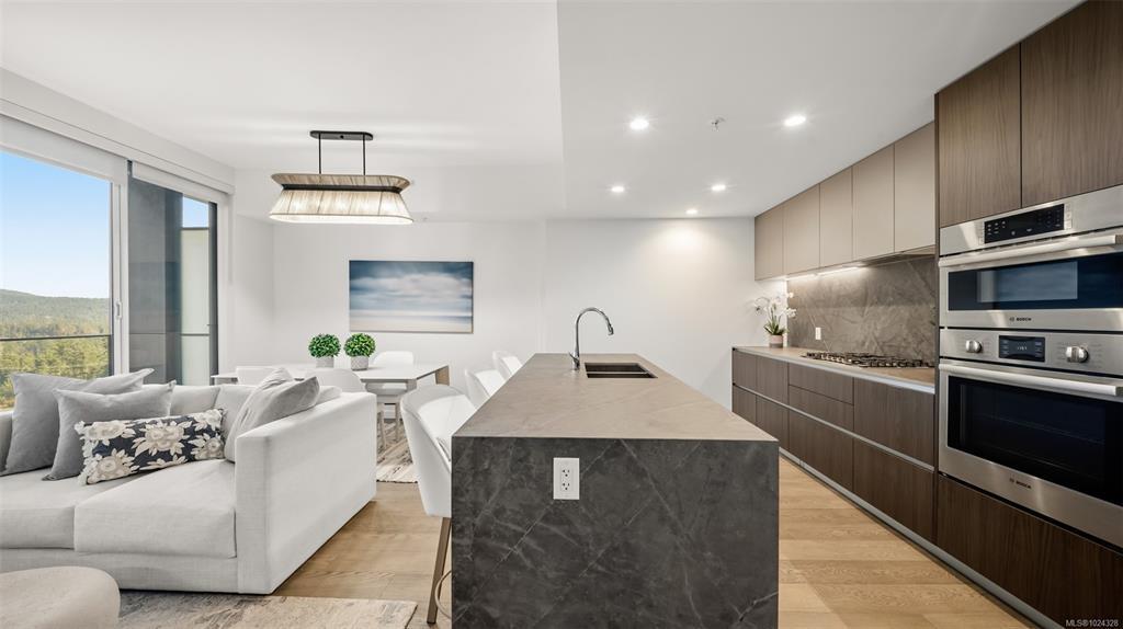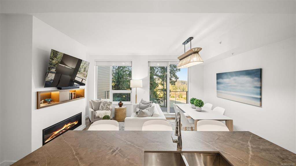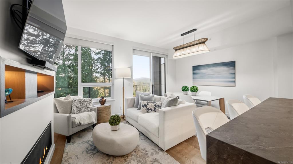 Elegant suite at One Bear Mountain offers tranquil living with solid concrete construction and a bright, thoughtfully designed layout. This elegant 2 bed, 2 bath home spans approximately 1,105 sq ft with high ceilings, expansive windows, a cozy gas fireplace, and a spacious balcony with peaceful mountain & forest views. The open-concept kitchen features premium cabinetry, quartz countertops, and quality integrated appliances, flowing seamlessly into the living and dining areas. The primary bedroom includes a walk-in closet and ensuite, while the second bedroom is ideal for guests or a home office. Enjoy in-suite laundry, A/C, a Level 2 EV charger in your parking stall, and TWO storage lockers. Resort-style amenities include fitness centre, yoga studio, outdoor pool, sky lounge (up to 100 guests) and business centre - each with WiFi access - with TVs in the sky lounge, business centre & yoga studio, plus pet and car wash stations and nearby golf, dining & trails.