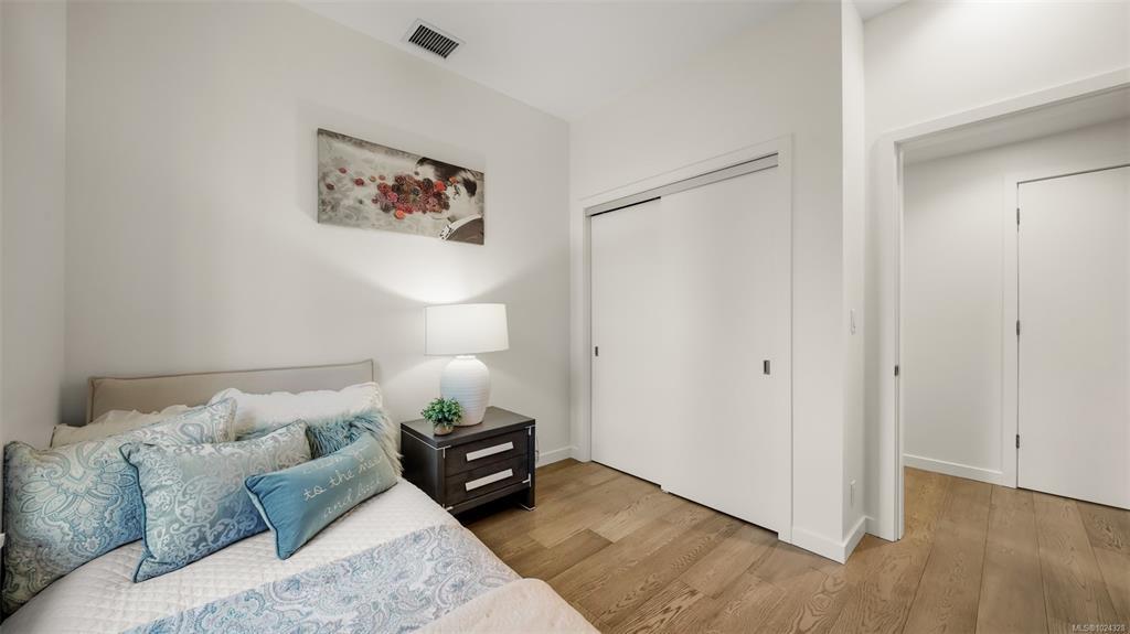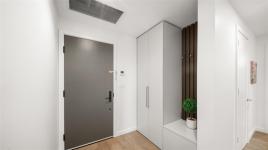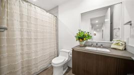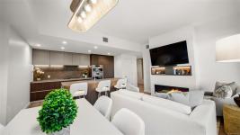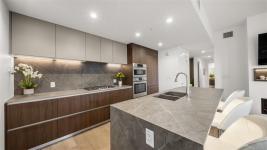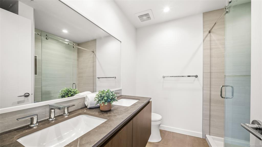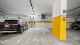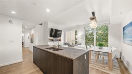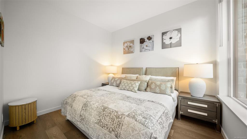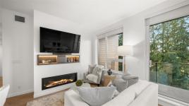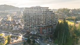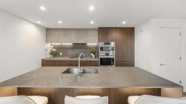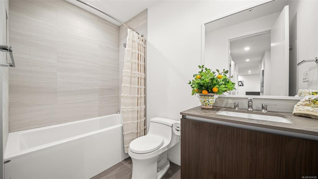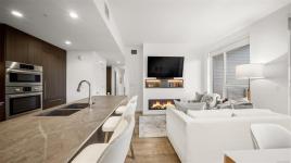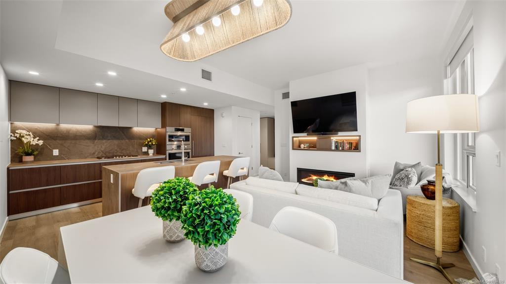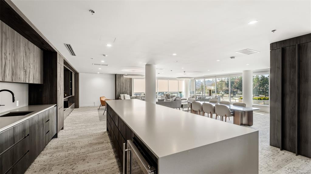 Elegant suite at One Bear Mountain offers tranquil living with solid concrete construction and a bright, thoughtfully designed layout. This elegant 2 bed, 2 bath home spans approximately 1,105 sq ft with high ceilings, expansive windows, a cozy gas fireplace, and a spacious balcony with peaceful mountain & forest views. The open-concept kitchen features premium cabinetry, quartz countertops, and quality integrated appliances, flowing seamlessly into the living and dining areas. The primary bedroom includes a walk-in closet and ensuite, while the second bedroom is ideal for guests or a home office. Enjoy in-suite laundry, A/C, a Level 2 EV charger in your parking stall, and TWO storage lockers. Resort-style amenities include fitness centre, yoga studio, outdoor pool, sky lounge (up to 100 guests) and business centre - each with WiFi access - with TVs in the sky lounge, business centre & yoga studio, plus pet and car wash stations and nearby golf, dining & trails.