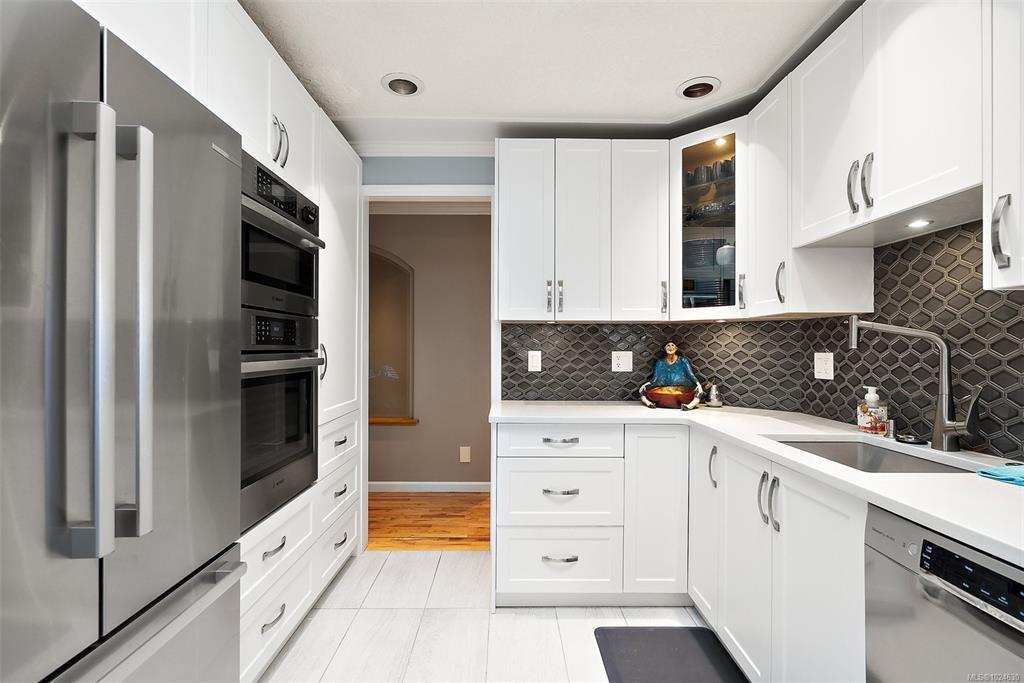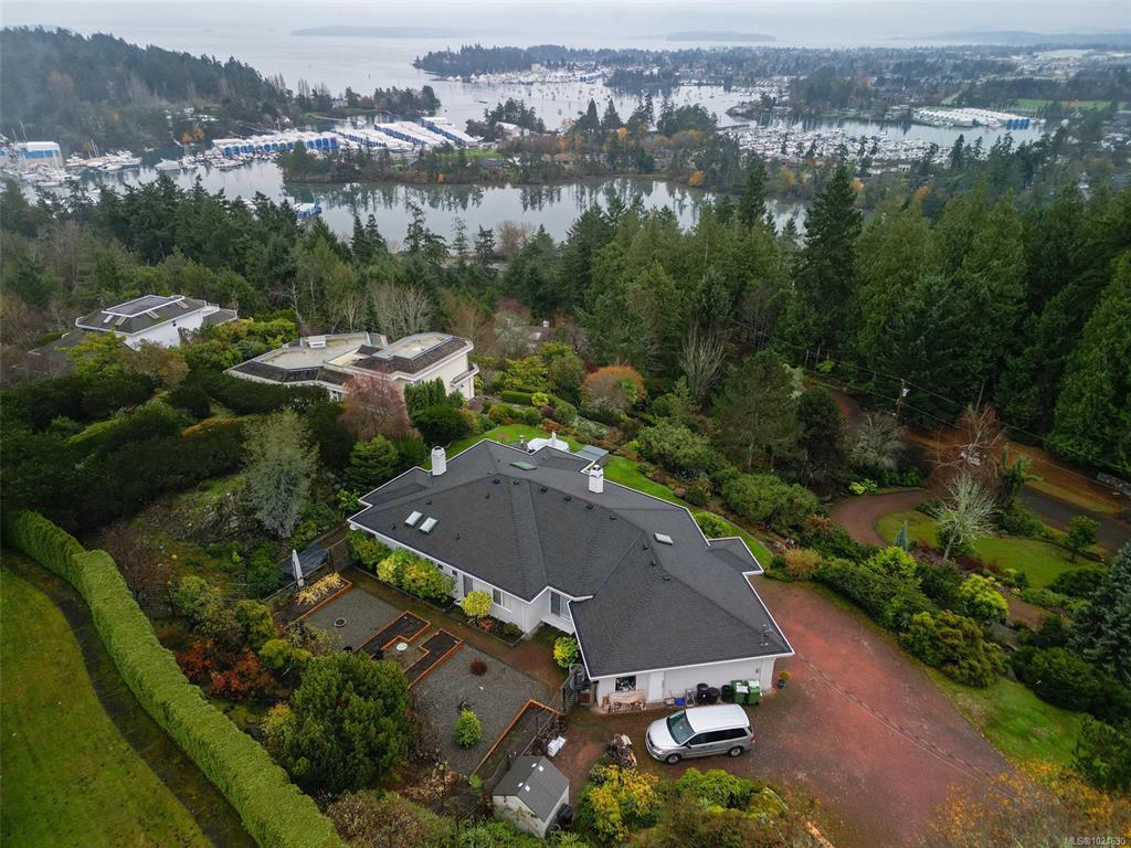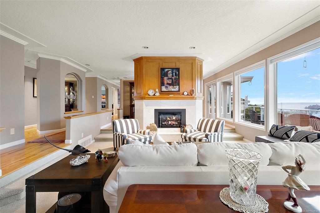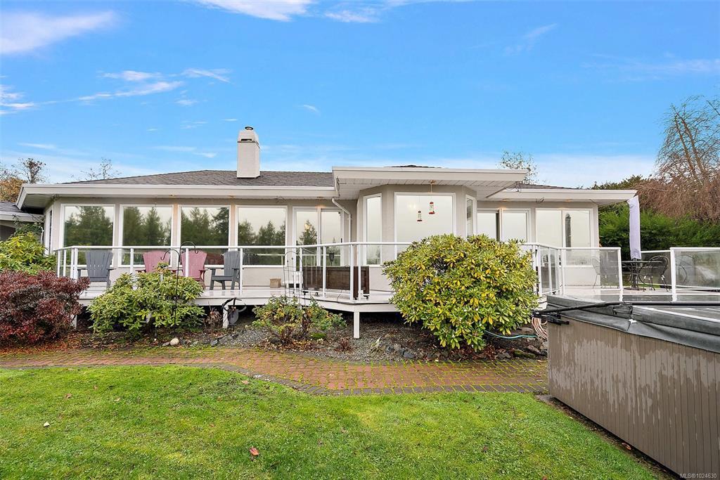 .Stunning ocean, island views! This elegant 3BD/2BA California-style rancher sits on a private, landscaped acre with panoramic vistas from all main rooms. Enjoy a renovated chef’s kitchen with built-ins, granite counters, eating bar, and a bright view-filled breakfast area. Spacious living, dining & family rooms—each with a fireplace—offer effortless comfort and entertaining. Updates include exterior paint, reinforced pressure-treated decking, new garden boxes, remote-control shades, four premium LED fixtures, and a new thermostat for the Trane heat pump. Outdoor perks: hot tub, fire table, two sheds, patio-stone rock garden, stone walkway, and expanded views from the deck. The serene primary suite features a private patio and spa-inspired bath. A full laundry room and double garage with workshop complete the home. Surrounded by nature trails yet minutes to ferry, airport, marinas, beaches & Sidney, and under 30 minutes to Victoria. Impeccably maintained—move-in ready!