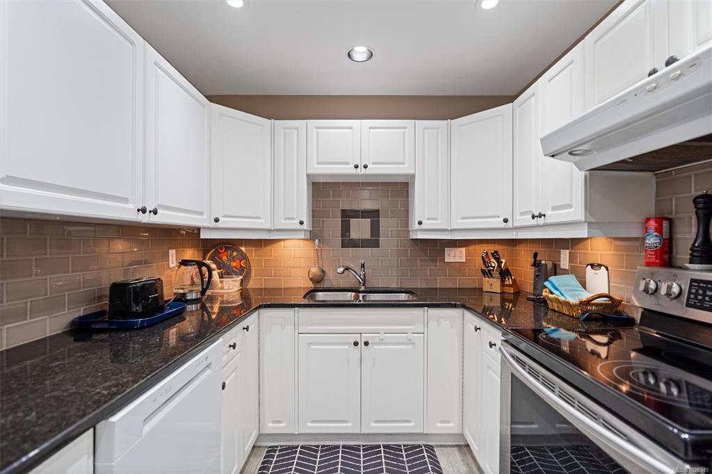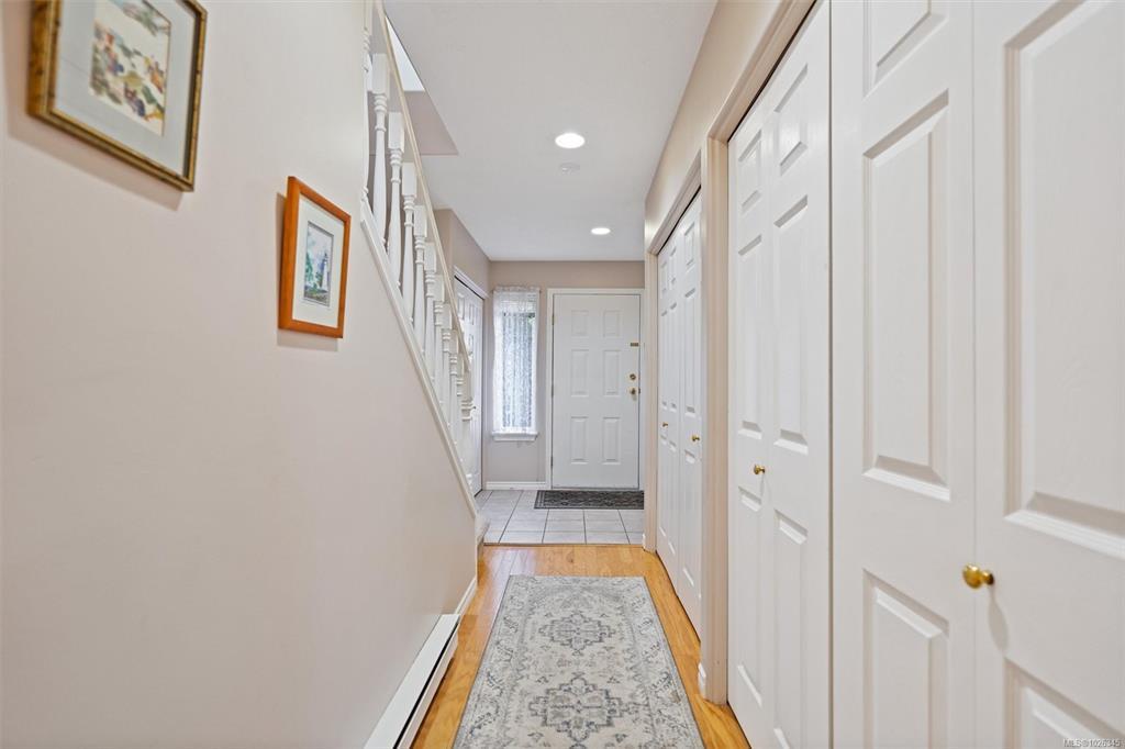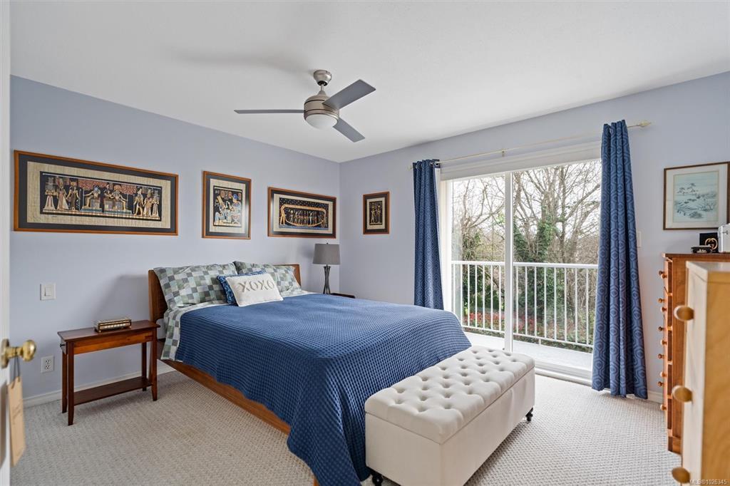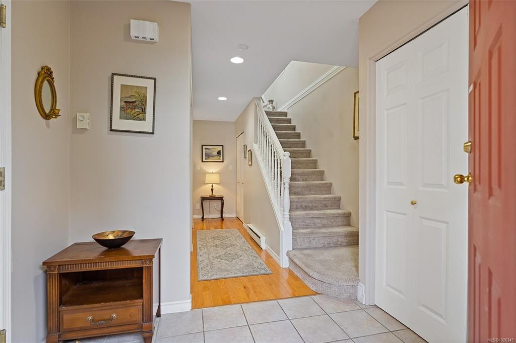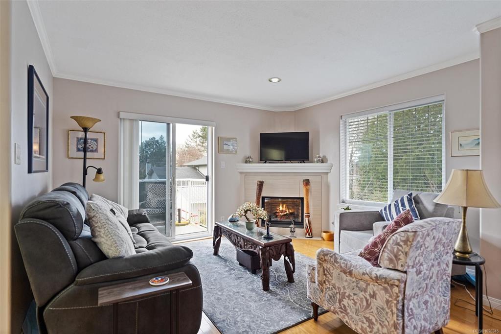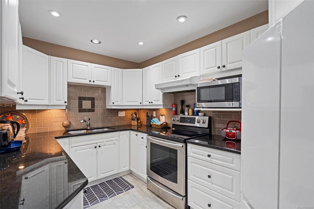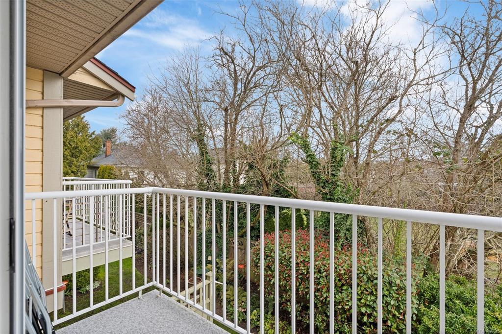 Turnkey 3 bed, 3 bath end-unit townhome in a quiet, well-kept complex of only 7 homes, ideally located near Hillside Shopping Centre, Royal Jubilee Hospital, Cedar Hill Rec Centre & Golf Course, plus convenient transit to University of Victoria and Camosun College. Easy access to downtown and Oak Bay for shopping and beaches. The entry level offers a spacious hallway with great storage, access to the single garage, a 4-piece bath, two bedrooms, and a large private patio surrounded by lush greenery. Upstairs features a bright open living/dining area with wood floors, gas fireplace, sunny south-facing deck, and updated kitchen with stone counters, tiled backsplash, and under-mount lighting. The generous primary bedroom includes its own balcony and beautifully renovated ensuite with walk-in shower. This home has been lovingly maintained, offering privacy, light, and comfort in a central location. New roof (2025), Dishwasher (2025), Refrigerator (2023).