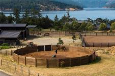 Roundstone Estate – A one-of-a-kind luxury equestrian estate by the sea. Set on 13.44 acres, including 236 feet of pristine waterfront near Brentwood Bay on Southern Vancouver Island, this rare offering blends modern architecture with pastoral beauty. Re-imagined in 2010 and extensively renovated in 2024, the stunning residence showcases steel beams, cedar cladding, Loewen glass, soaring ceilings, and a chef’s kitchen with Wolf, Sub-Zero and Miele appliances. Rdiant in-floor heating, five-zone cooling, and backup generator ensure comfort. Equestrian facilities include a stylish 72’ x 36’ stable built in 2018 with six stalls, heated tack rooms, wash bay, riding ring, and multiple fenced paddocks and pastures. A 180-mixed-fruit tree orchard, abundant irrigation, and Hagen Creek water rights ensure sustainable living. An oceanfront sanctuary designed for elegance and equestrian pursuits a short drive from Victoria International Airport, Swartz Bay ferry terminal and the city of Victoria.
