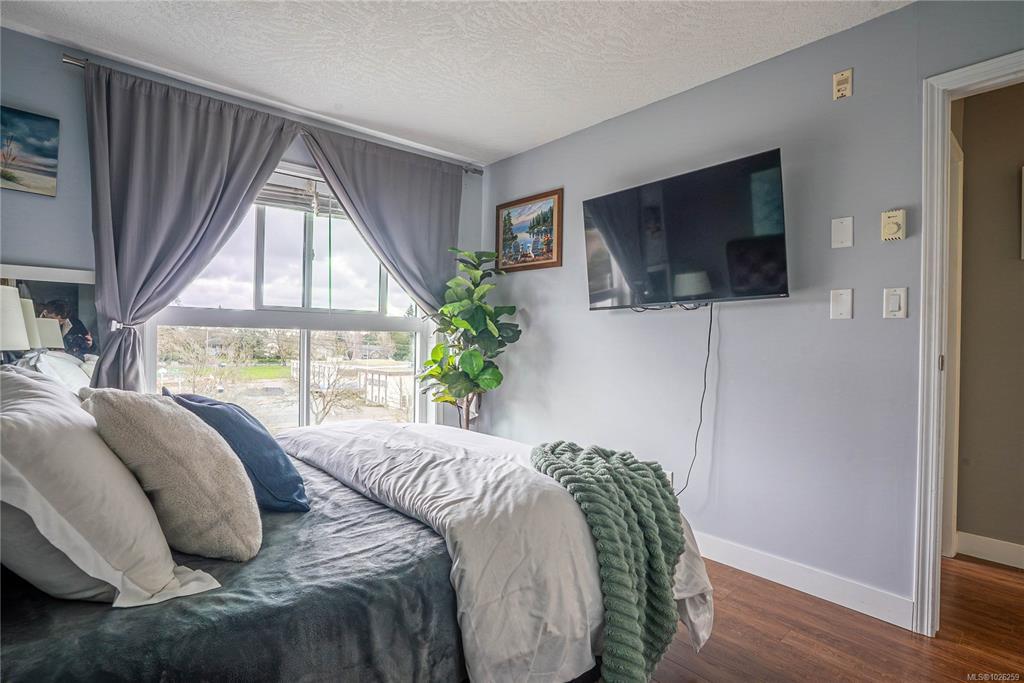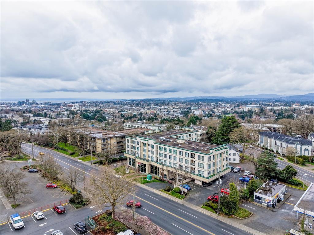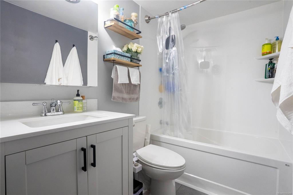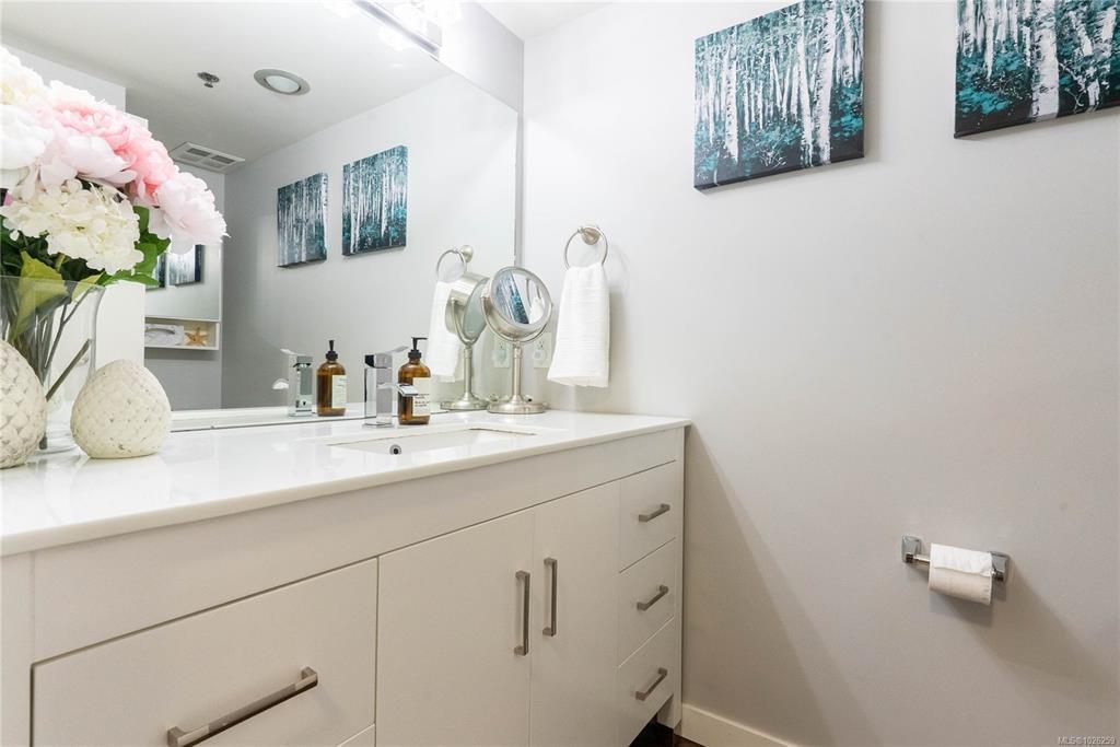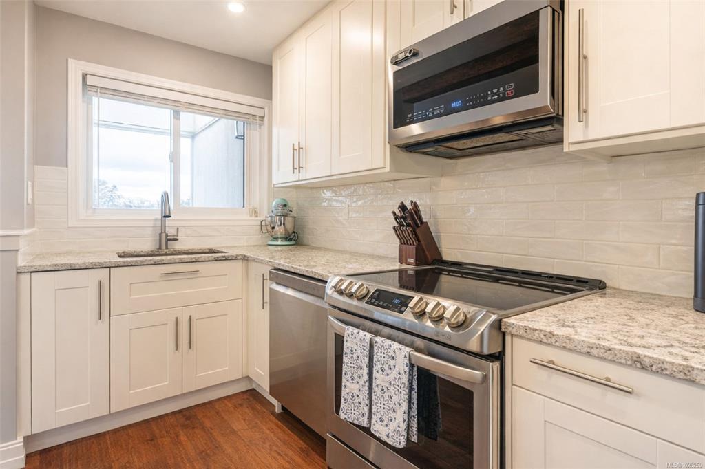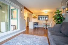 Beautifully updated 2-bedroom, 2-bathroom condo offering 723 sq. ft. of bright, functional living in a central location. Ideal for first-time buyers, young families, downsizers, or investors. The open-concept living and dining area features large windows, warm flooring, and access to a covered balcony—perfect for morning coffee or relaxing outdoors. The modern kitchen showcases white shaker cabinets, stainless steel appliances, quartz countertops, tile backsplash, and an island with seating. The primary bedroom includes ample closet space and a private ensuite, while the second bedroom suits guests, a home office, or nursery. A main bath, Miele washer and dryer, added storage, and a welcoming entry complete the home. Close to Uptown, downtown Victoria, parks, schools, and transit—move-in ready and exceptional value.