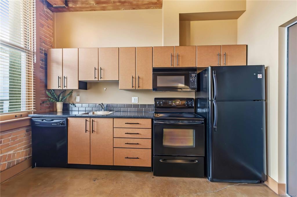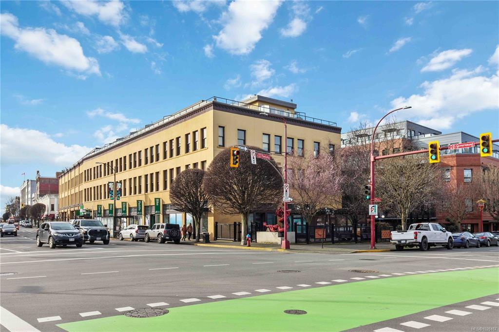 O/H Saturday, 12-2! Own a piece of Victoria’s history. Bright, airy, and full of character in the heart of downtown - welcome to The Vogue. Originally built in 1892 and restored in 2006, The Vogue seamlessly blends period charm with timeless urban living in Old Town. This pristine, beautifully maintained condo showcases 11-foot ceilings, exposed brick, fir beams, and oversized east-facing windows that flood the home with morning light. Polished concrete floors, a cozy fireplace, and an open kitchen create a warm and inviting atmosphere. In-suite laundry, separate storage, and access to the shared rooftop deck complete the package. Situated within Victoria’s Old Town District zoning, offering flexibility for home occupation or potential live/work possibilities - buyer to verify permitted uses. Just steps to cafés, Market Square, the Inner Harbour, and the oceanfront - exceptional downtown living in one of Victoria’s most iconic buildings.