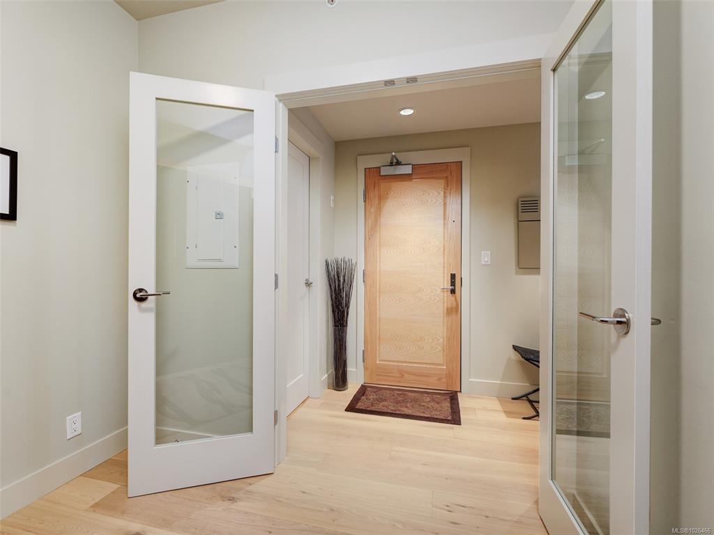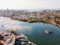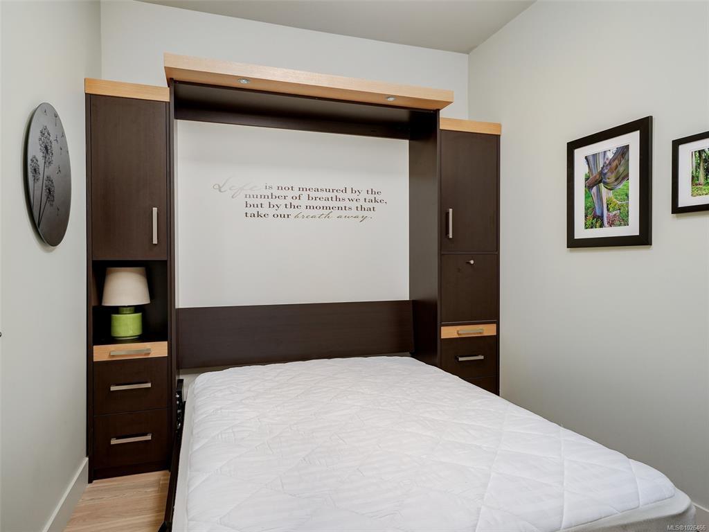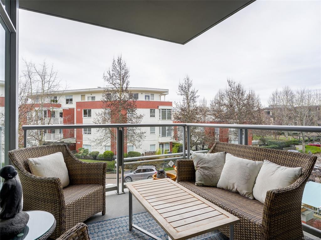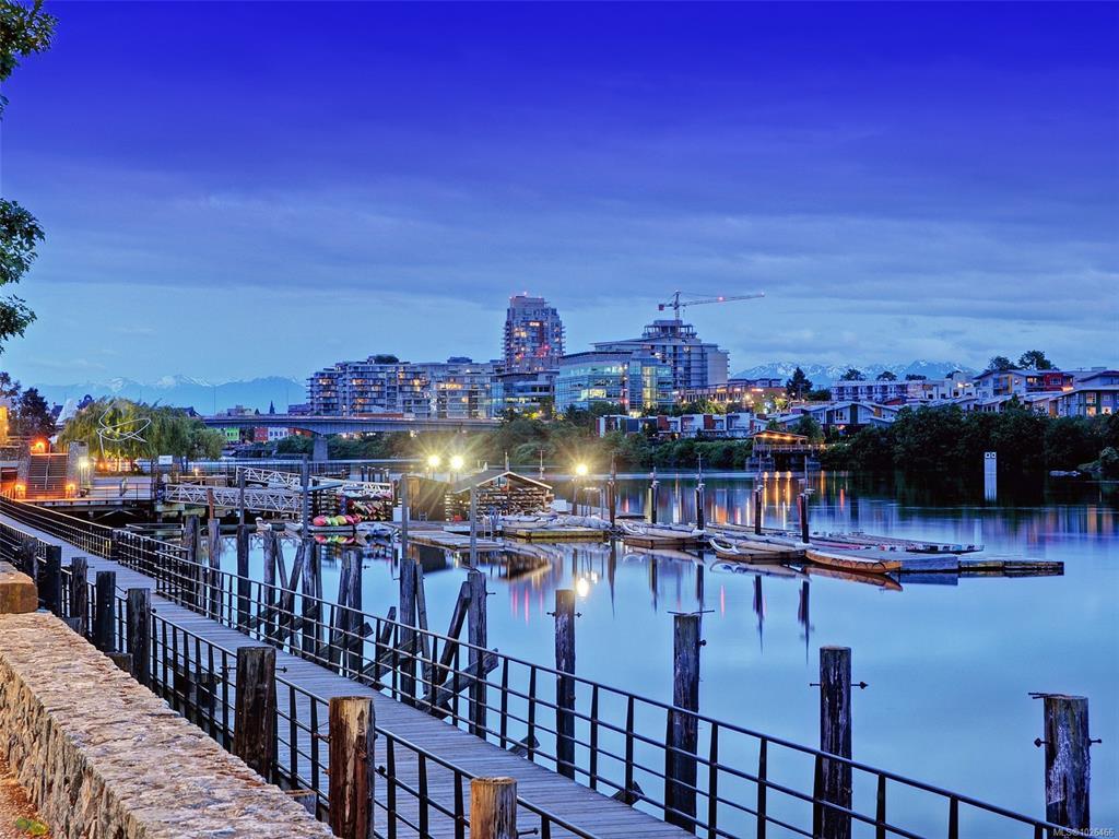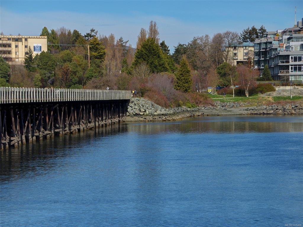 WELCOME TO 365 WATERFRONT! This award winning steel and concrete building was built by Concert Properties in the desirable Selkirk Waterfront. The building showcases stunning architecture, a graciously appointed lobby, & generous hallways decorated with art. Inside the 857 sqft 1 bedroom plus den you get; 2 bathrooms including 5 piece ensuite with soaker tub & shower, tile & warm hardwood floors, a designer kitchen with oak shaker cabinets & quartz counters, stainless appliances, a gas cooktop, a generous dining/living area with views, and a den with murphy bed for guests. This pet friendly condo offers the perfect blend of style and function. Bonus features include a large deck with room for BBQ's & entertaining, separate storage area, secure underground parking, EV charging capability, bike and kayak storage. All located just steps to the Galloping Goose Trail & Selkirk bridge, the Gorge waterway, parks, rowing, fitness, coffee, dining, & 5 minutes to beautiful downtown Victoria.