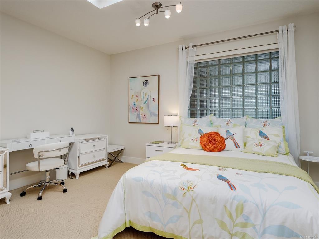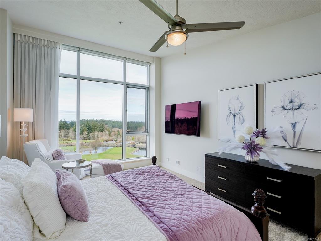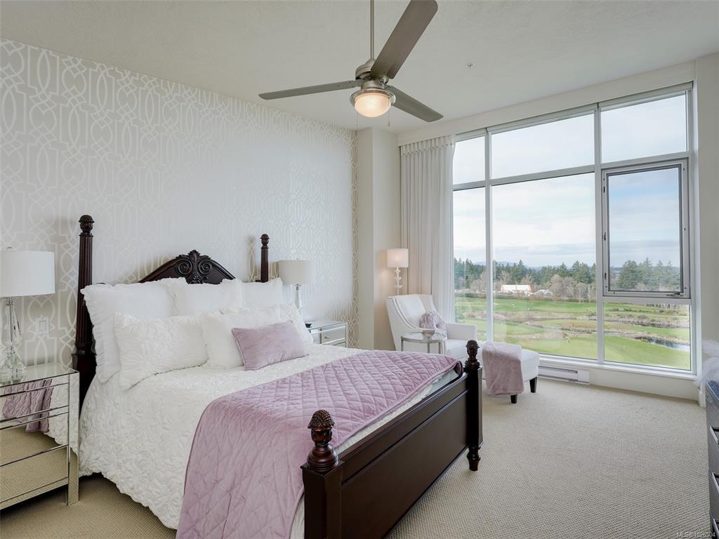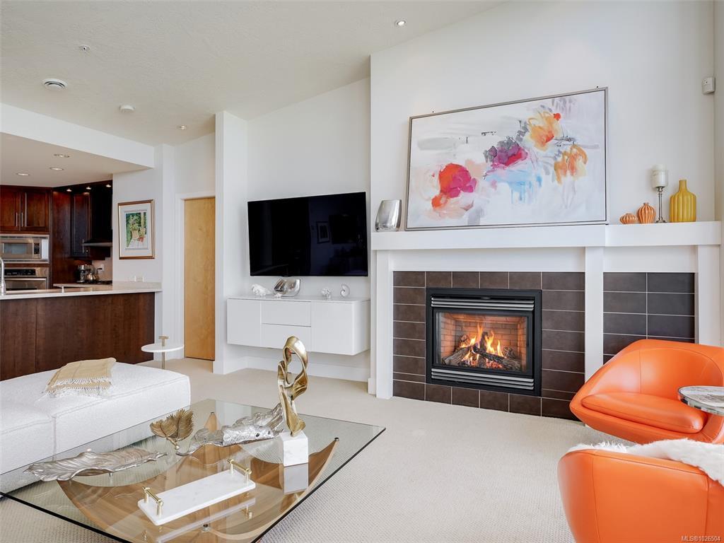 Perched high above Cordova Bay, this refined penthouse showcases sweeping panoramic views over Cordova Bay Golf Course, the Gulf Islands and the Salish Sea. Soaring vaulted ceilings, skylights and floor-to-ceiling windows fill the home with natural light, creating an airy living experience. The elegant living room with gas fireplace flows into a beautifully appointed kitchen with quartz countertops, cherry cabinetry, cork flooring and stainless steel appliances—and opens onto a private balcony to enjoy breathtaking, ever-changing ocean and island vistas. A generous dining area offers flexibility for conversion to a second bedroom or den. The spacious primary retreat features vaulted ceilings, walk-through closets and a spa-inspired ensuite. A large laundry room, two secure parking stalls and pet-friendly living complete the package. Just moments to Mattick's Farm, the Lochside Trail, sandy beaches, golf and everyday amenities—an exceptional opportunity to embrace luxury coastal living.