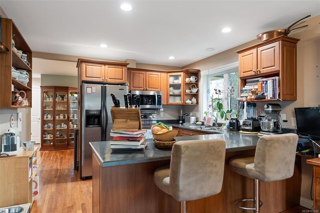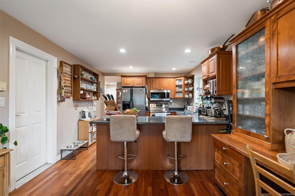 Amazing location steps from the ocean, parks, marinas, and downtown Sidney. Tucked away on a private lot, this backside of a front/back duplex lives like a single family home. Flexible floor plan features primary bedrooms on main and upper floors with private ensuites and walk in closets for both. Additional luxuries include separate dining and breakfast spaces, living room with bay window, upstairs laundry, and attached garage. Large private out door space has west and south exposures, great for gardening or enjoying some peace and sunshine on the interlocking brick patio. Separate shed/workshop has over 200 square feet of extra space for projects, supplies or just extra storage. Book your private tour today and experience the best of residential Sidney.