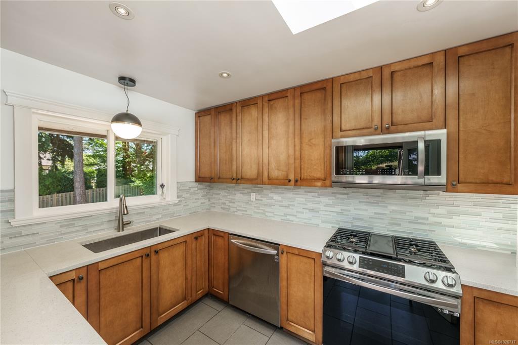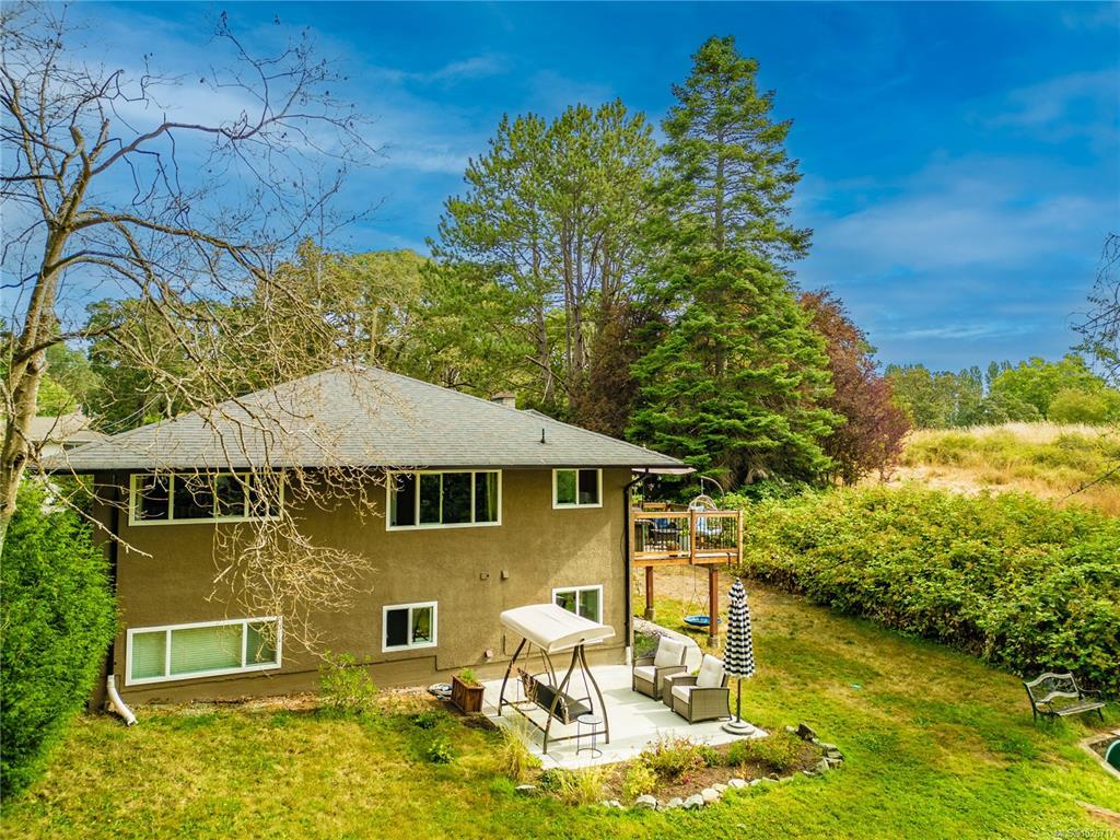 Welcome to 1299 Camrose Cres, a stylishly updated home located on a corner lot at the end of a quiet no-through street. Easily suitable, this property offers flexibility for multi-generational living or mortgage helper potential—ask your Realtor for floorplan w/ suite ideas. The south-facing back yard offers both privacy & proximity to nature, beside Cedar Hill Golf Course & Chip Trail. Main floor has 3 beds, hardwood floors, a bright living area w/ wood-burning fireplace, & renovated kitchen w/ gas stove. Downstairs the walk-out lower level offers a large family/media room, flex space, full bath & an additional bedroom—ideal for guests, recreation, or work-from-home needs. Basement is freshly renovated w/ levelled flooring, luxury vinyl plank floors, baseboards, fresh paint, & new hardware. Recent upgrades also include a new driveway & patio, 220V electrical with EV charger, modern bathrooms, & a high-efficiency gas furnace. Minutes from Downtown Victoria, UVic, schools & shopping.