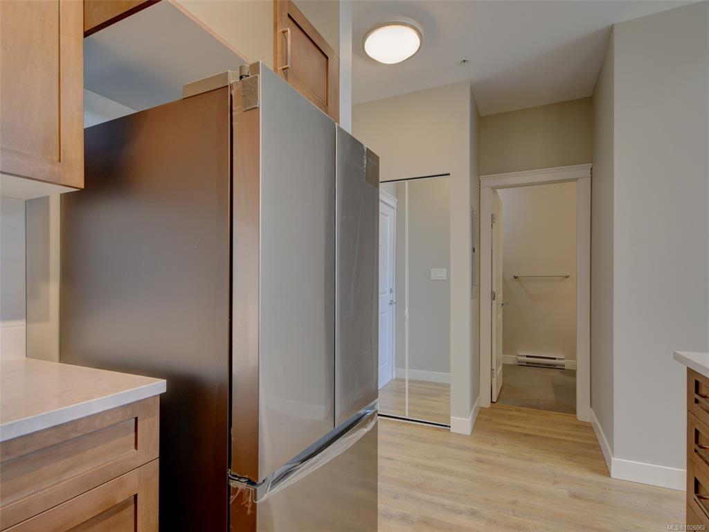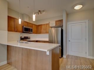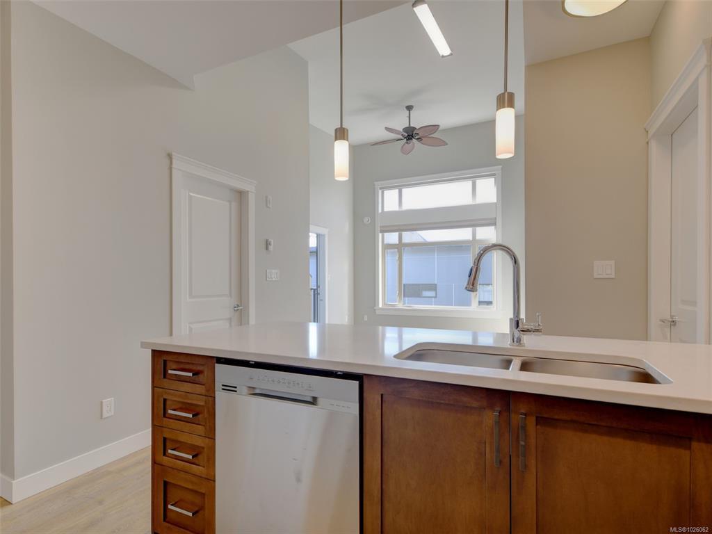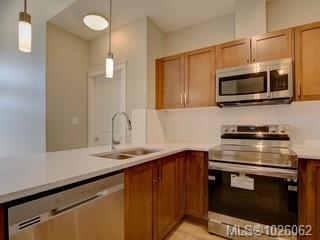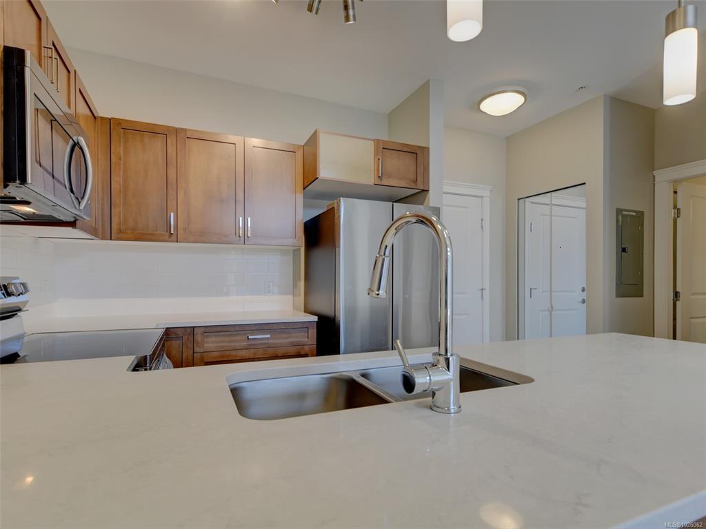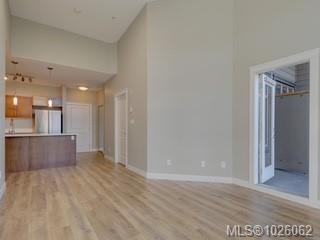 It’s all about lifestyle and convenience in this beautifully updated TOP FLOOR modern condo in the heart of Langford! The moment you enter, you will understand why this unit is special and appreciate the soaring 12 foot high vaulted ceilings. Large windows ensure abundant natural light while overlooking a peaceful green space. Stylish open plan kitchen with quartz countertops, high end appliances and an array of upgrades. Sleek new flooring. Generous sized master bedroom with walk-through closets and luxurious ensuite. Second bedroom and full bathroom. Excellent entertainment-sized balcony. Secure, covered parking stall and bike storage. Leave the car at home! This complex is ideally situated with a great walk score of 90, just steps away from the best dining, shopping, and entertainment Langford has to offer. Whether you’re a busy professional or simply seeking a vibrant urban lifestyle, this home delivers modern luxury and unmatched convenience.